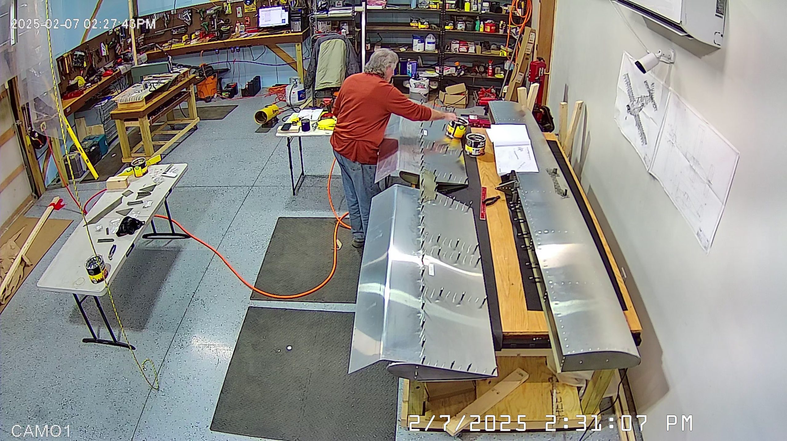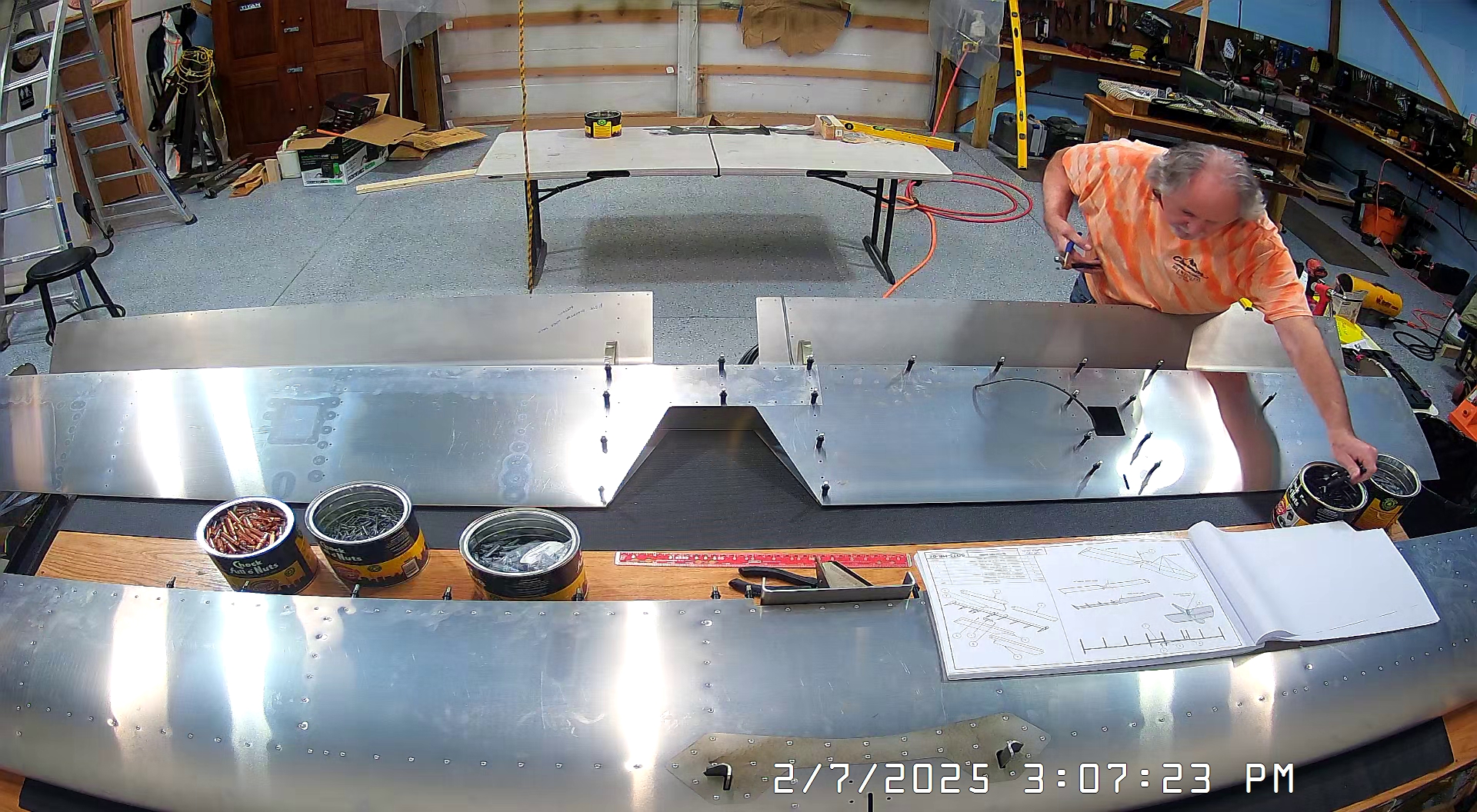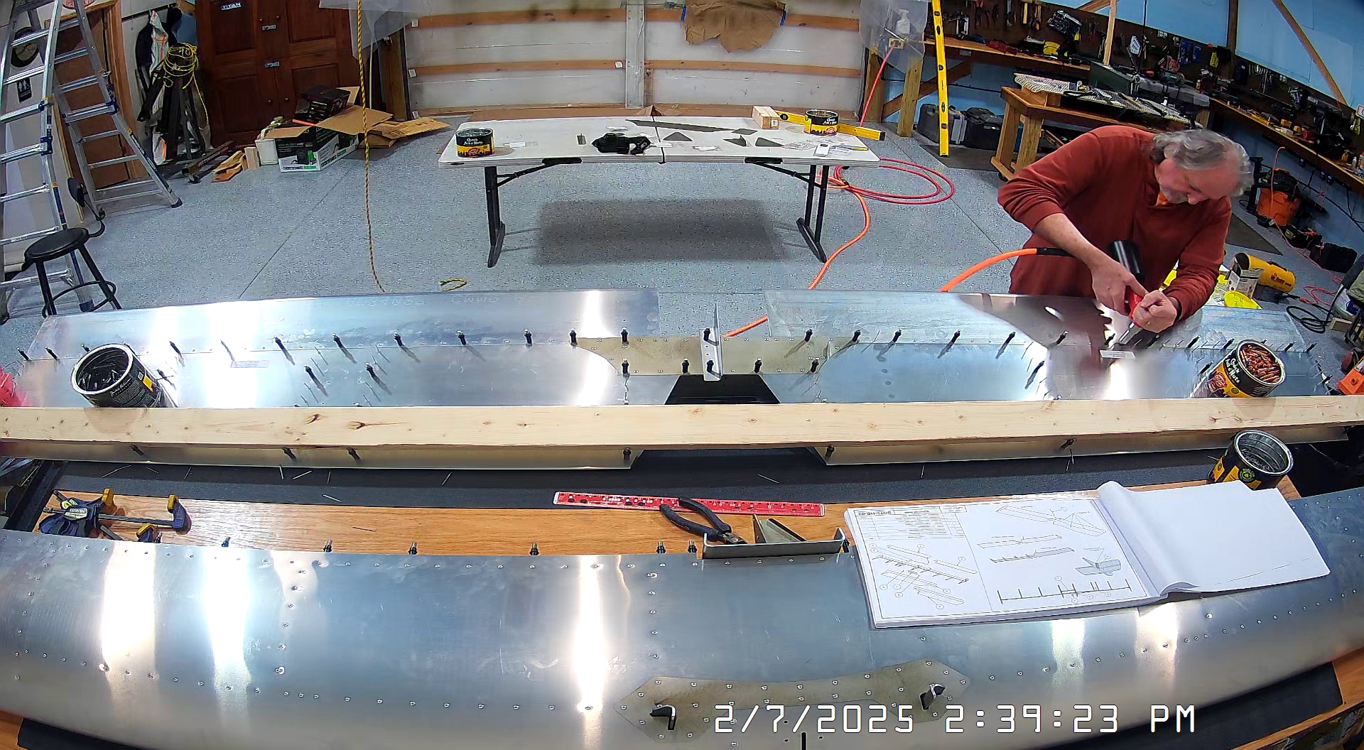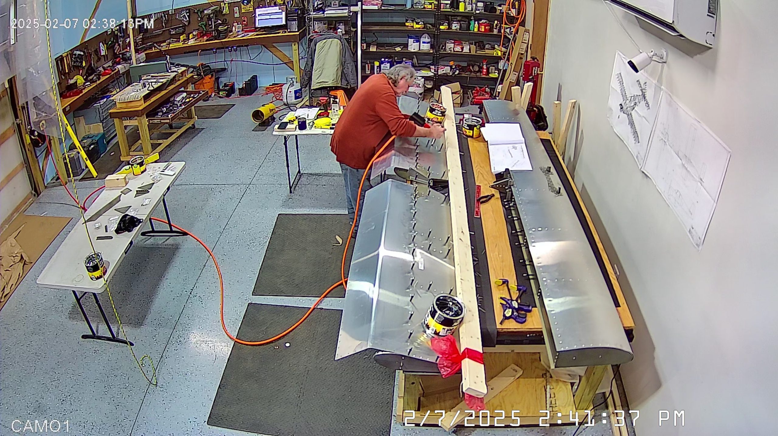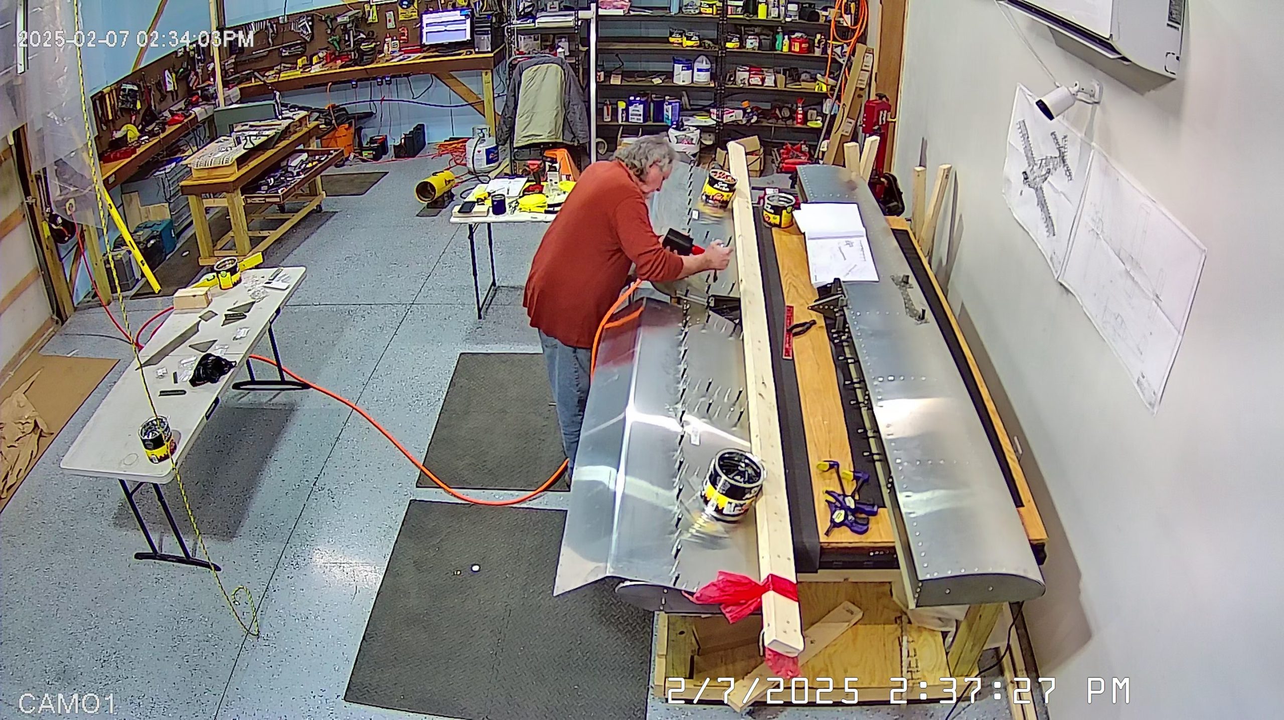 Here are some different view snapshots of the same process. You can see I used the 2×4 I used to fold the horizontal stabilizer over the ribs to make sure the elevator was flat against the bench top. That and a few cans full of clecos. I guess I could have clamped the elevator to the bench. Next time :). In any event, I think I got the elevator and the horizontal stabilizer flat.