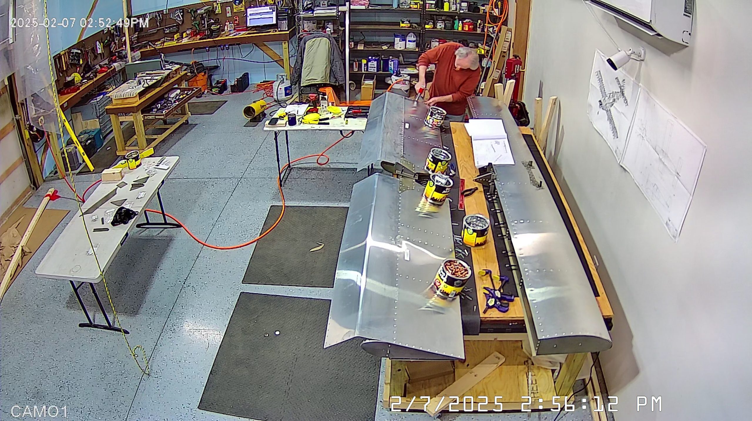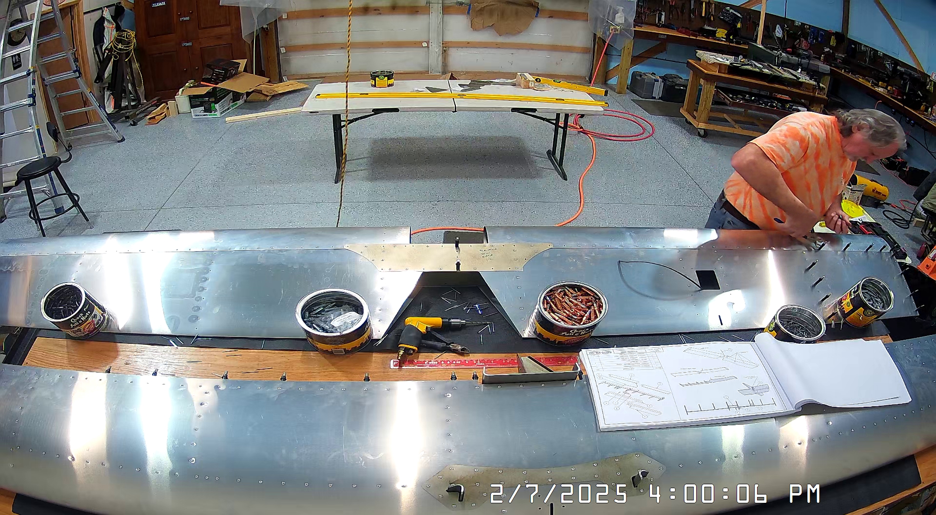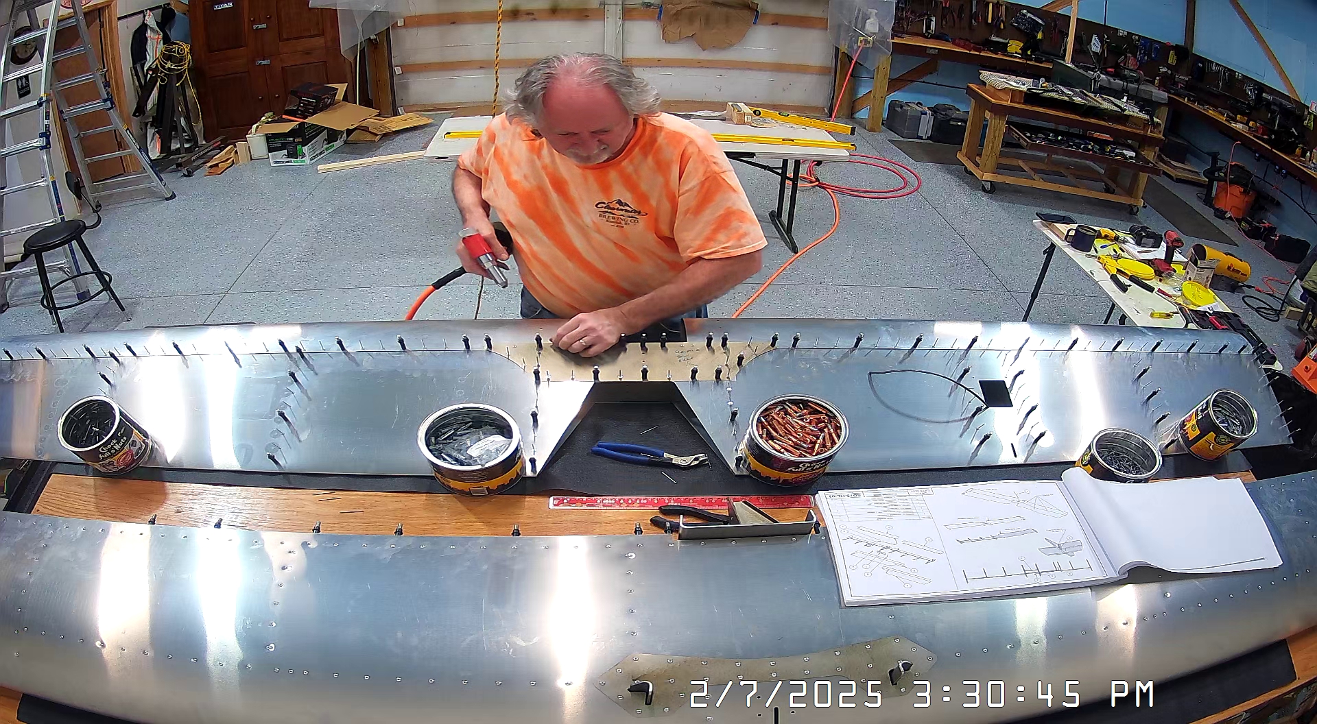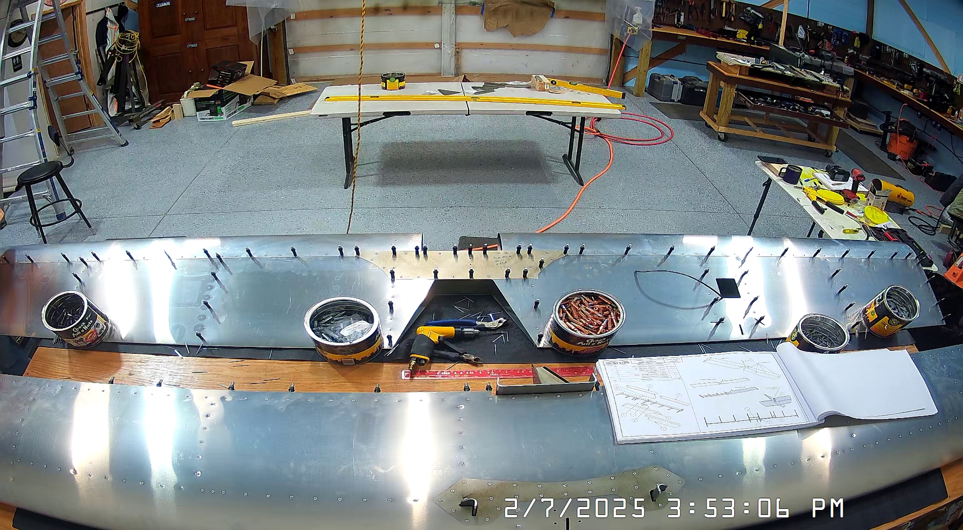 Here are some different view snapshots of the same process. You can see I used the 2×4 I used to fold the horizontal stabilizer over the ribs to make sure the elevator was flat against the bench top. That and a few cans full of clecos. I guess I could have clamped the elevator to the bench. Next time :). In any event, I think I got the elevator and the horizontal stabilizer flat.