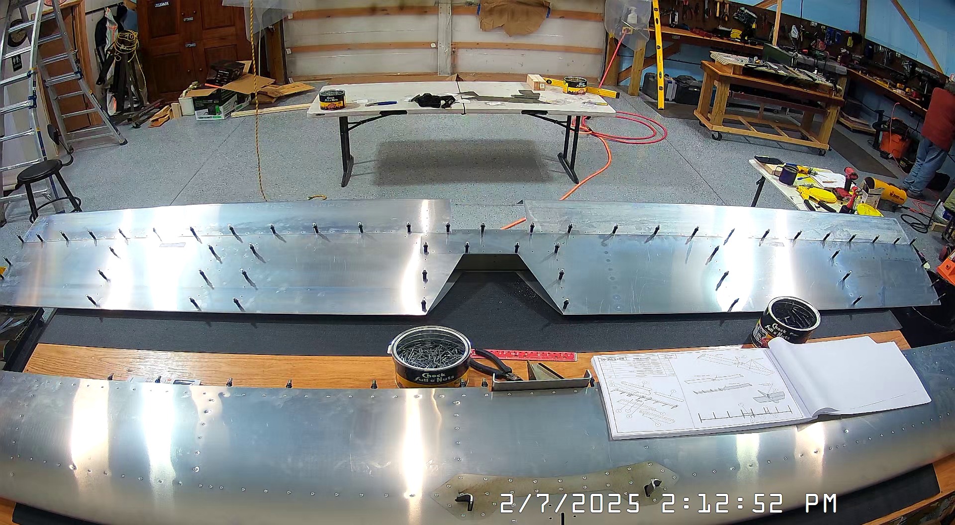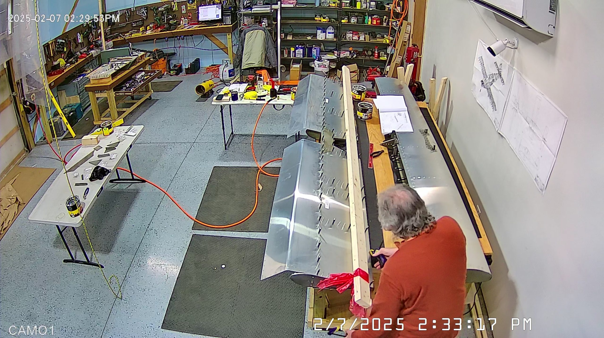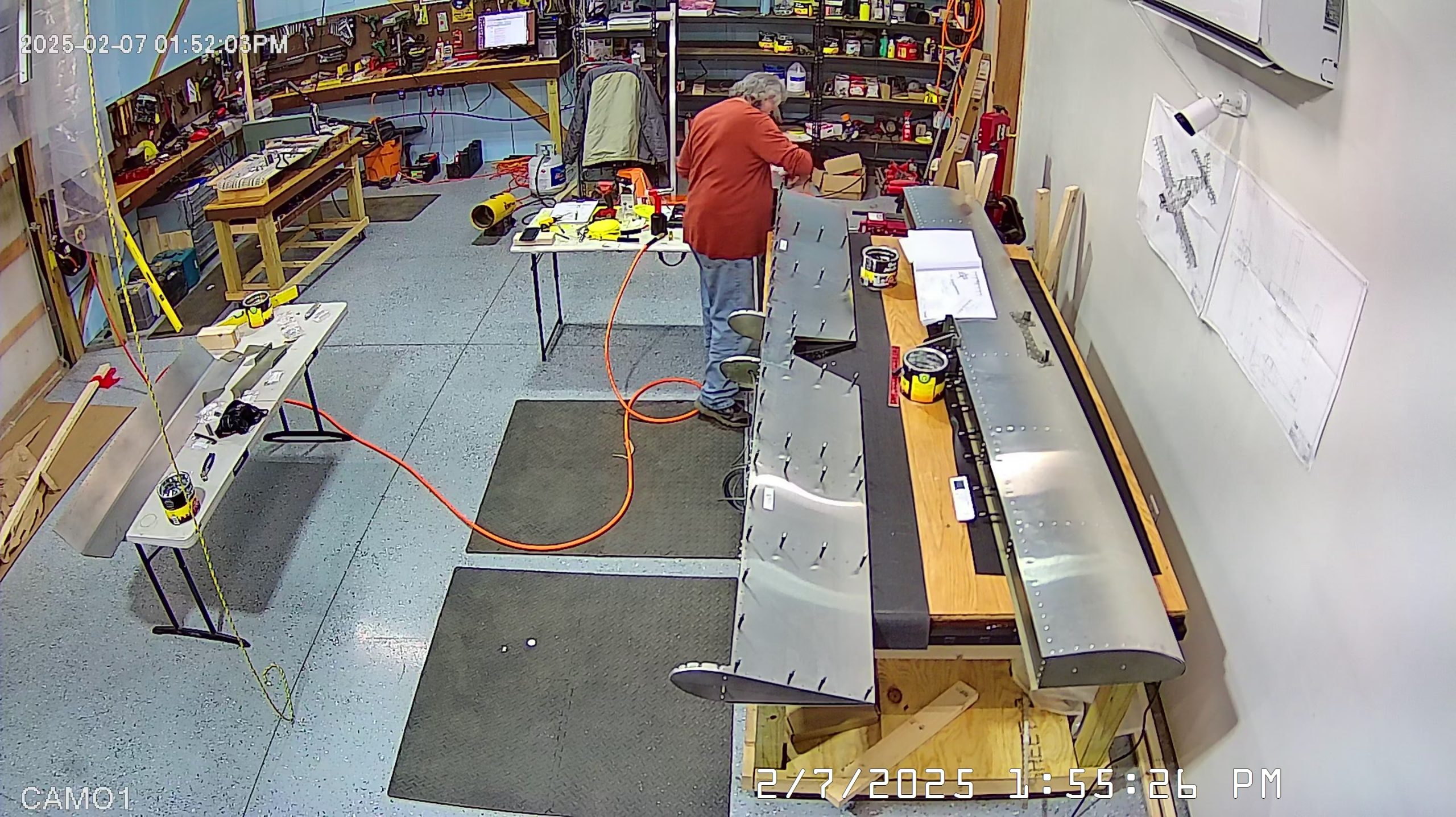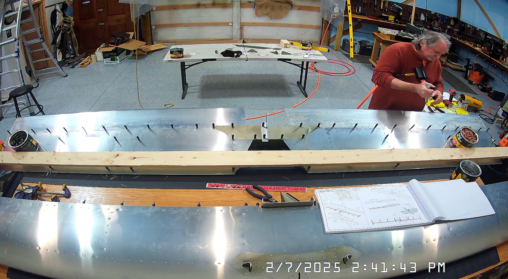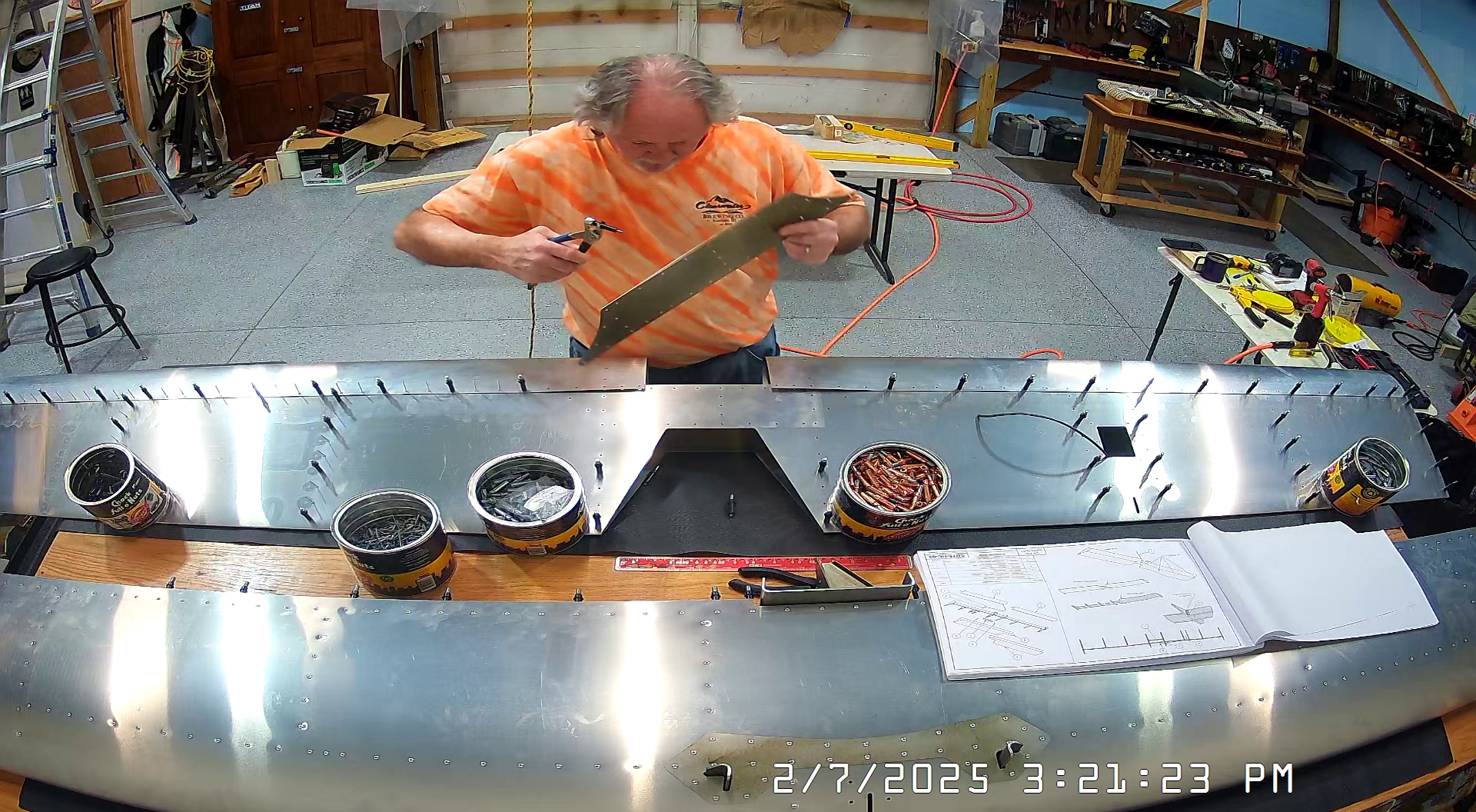 Here are some different view snapshots of the same process. You can see I used the 2×4 I used to fold the horizontal stabilizer over the ribs to make sure the elevator was flat against the bench top. That and a few cans full of clecos. I guess I could have clamped the elevator to the bench. Next time :). In any event, I think I got the elevator and the horizontal stabilizer flat.