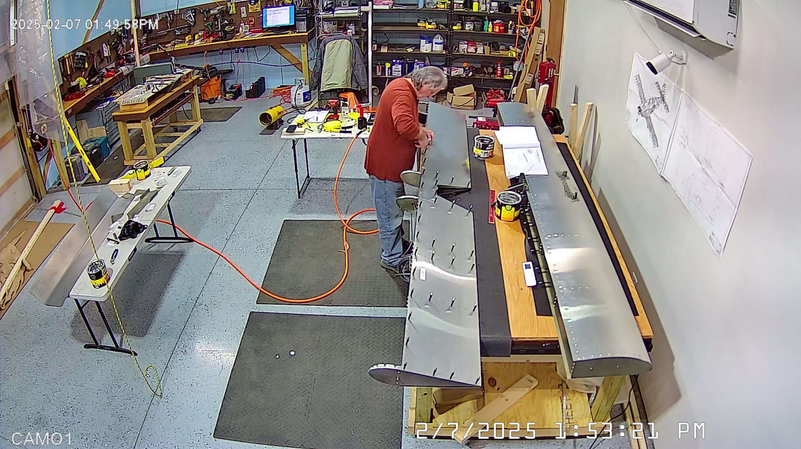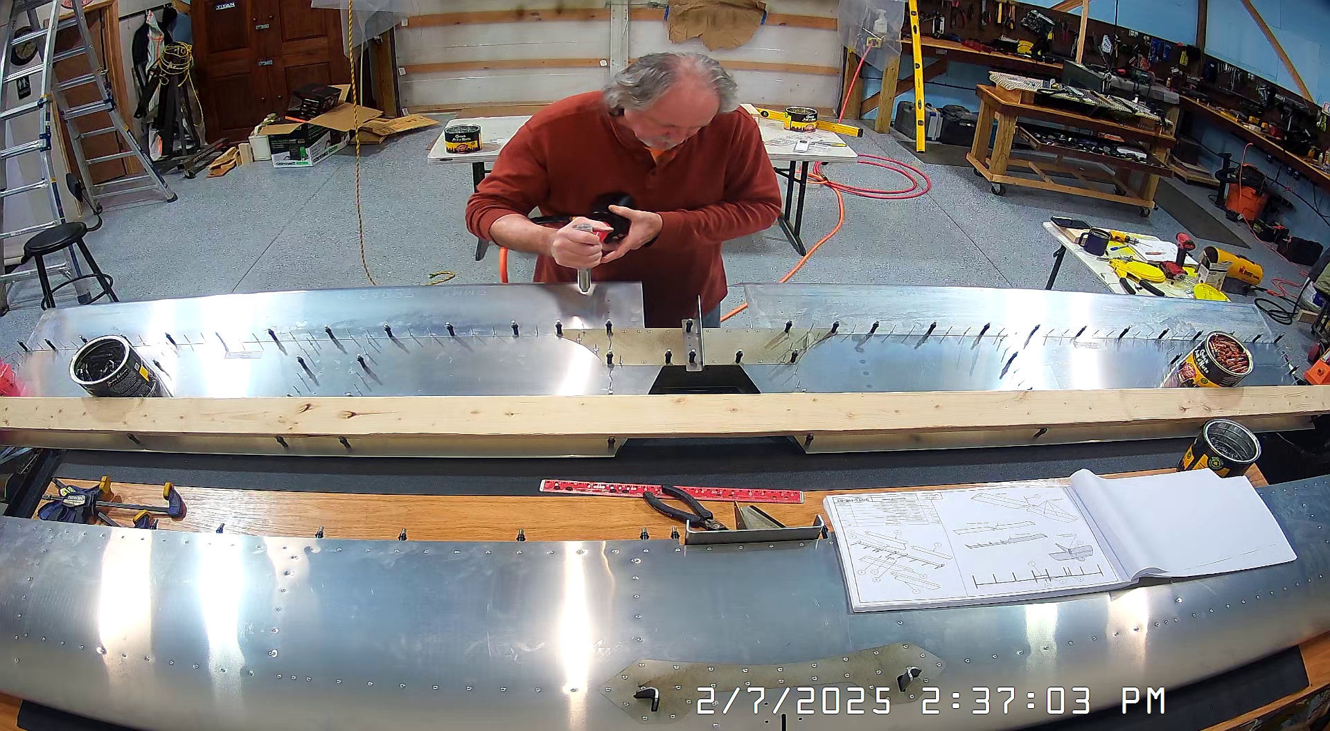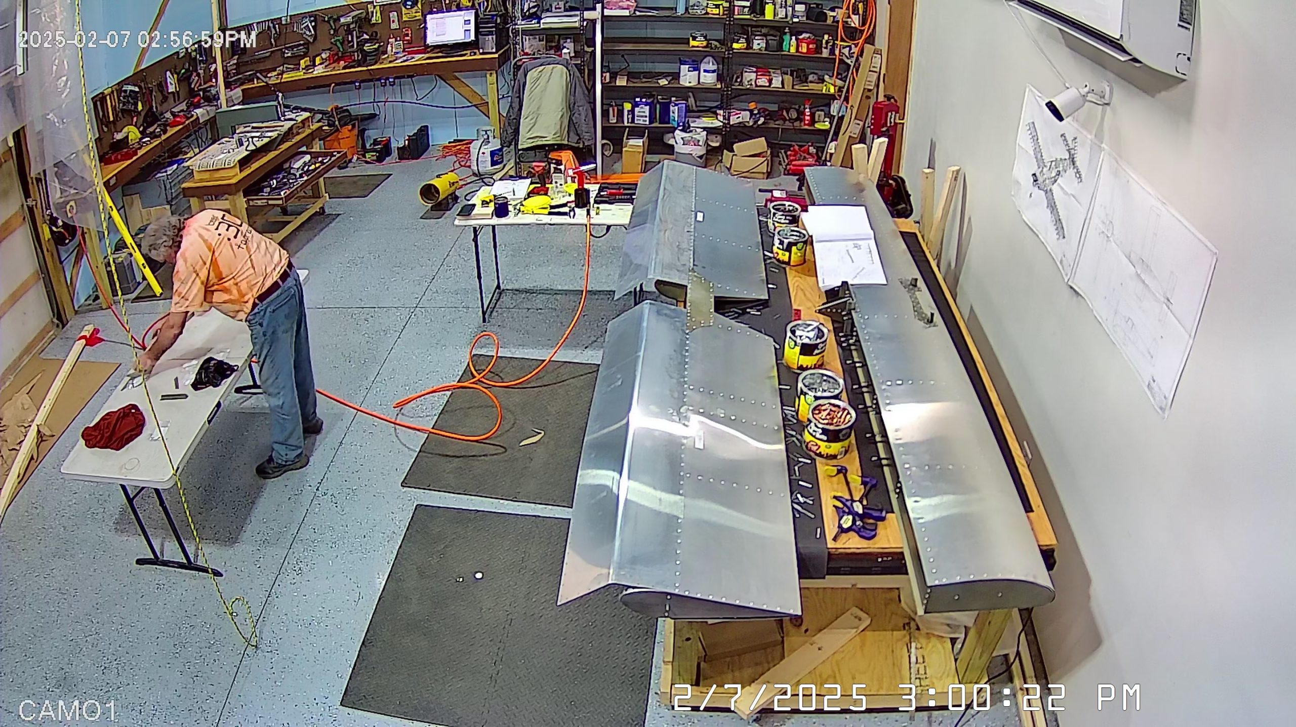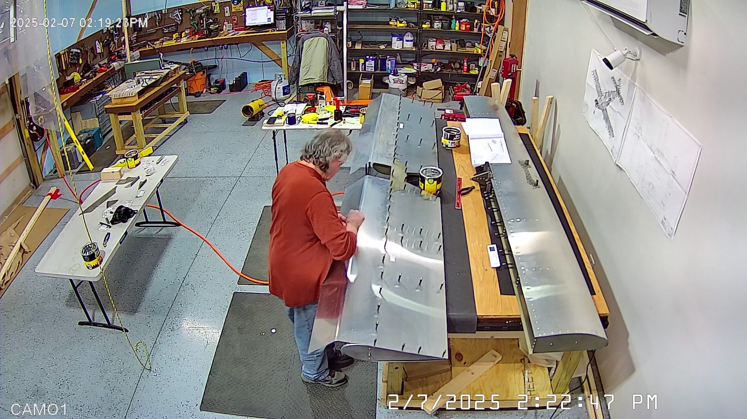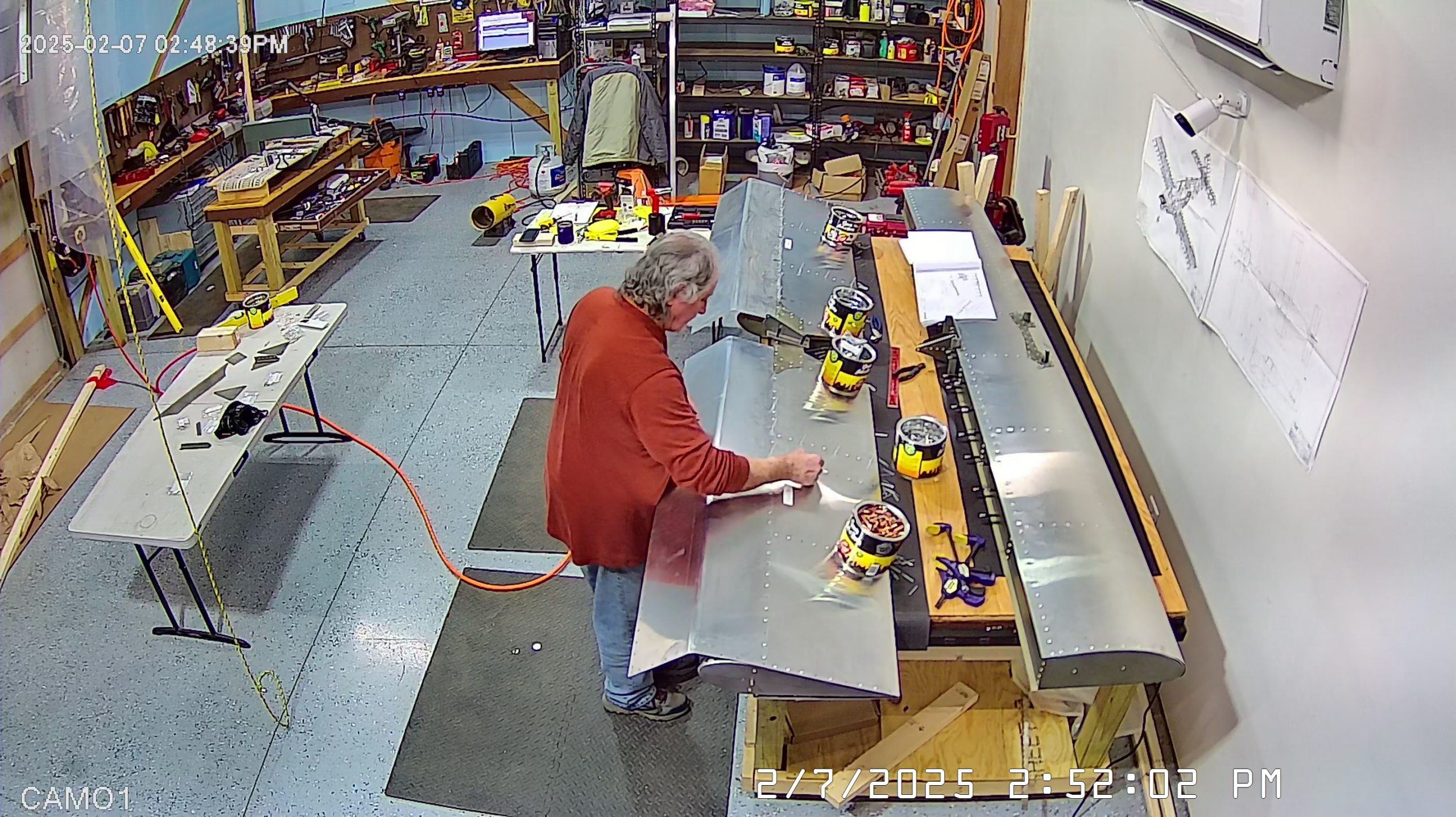 Here are some different view snapshots of the same process. You can see I used the 2×4 I used to fold the horizontal stabilizer over the ribs to make sure the elevator was flat against the bench top. That and a few cans full of clecos. I guess I could have clamped the elevator to the bench. Next time :). In any event, I think I got the elevator and the horizontal stabilizer flat.