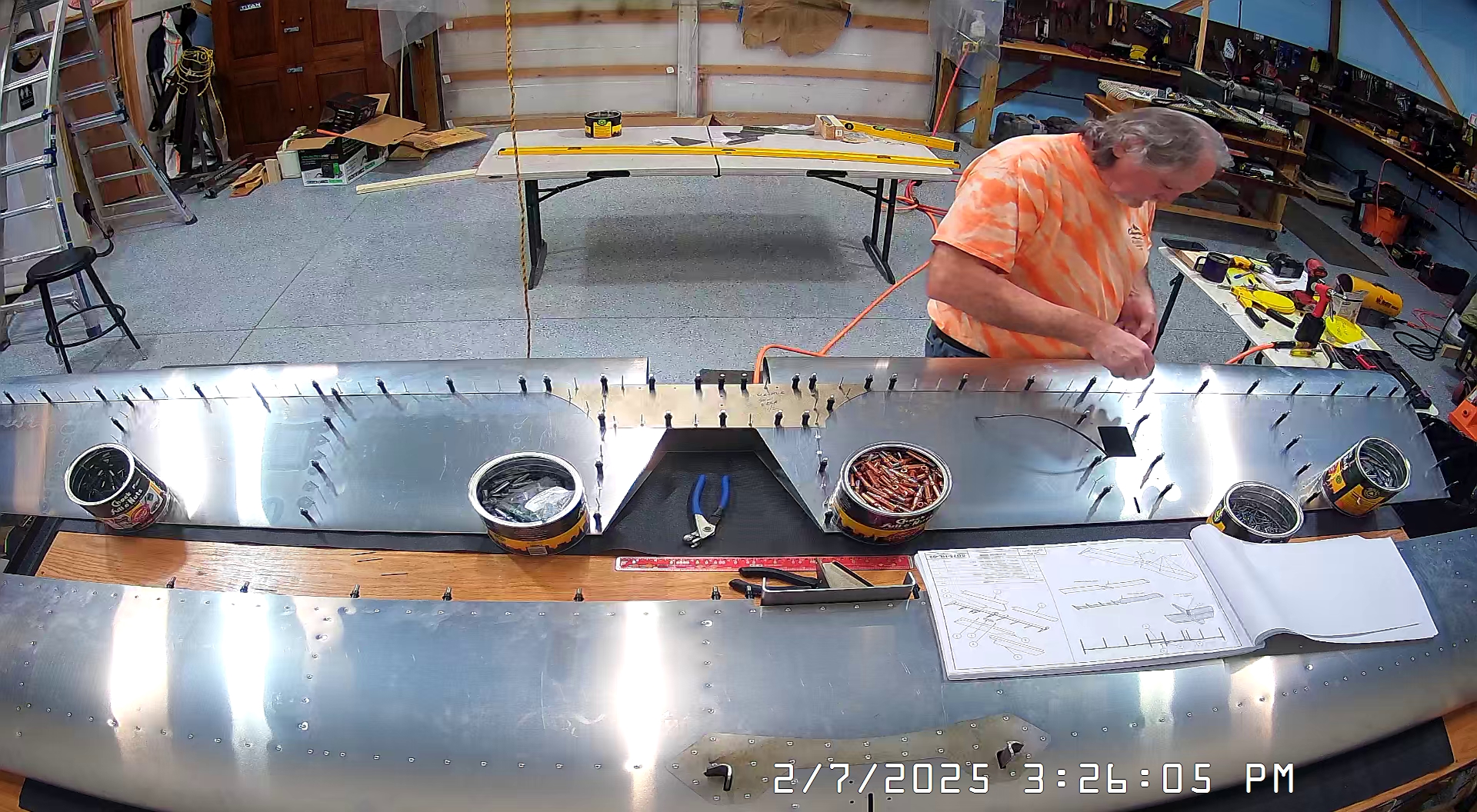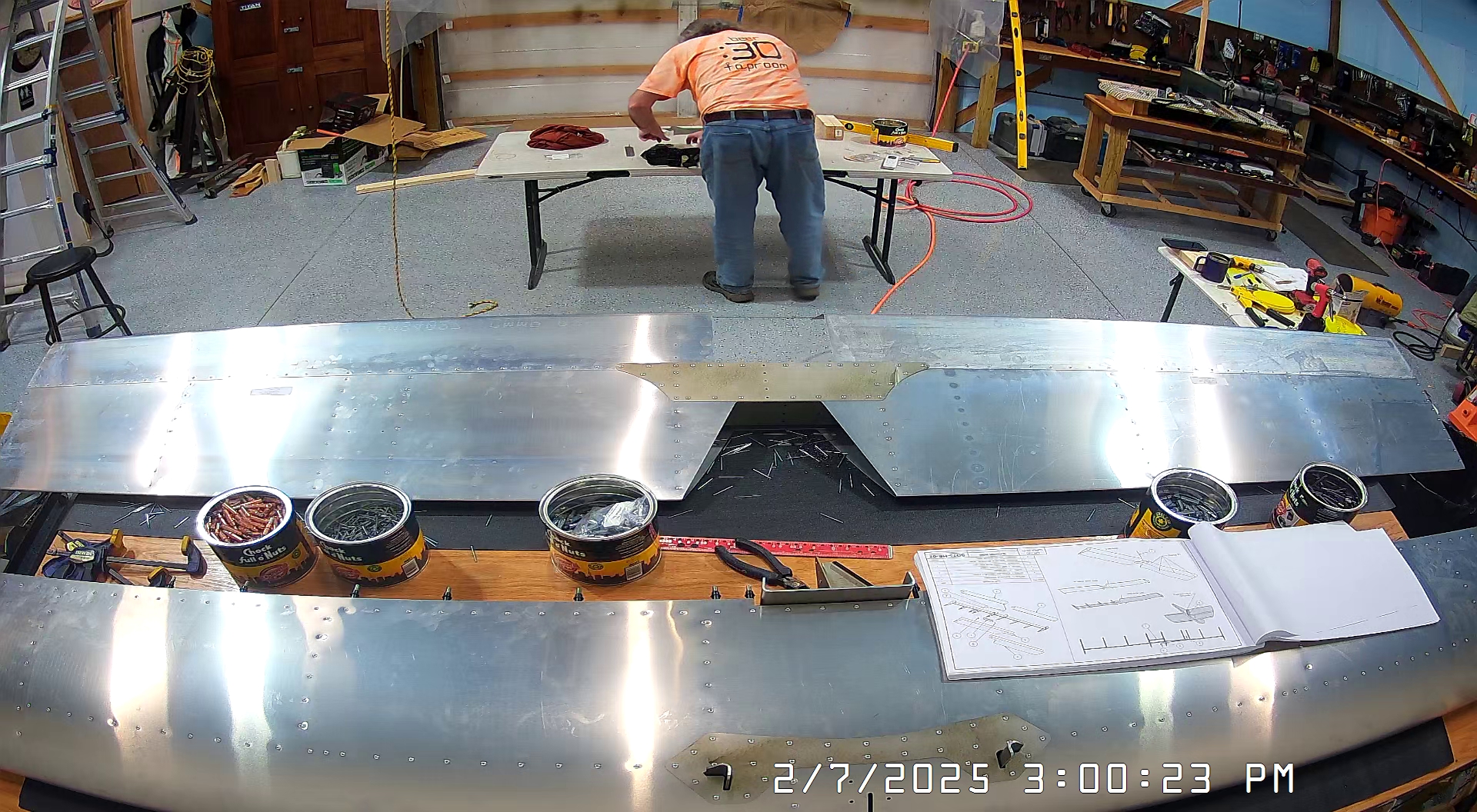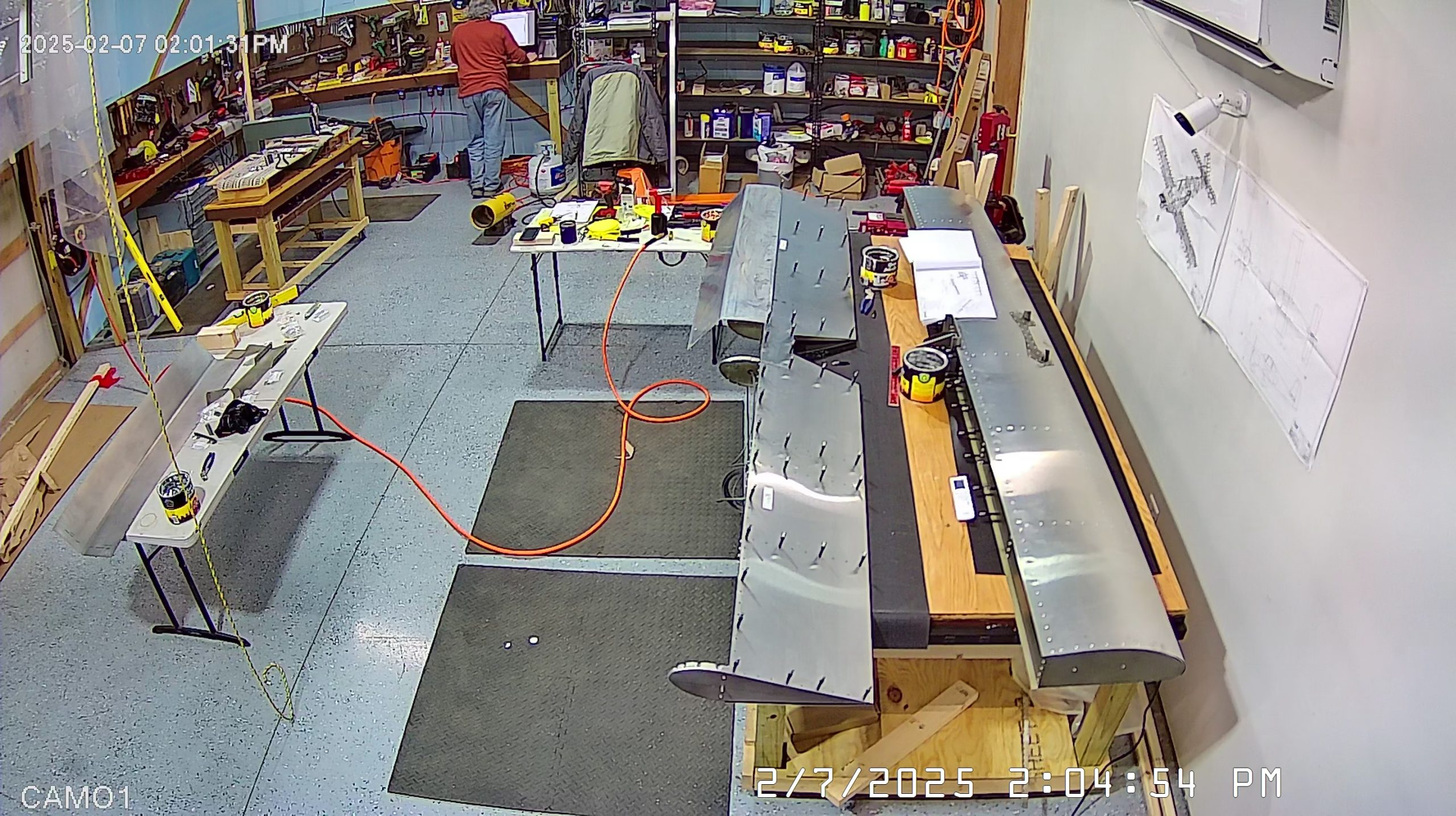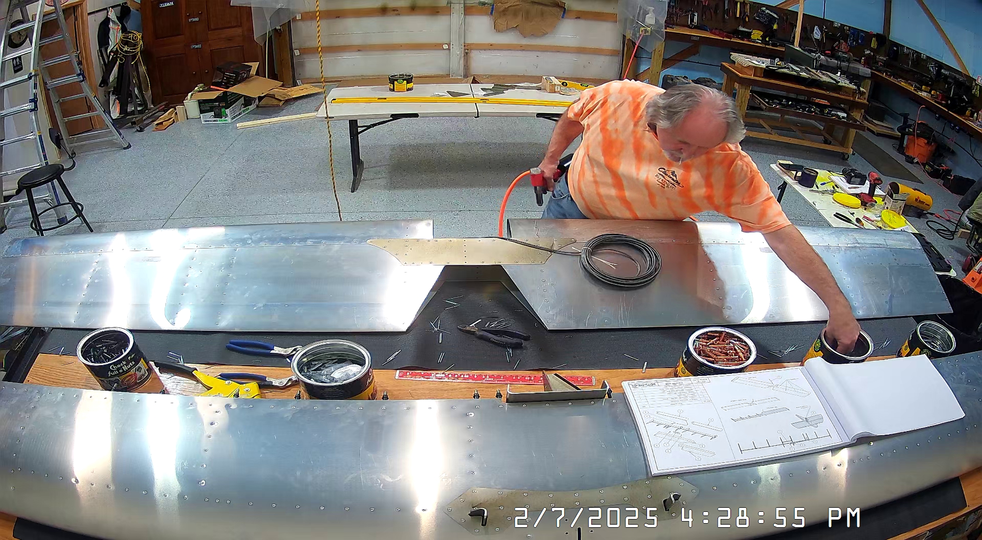 Here are some different view snapshots of the same process. You can see I used the 2×4 I used to fold the horizontal stabilizer over the ribs to make sure the elevator was flat against the bench top. That and a few cans full of clecos. I guess I could have clamped the elevator to the bench. Next time :). In any event, I think I got the elevator and the horizontal stabilizer flat.