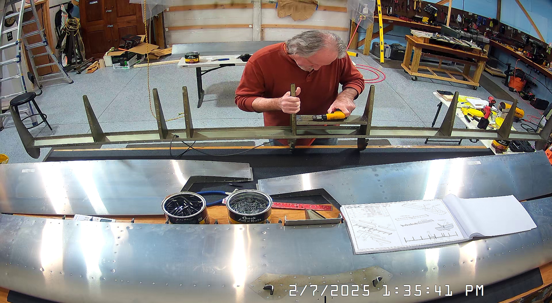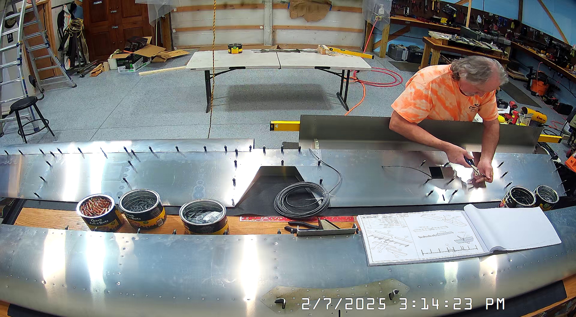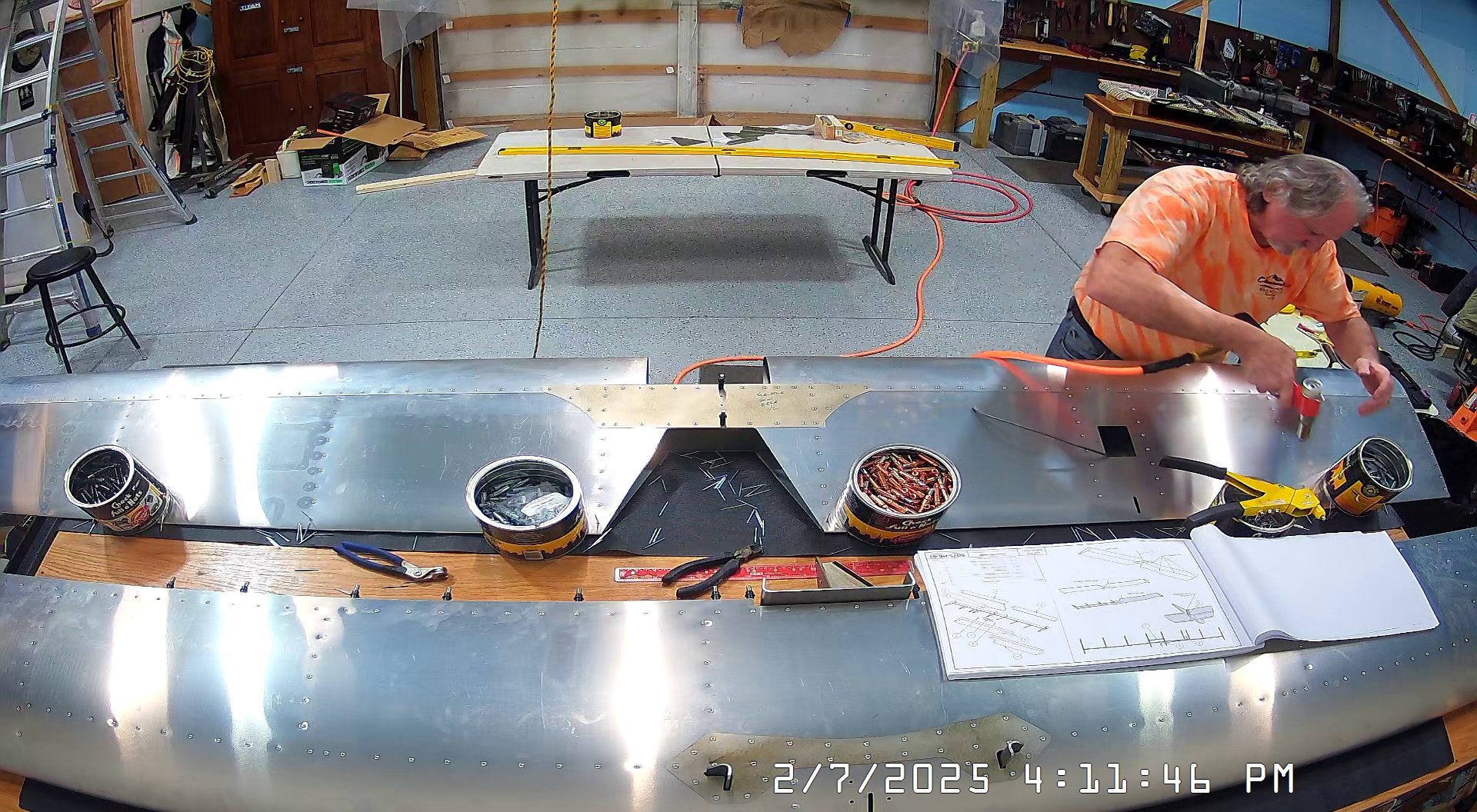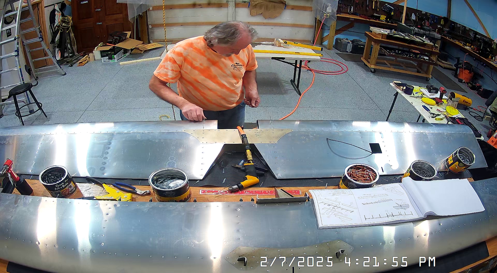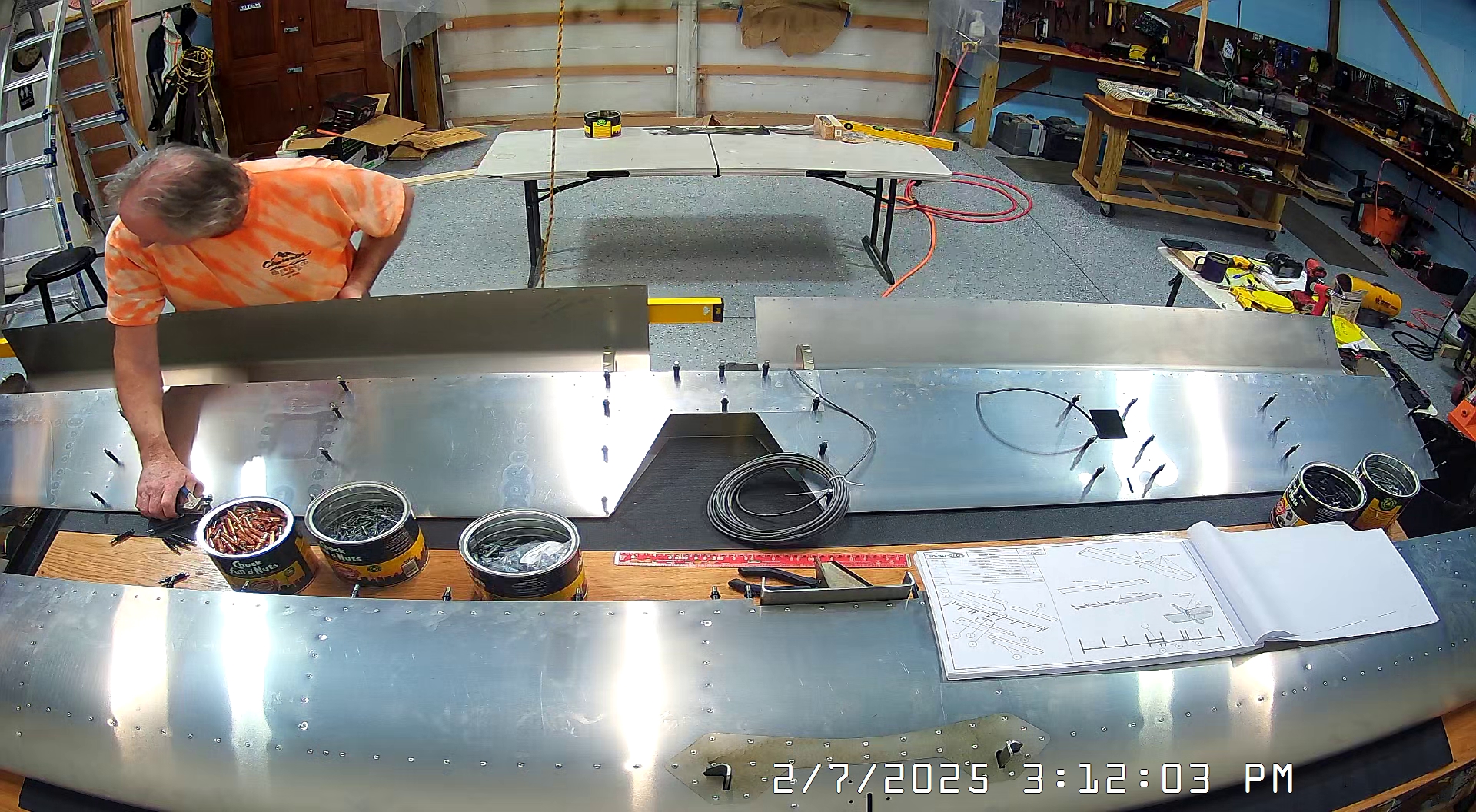 Here are some different view snapshots of the same process. You can see I used the 2×4 I used to fold the horizontal stabilizer over the ribs to make sure the elevator was flat against the bench top. That and a few cans full of clecos. I guess I could have clamped the elevator to the bench. Next time :). In any event, I think I got the elevator and the horizontal stabilizer flat.