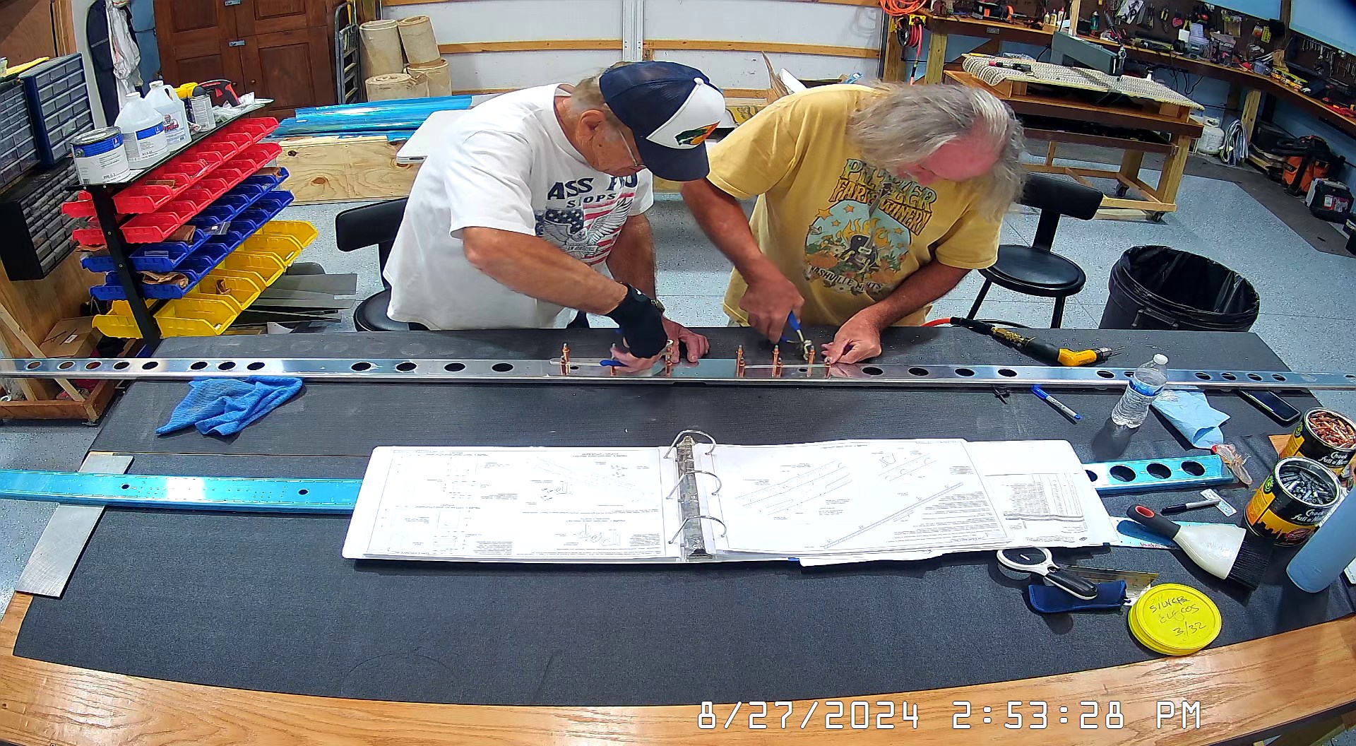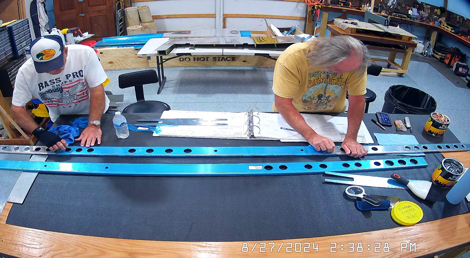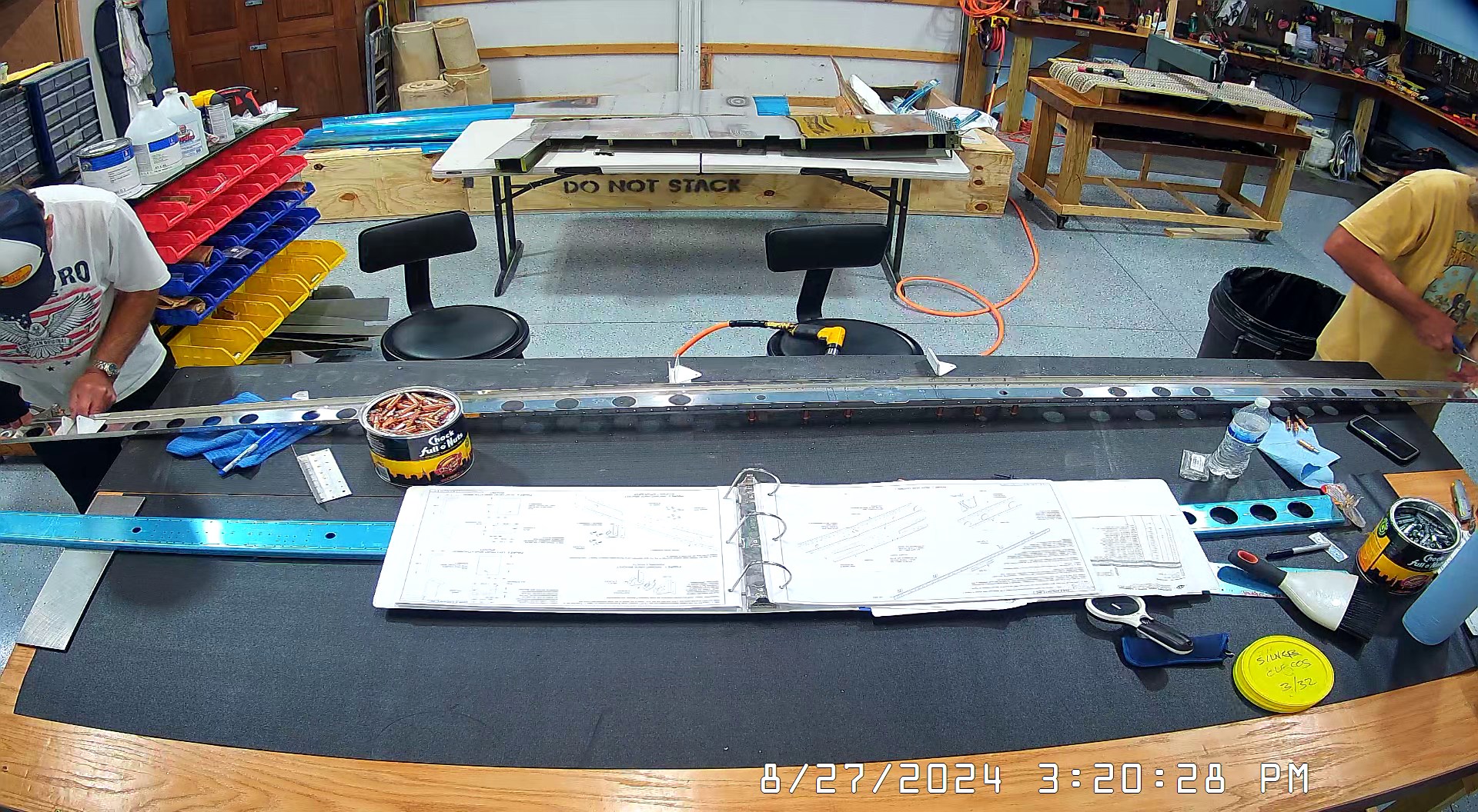 We put the rudder assembly aside for the time being pending an inspection by tech counselor John DeYager and picked up the horizontal stabilizer spars and doublers and put them on the bench to get started working.