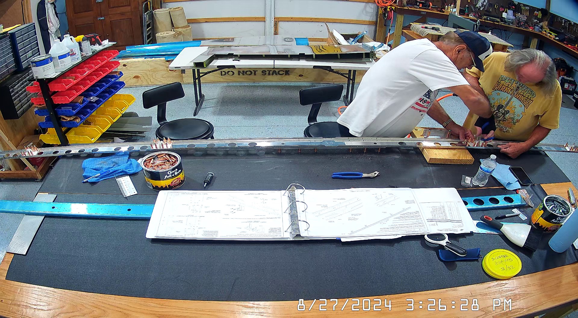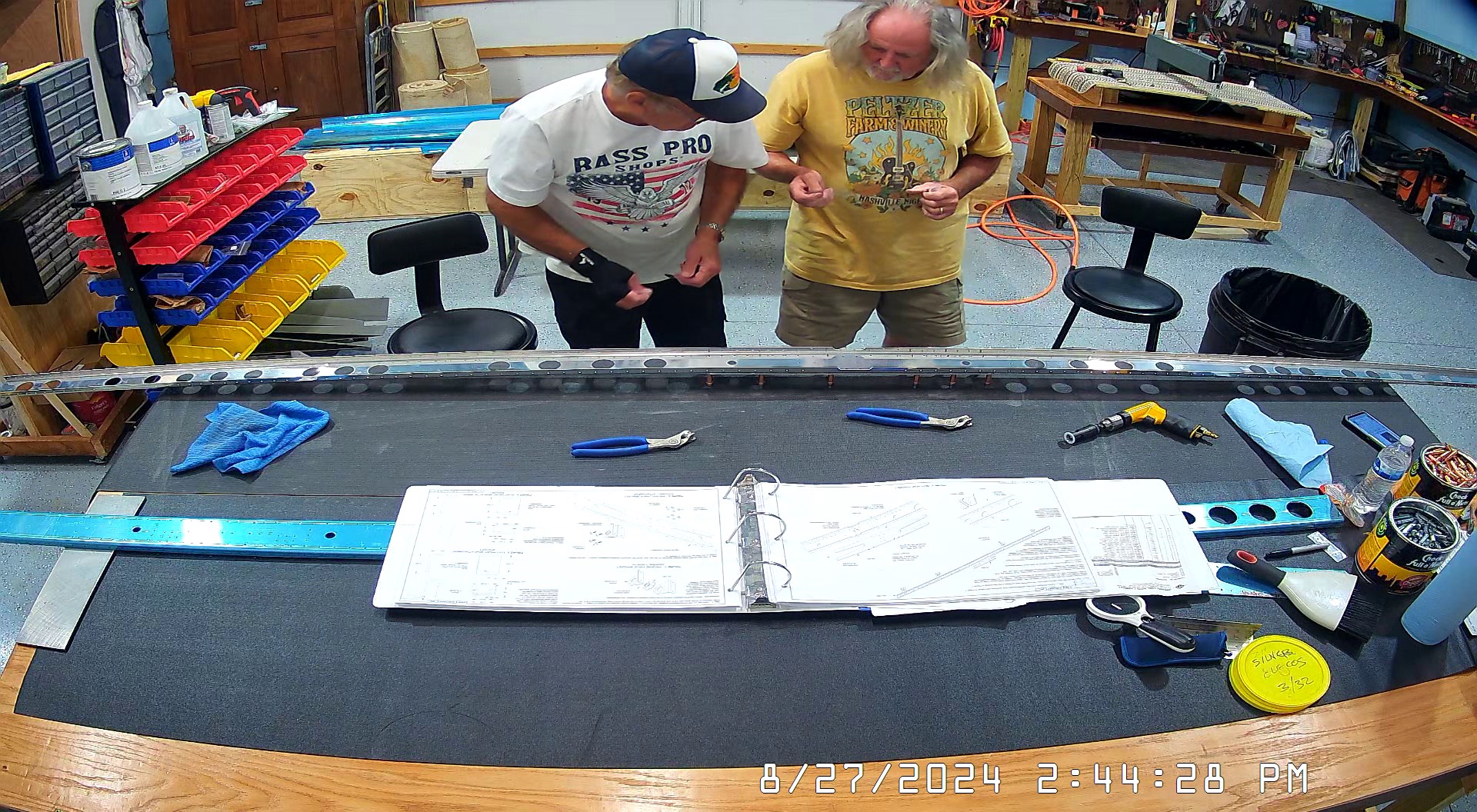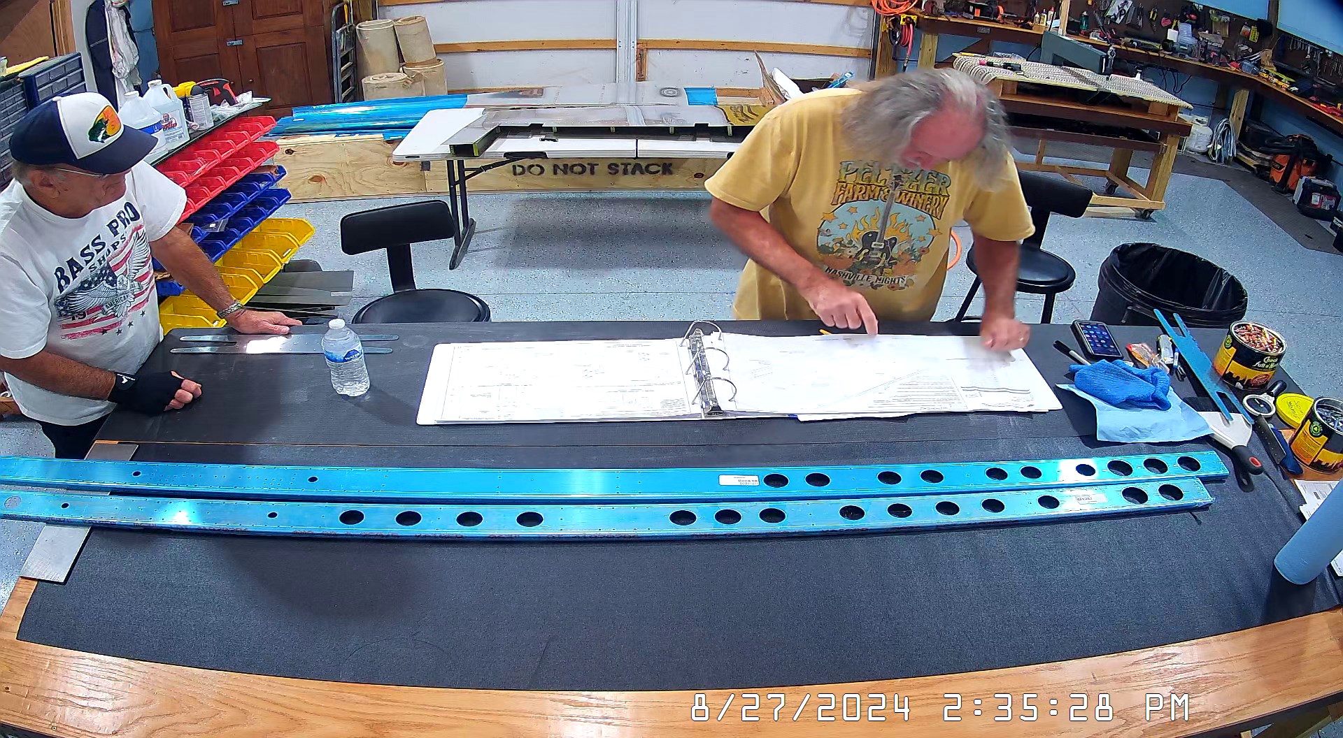 We put the rudder assembly aside for the time being pending an inspection by tech counselor John DeYager and picked up the horizontal stabilizer spars and doublers and put them on the bench to get started working.