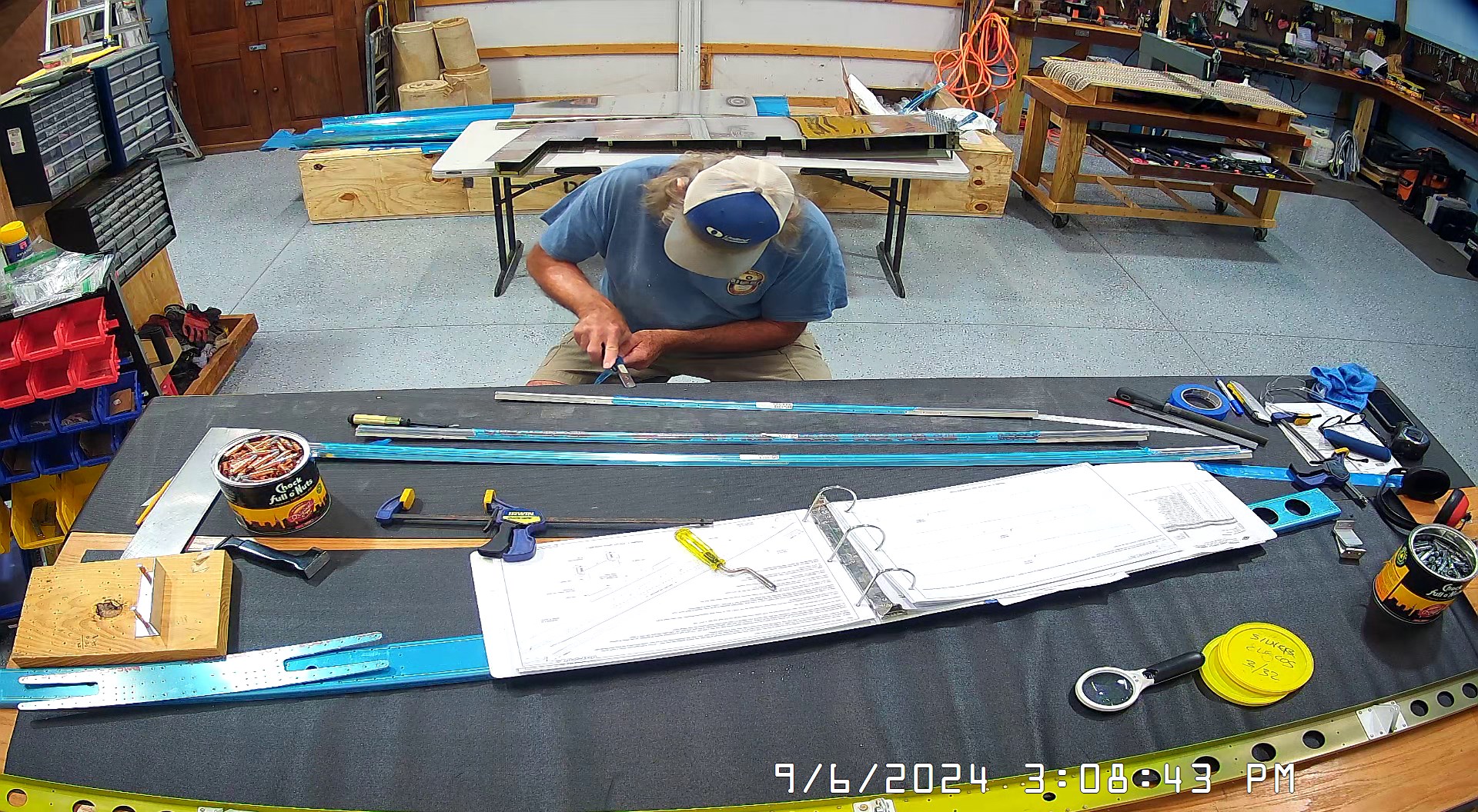 Today I spent the time marking up and trimming the HS-1013 spar caps (2), 1014, long, and 1015, short, stringers. There are two of each and they need to be trimmed at both ends. I thought I would try a cutoff saw for the trimming but it turned out my trusty cheap bandsaw was a lot better. I put some duct tape on the bandsaw bed to protect the aluminum and that worked out well too.