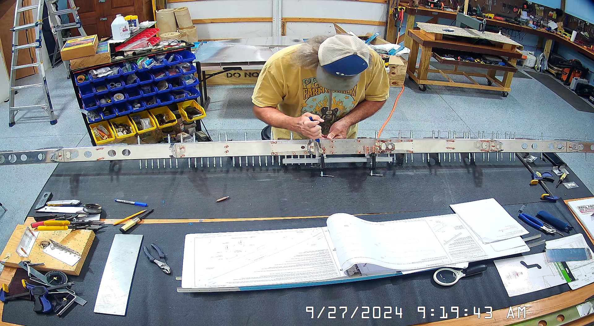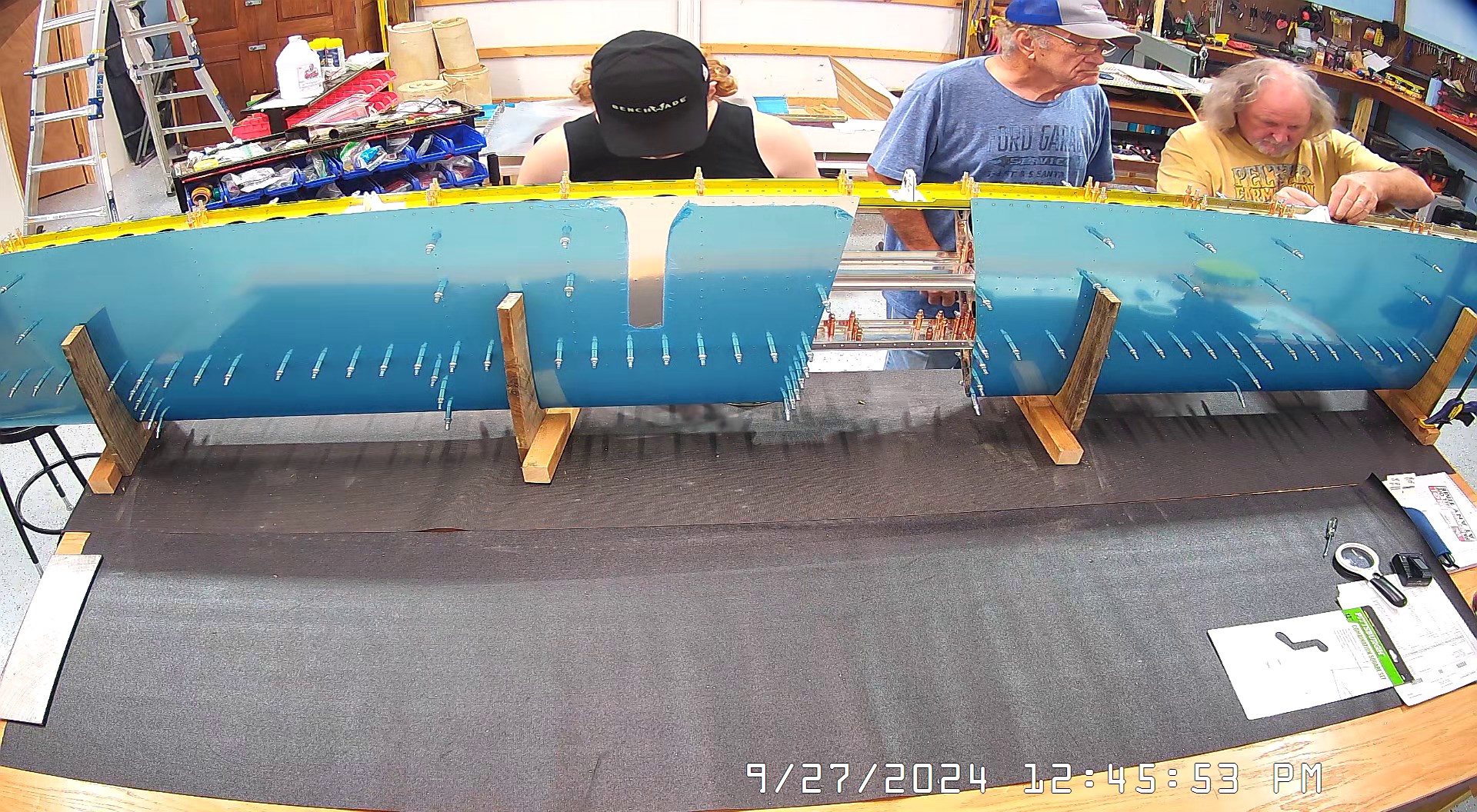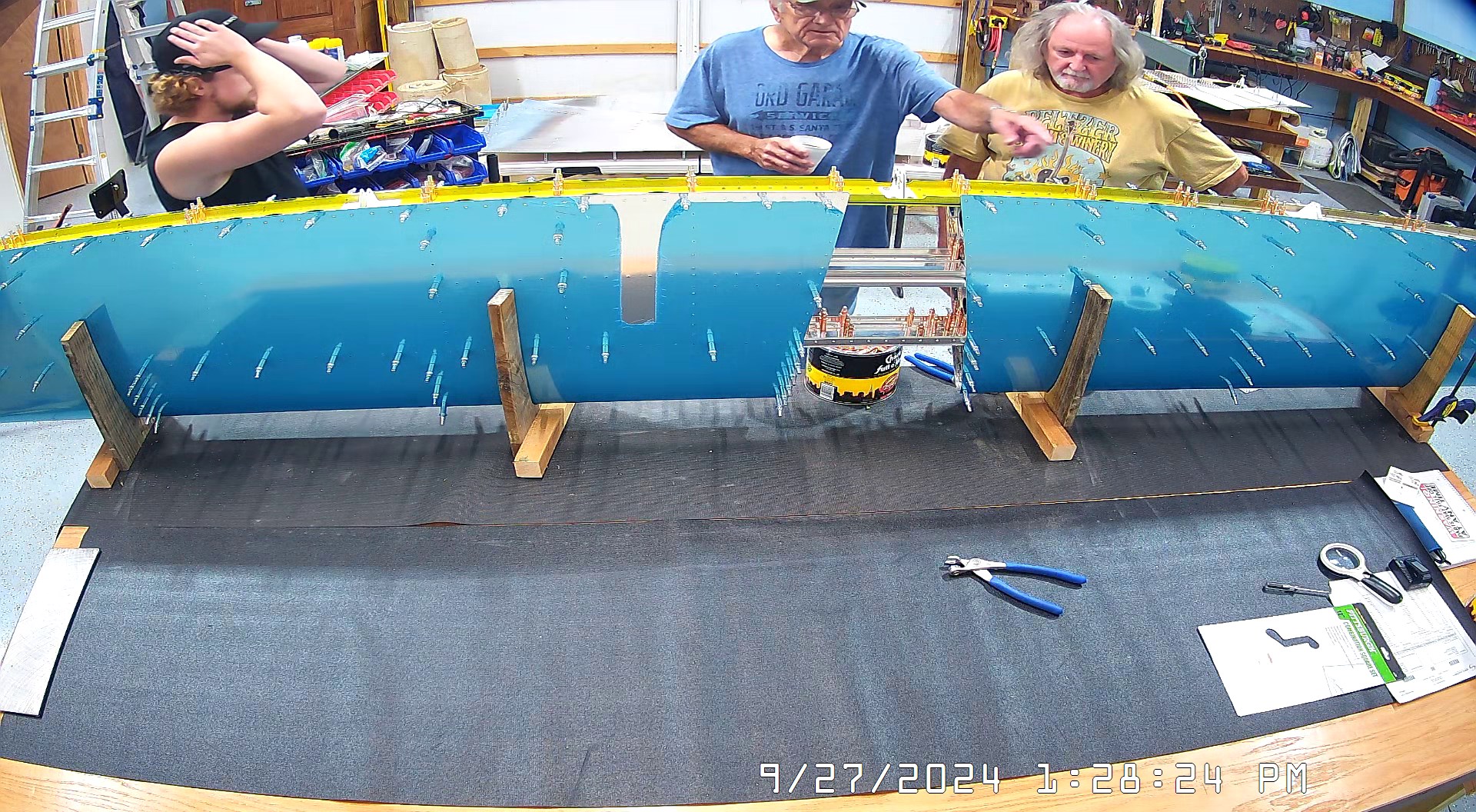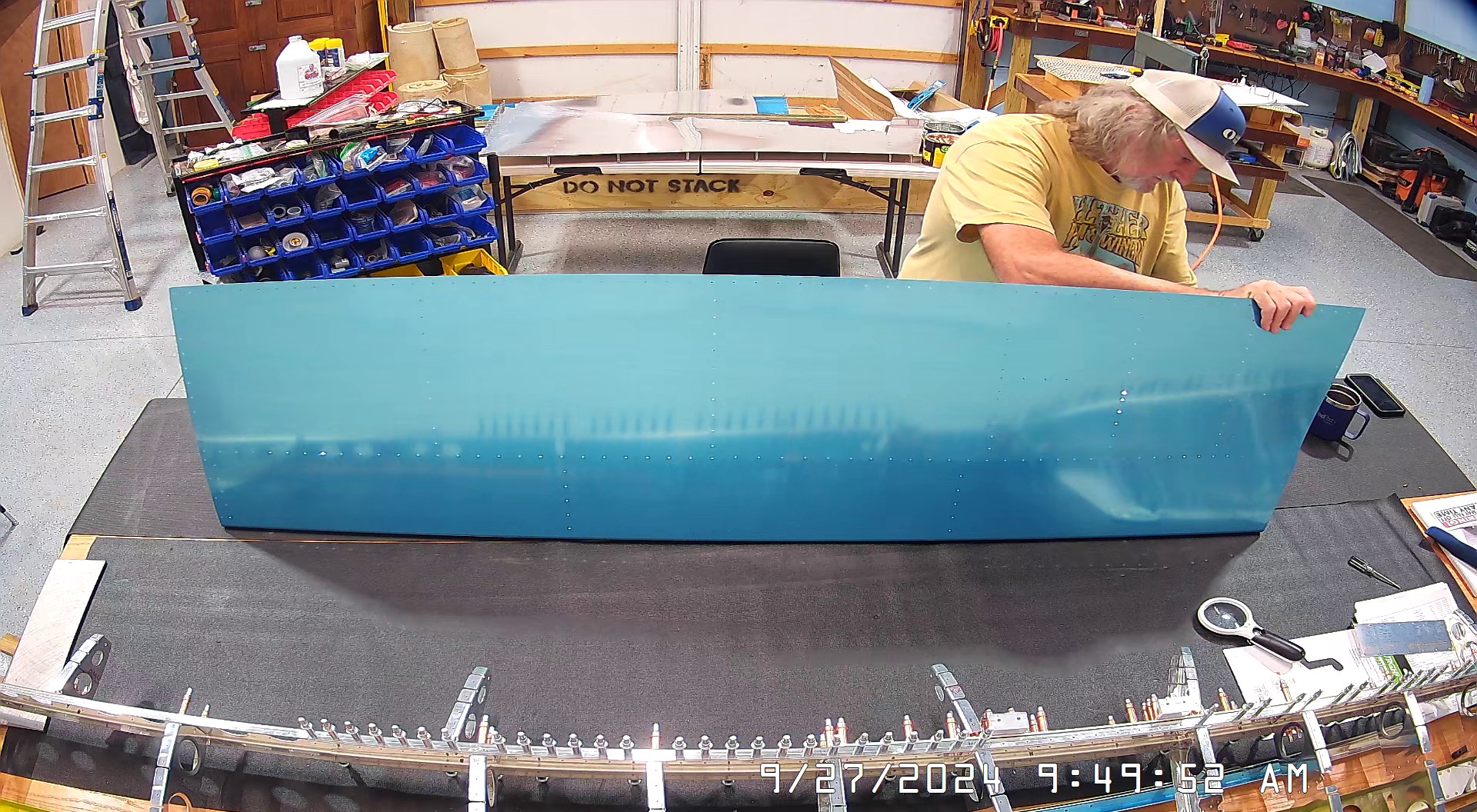 I then moved the spar out of the way and brought the 2 HS-1001 skins down on to the bench to remove the inside vinyl in preparation for attaching the HS-905 nose ribs. During this process my apprentices EJ and his grandson Ty showed up to help complete the vinyl removal.