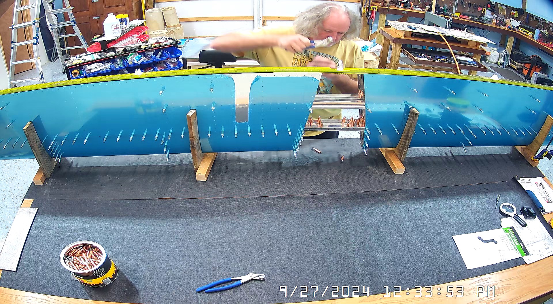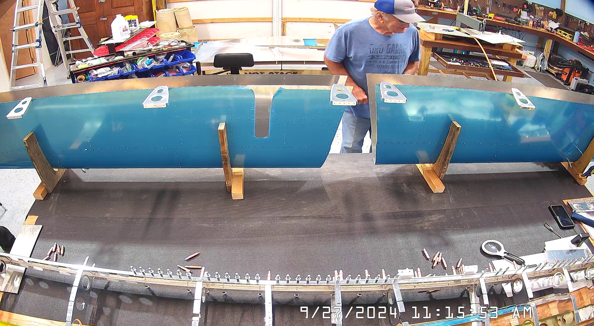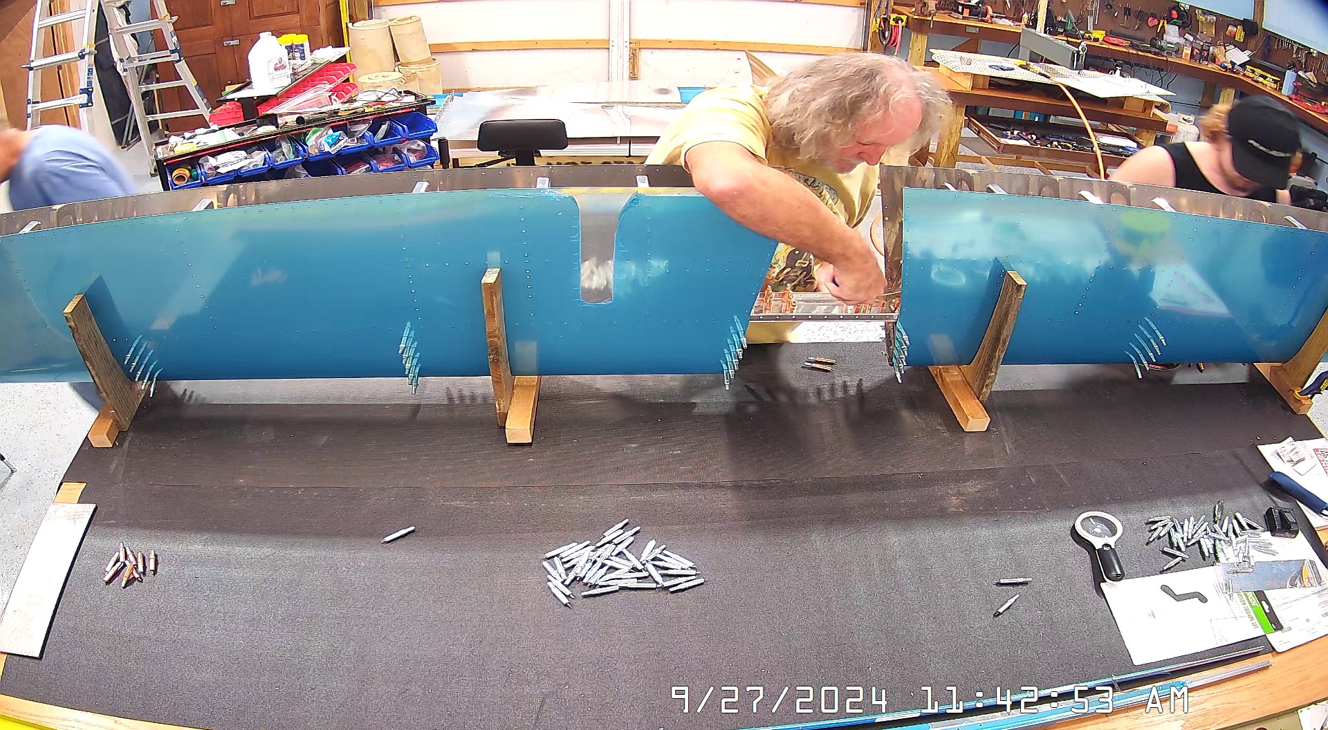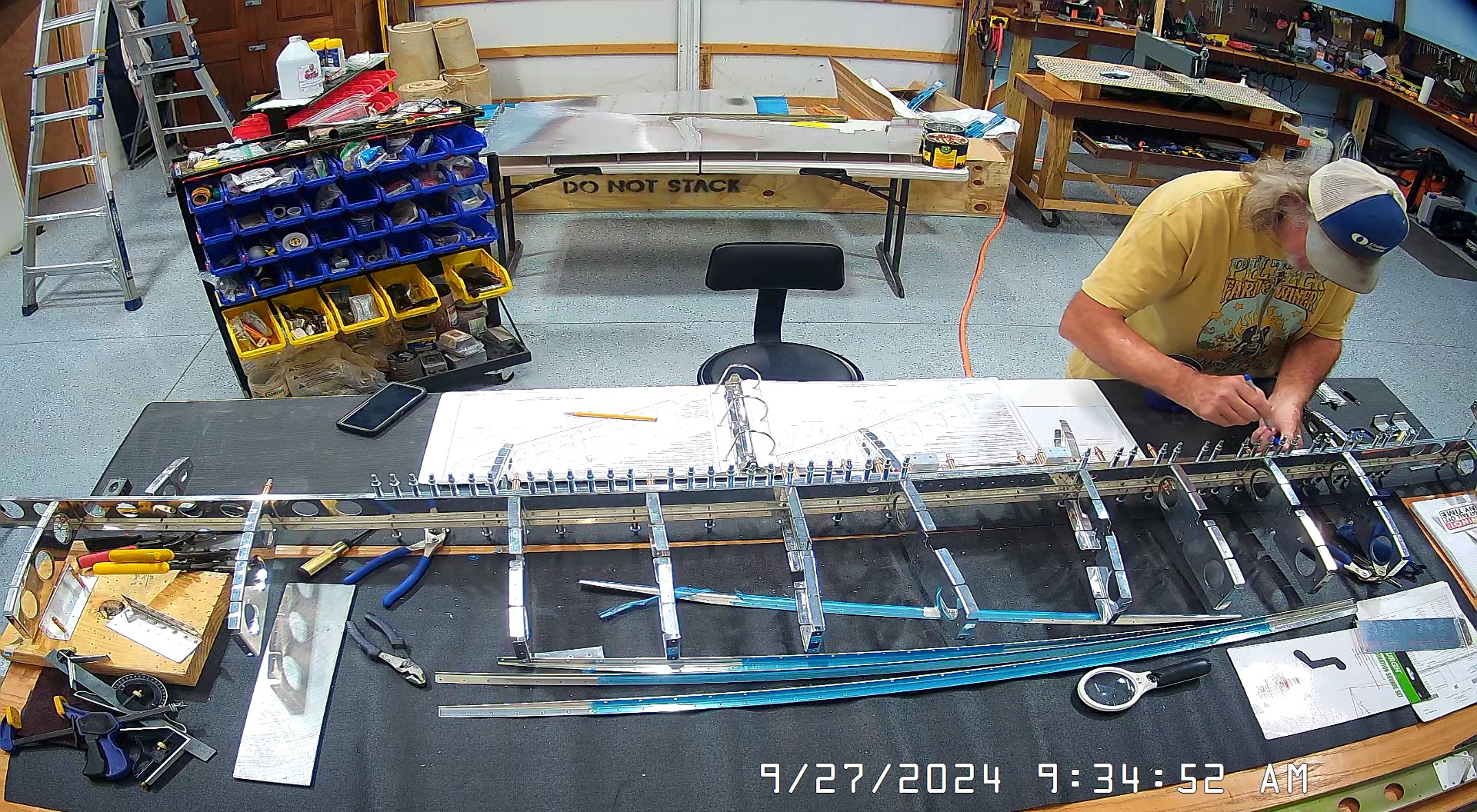 I then moved the spar out of the way and brought the 2 HS-1001 skins down on to the bench to remove the inside vinyl in preparation for attaching the HS-905 nose ribs. During this process my apprentices EJ and his grandson Ty showed up to help complete the vinyl removal.