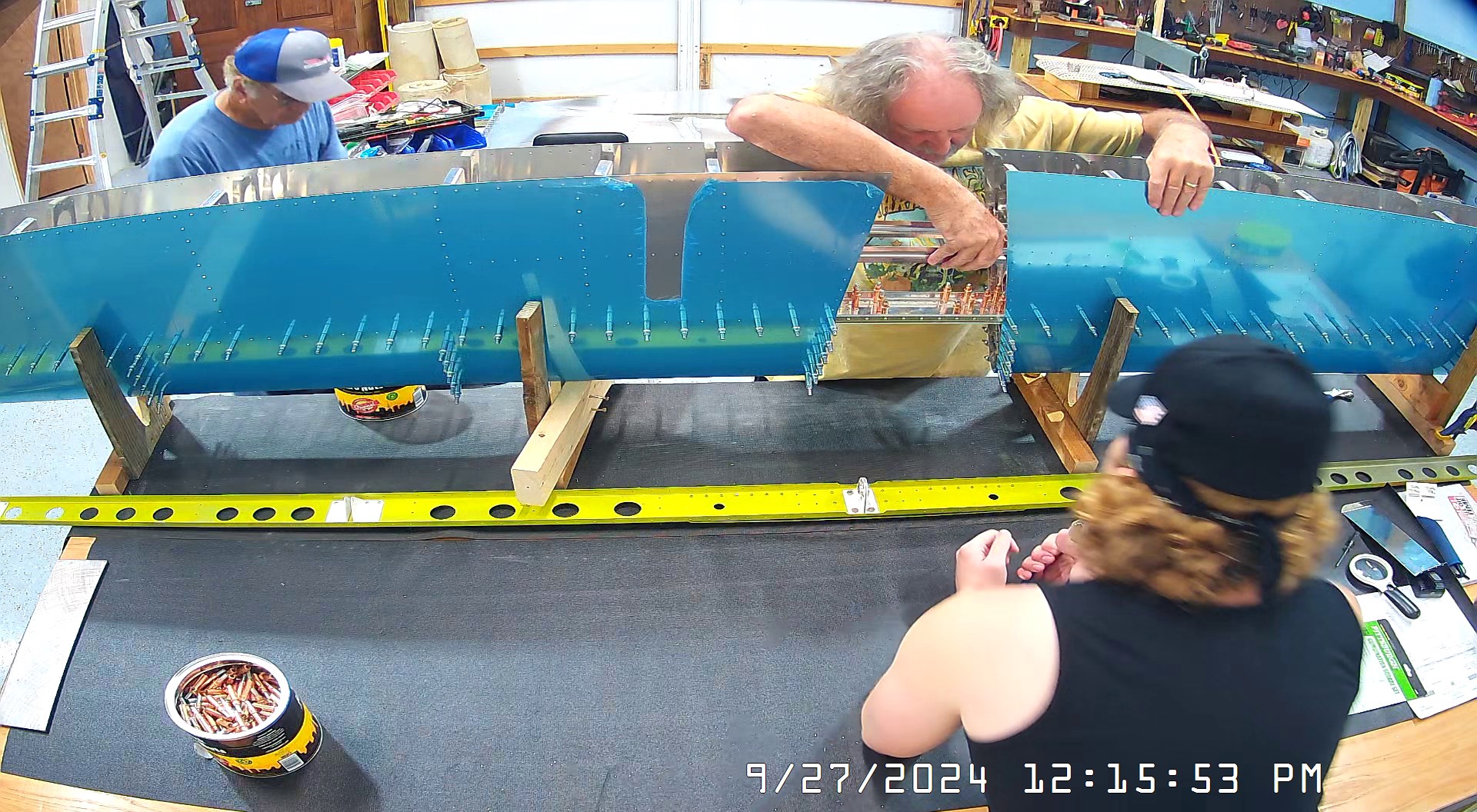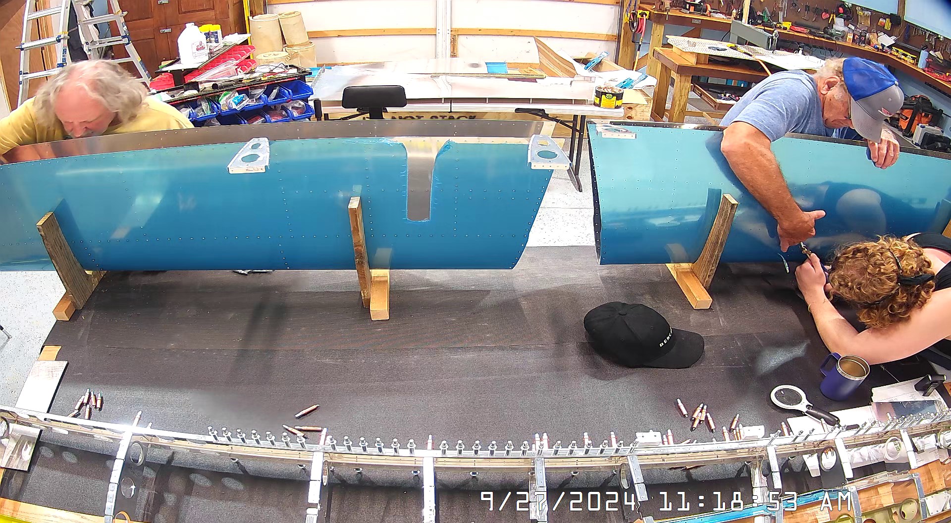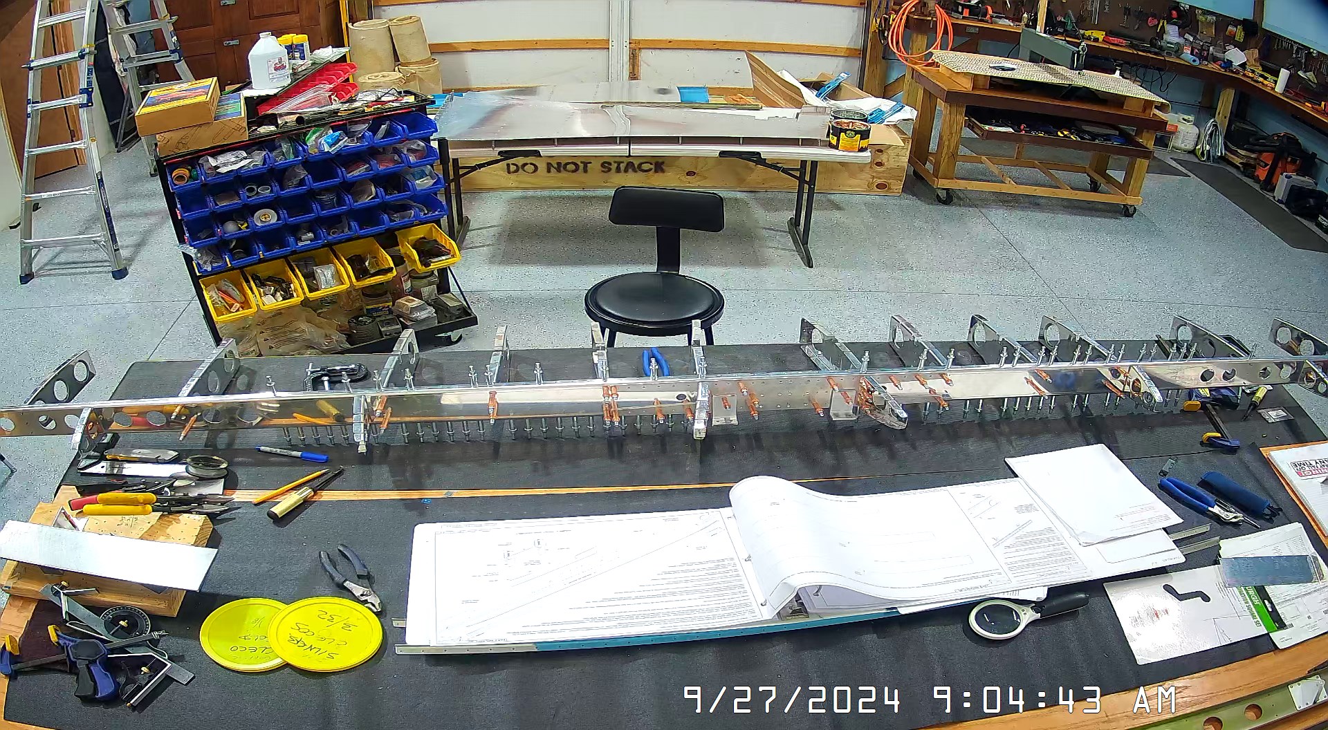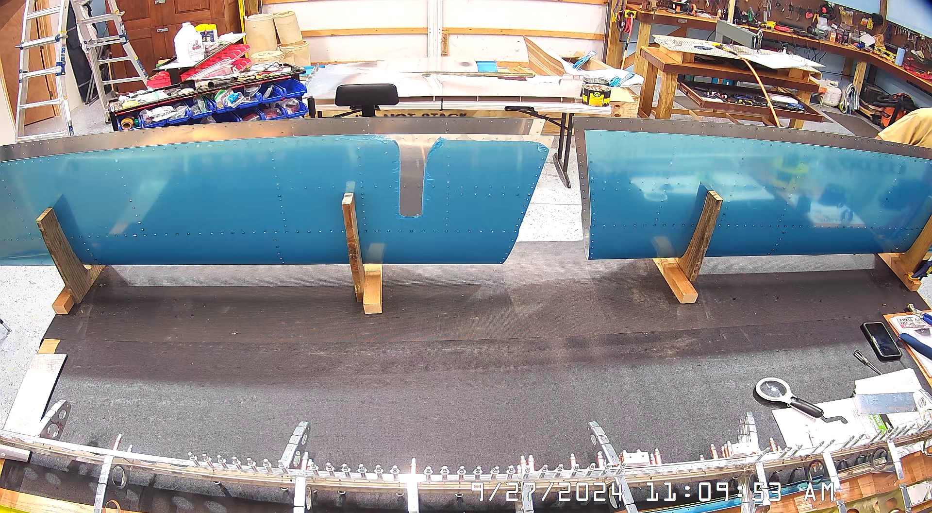 I then moved the spar out of the way and brought the 2 HS-1001 skins down on to the bench to remove the inside vinyl in preparation for attaching the HS-905 nose ribs. During this process my apprentices EJ and his grandson Ty showed up to help complete the vinyl removal.
