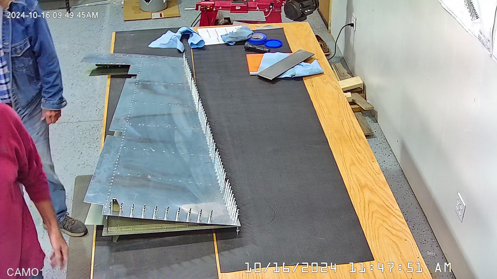 With the trailing edge wedge in place and cleco’d through every hole, we started by riveting the R-1004 bottom rib to the left skin (step 7).