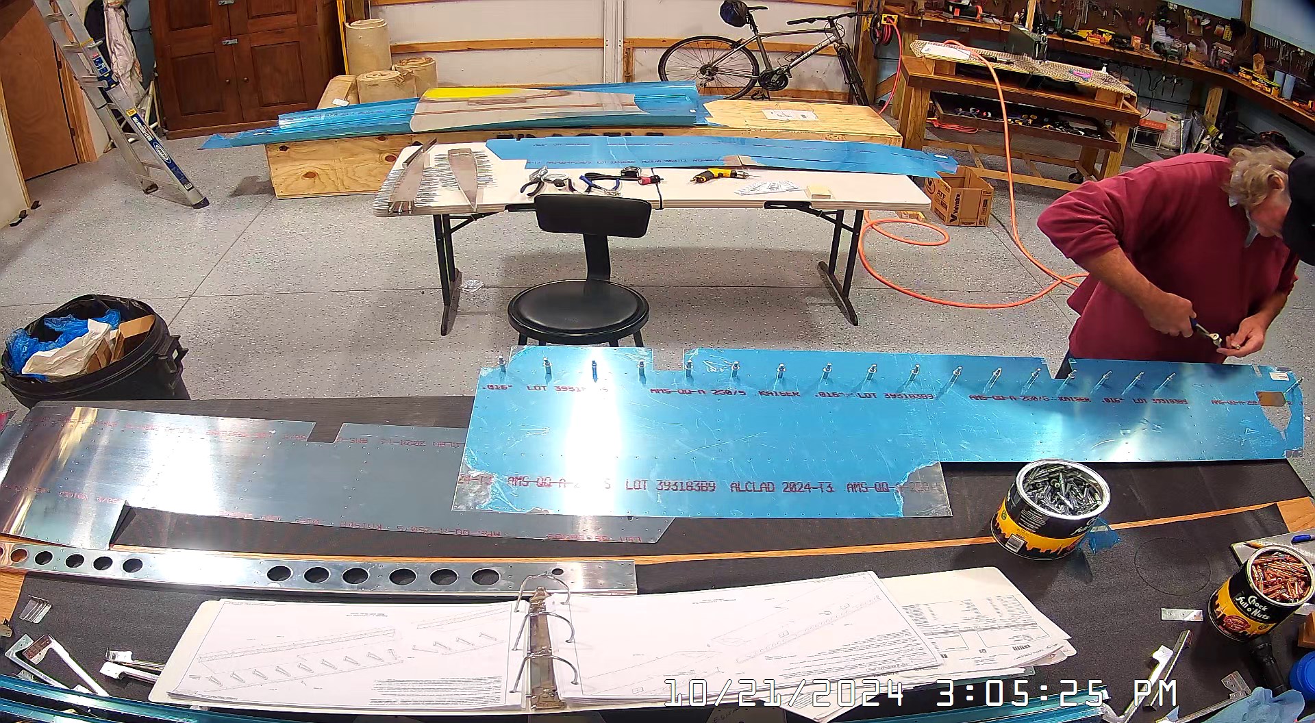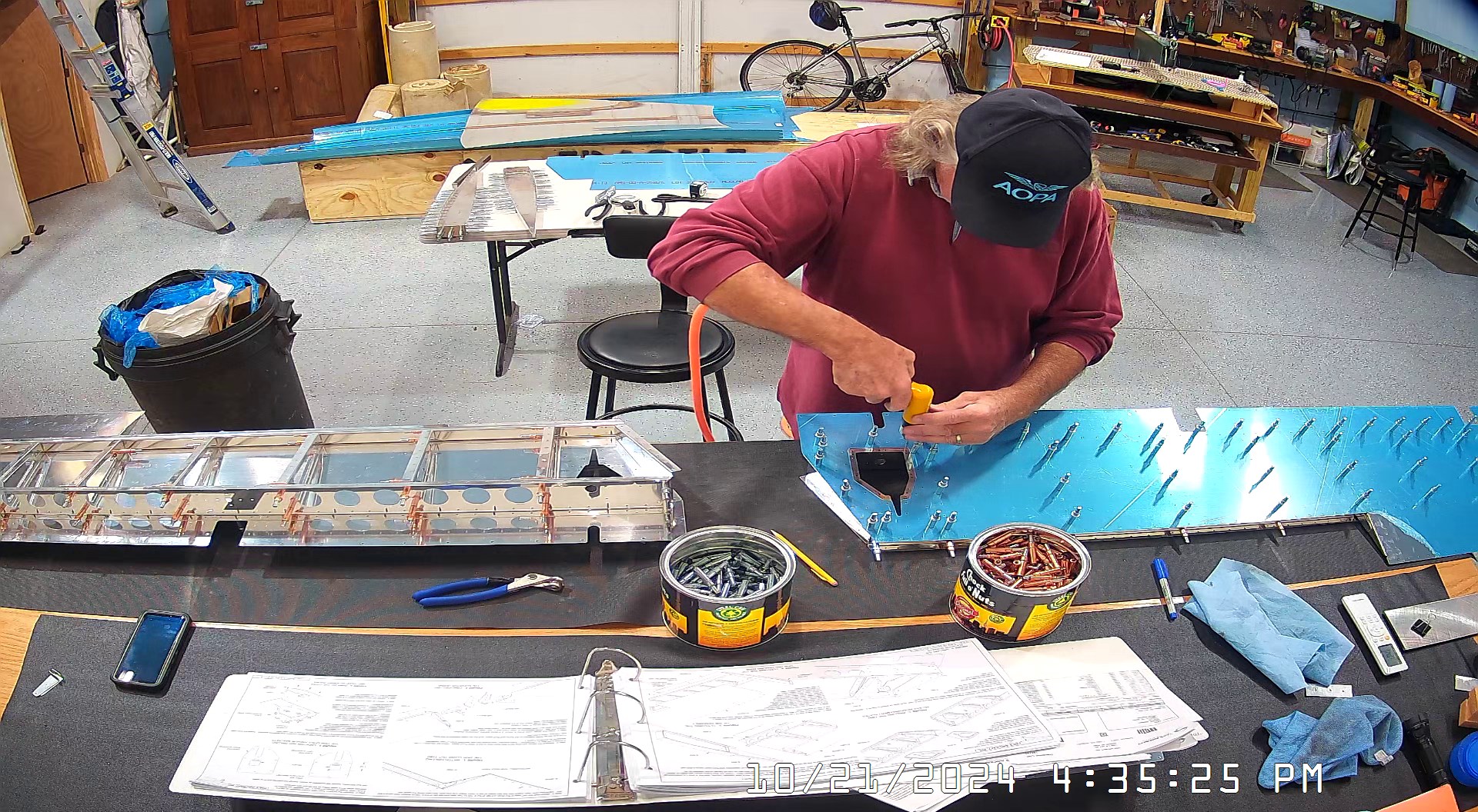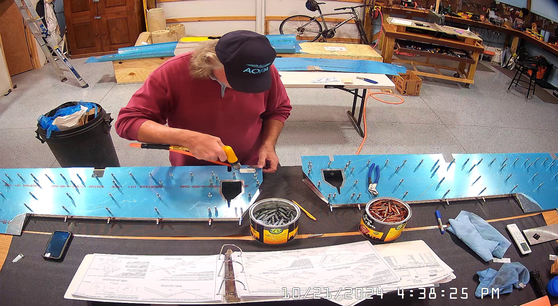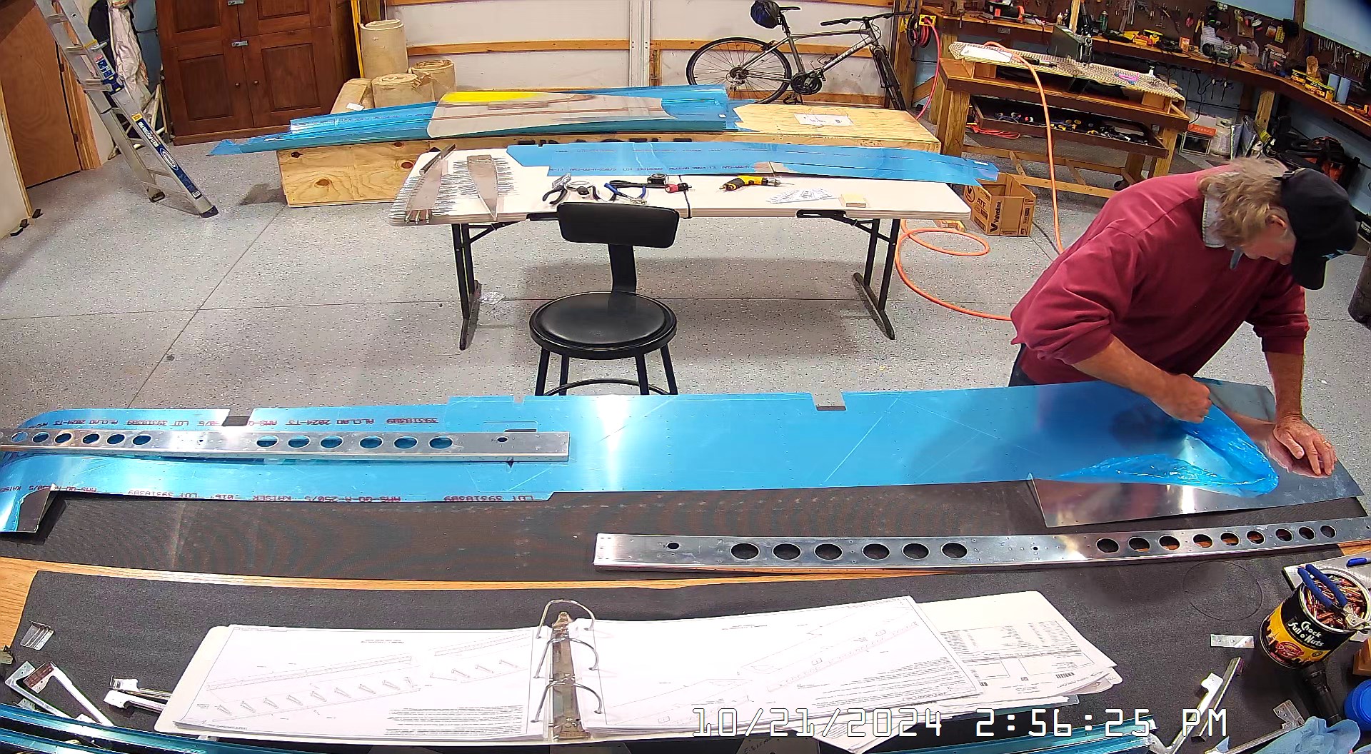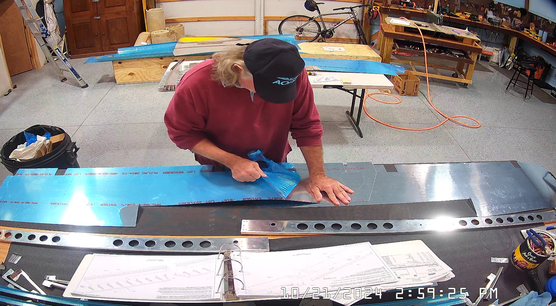 In some places, the manual instructs you to remove the vinyl before clecoing things together. This is not one of those places but I did remove the vinyl on the inside of the elevator skins before clecoing them to the E-1002 front spars per step 3, and the E-905 and E-1008 ribs and stiffeners per page 9-5. I had completed the drilling of the E-910 hinge plates and the 5/8th hole previously so just moved on with attaching the bottom skins to the spars.