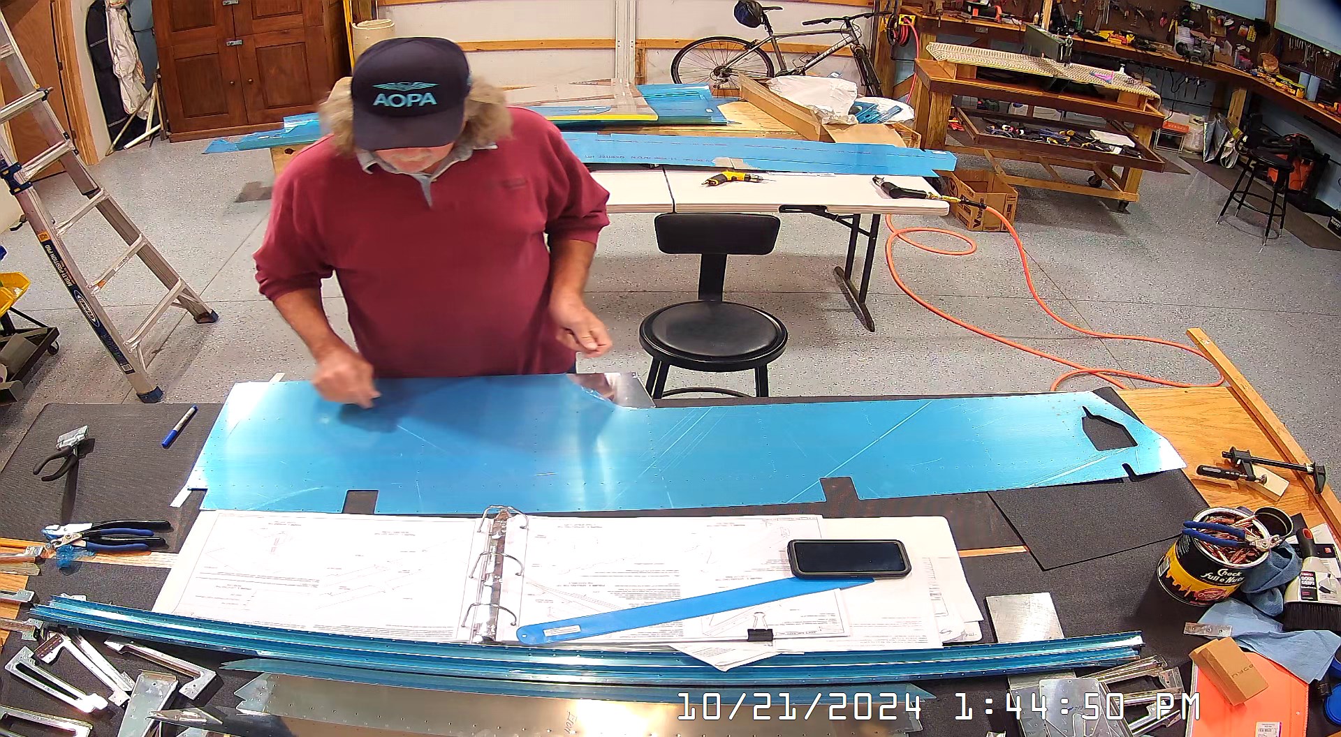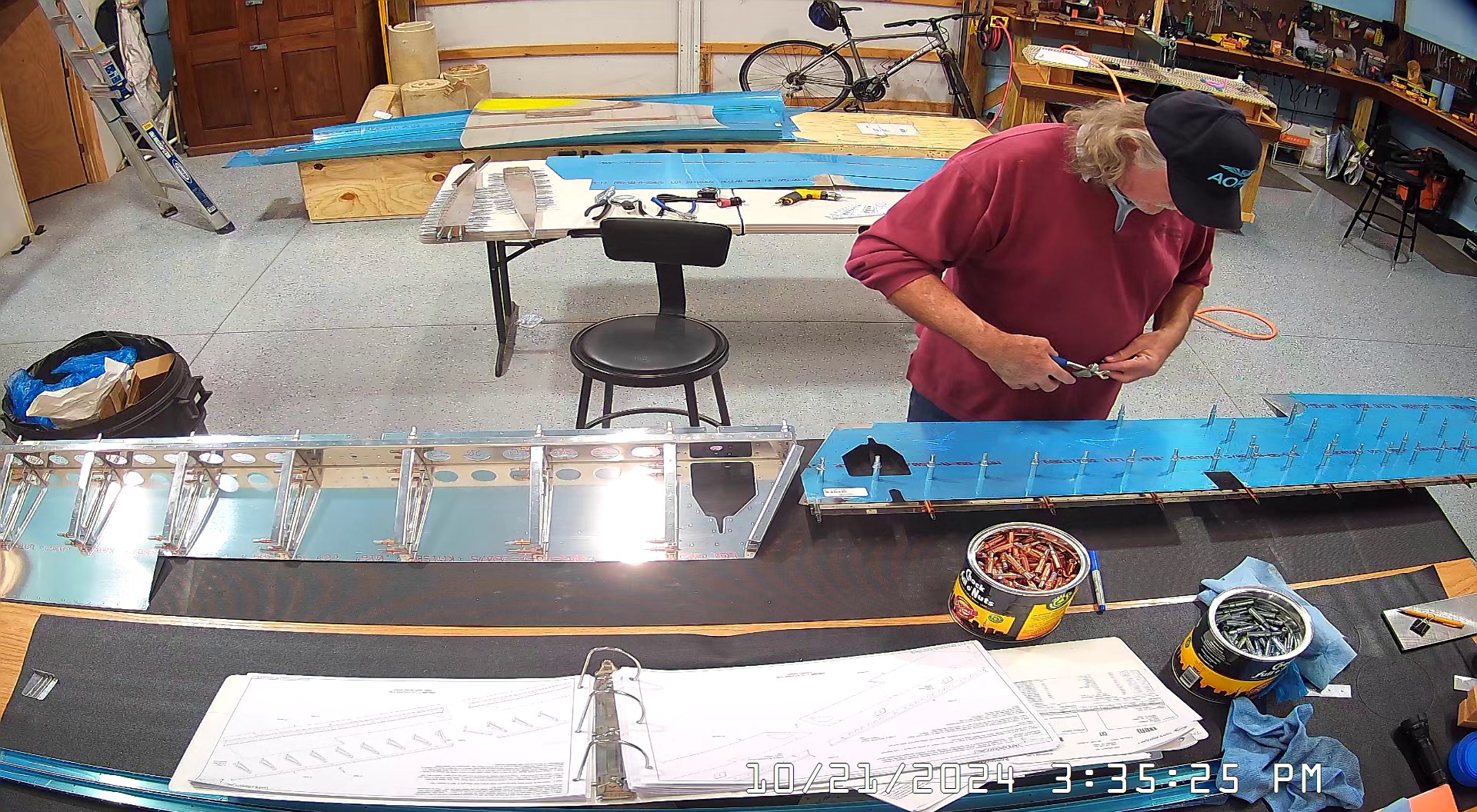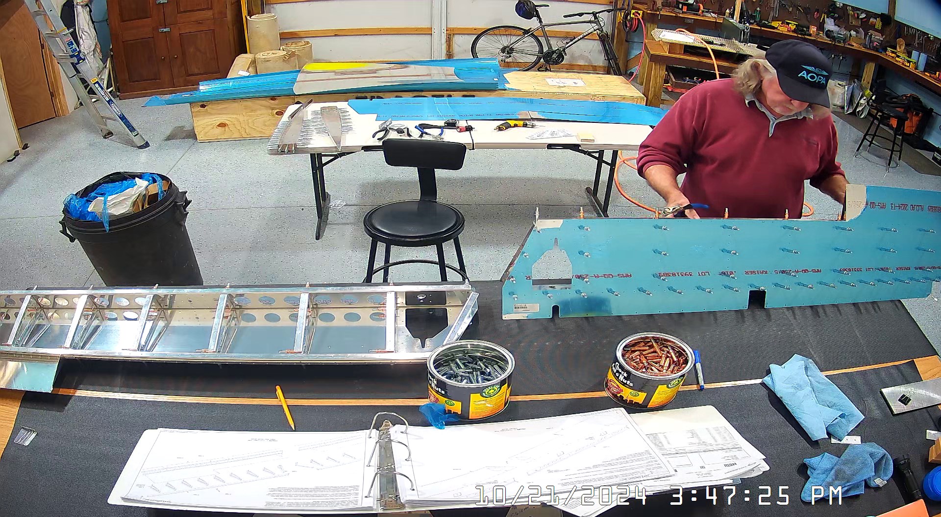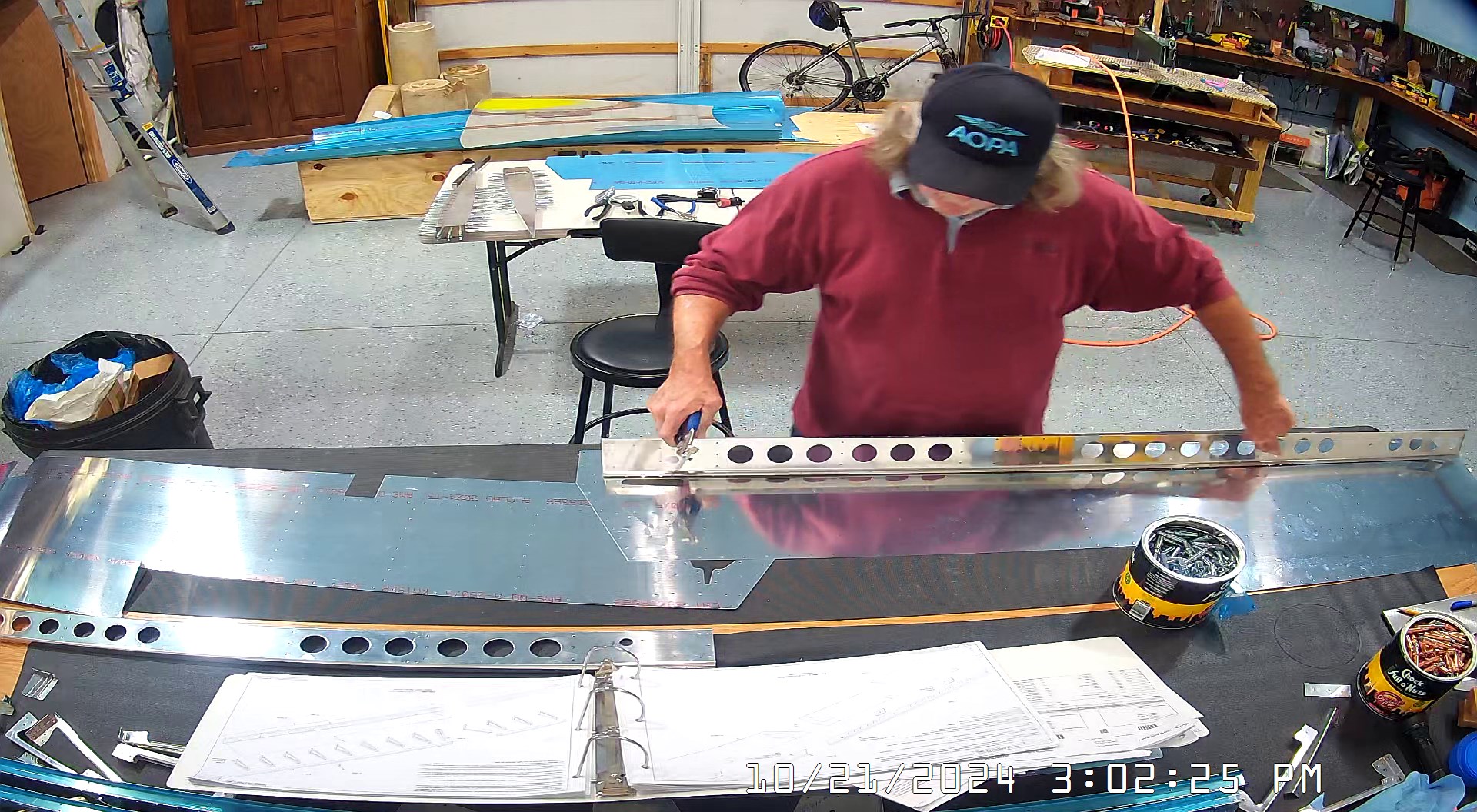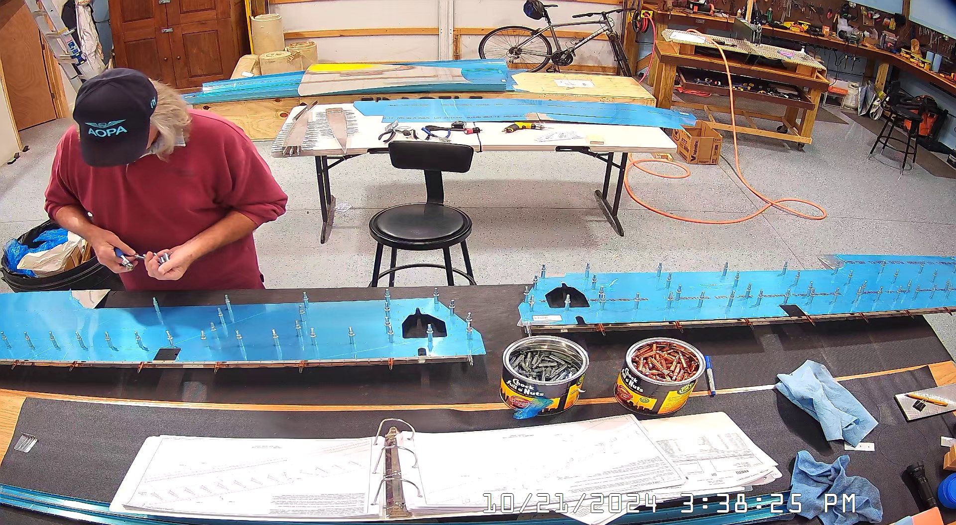 In some places, the manual instructs you to remove the vinyl before clecoing things together. This is not one of those places but I did remove the vinyl on the inside of the elevator skins before clecoing them to the E-1002 front spars per step 3, and the E-905 and E-1008 ribs and stiffeners per page 9-5. I had completed the drilling of the E-910 hinge plates and the 5/8th hole previously so just moved on with attaching the bottom skins to the spars.