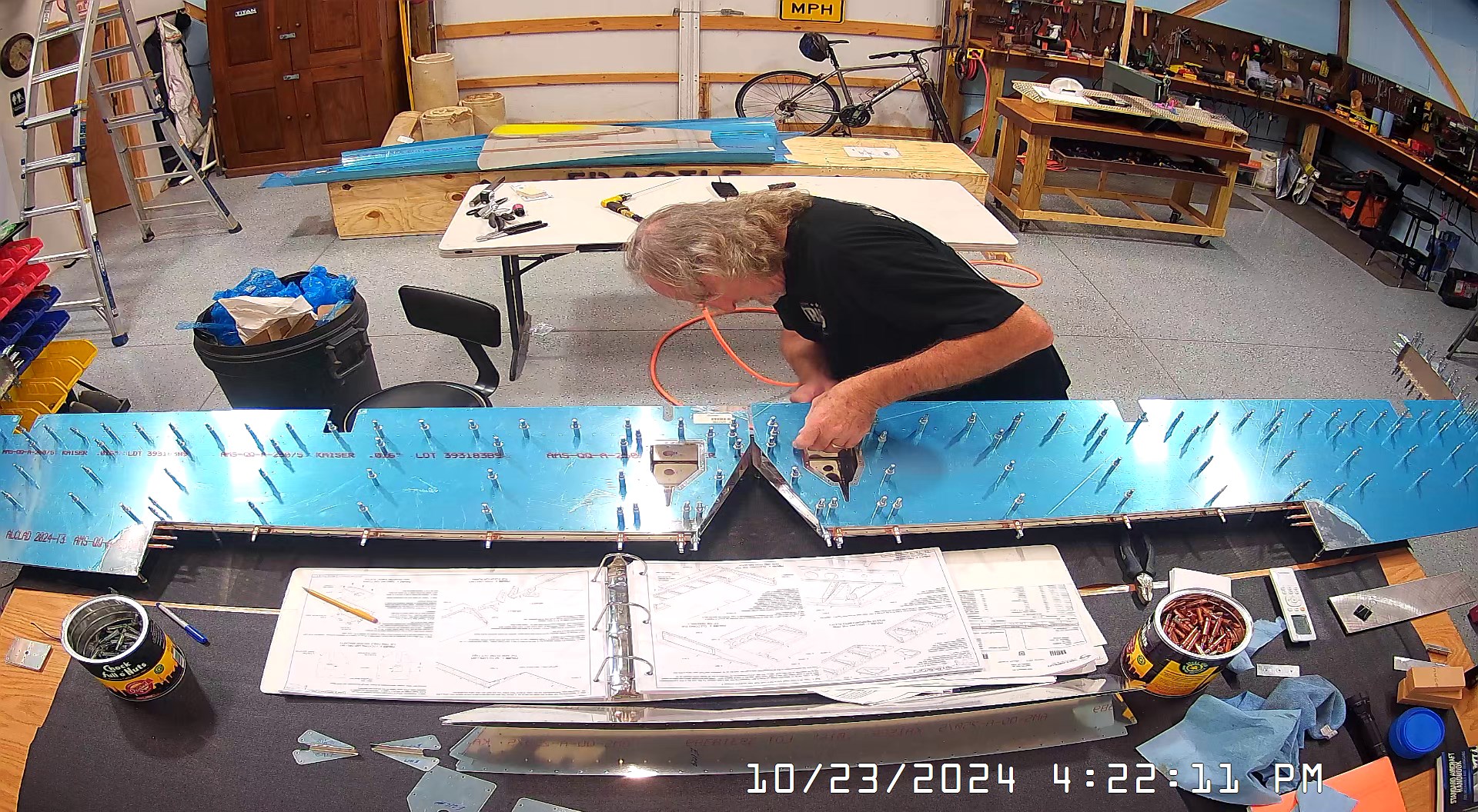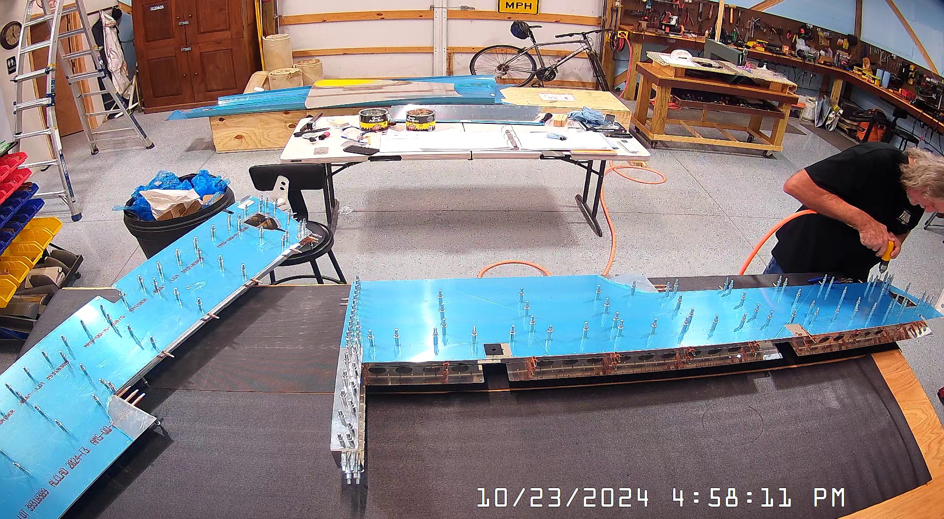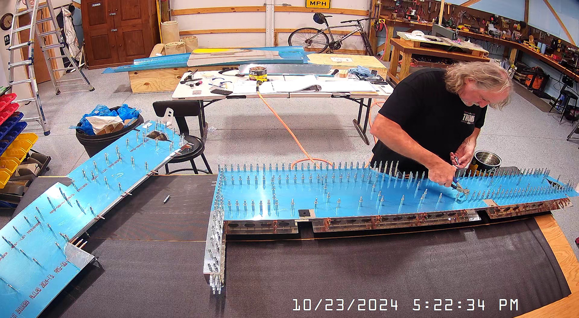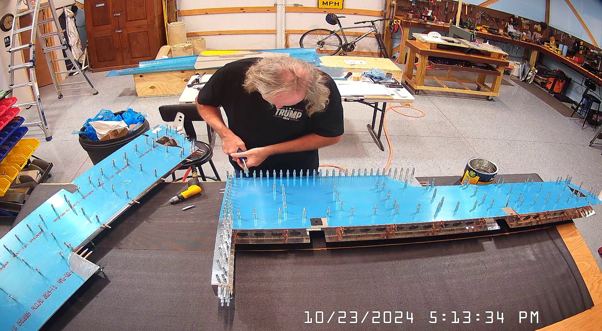 Today I completed steps 7 and 8 on page 9-6 and also steps 1 through 3 on page 9-7. Clecoing all these parts together uses way more than 350 clecos as recommended in the tools required section. As a consequence, you need to move clecos around to observe the instruction to “cleco all holes” when final drilling all the E-1007 and E-1002 spar holes through the skin. Particularly if you have clecos in the trailing edge.