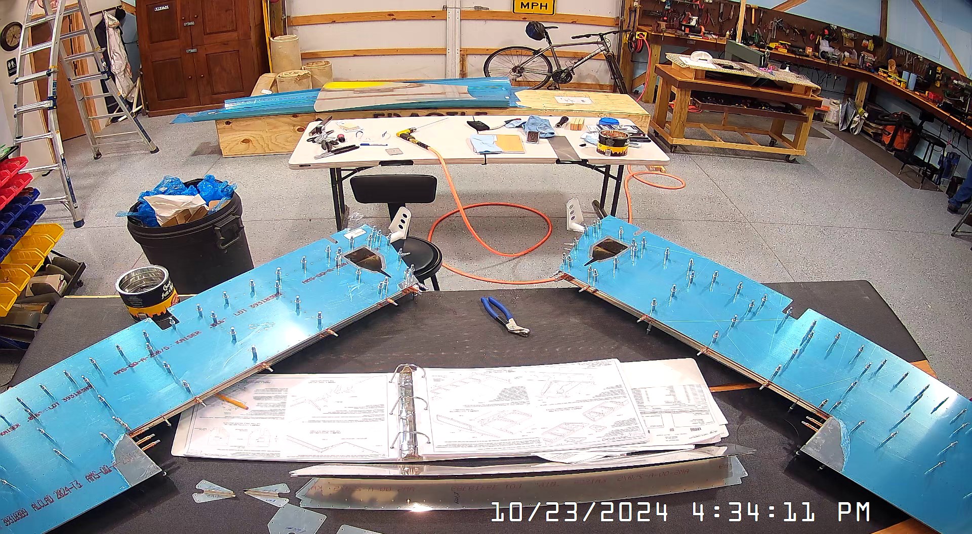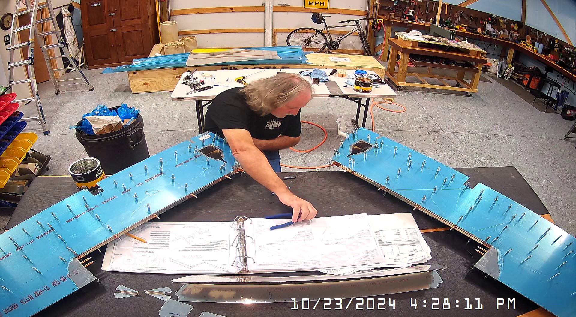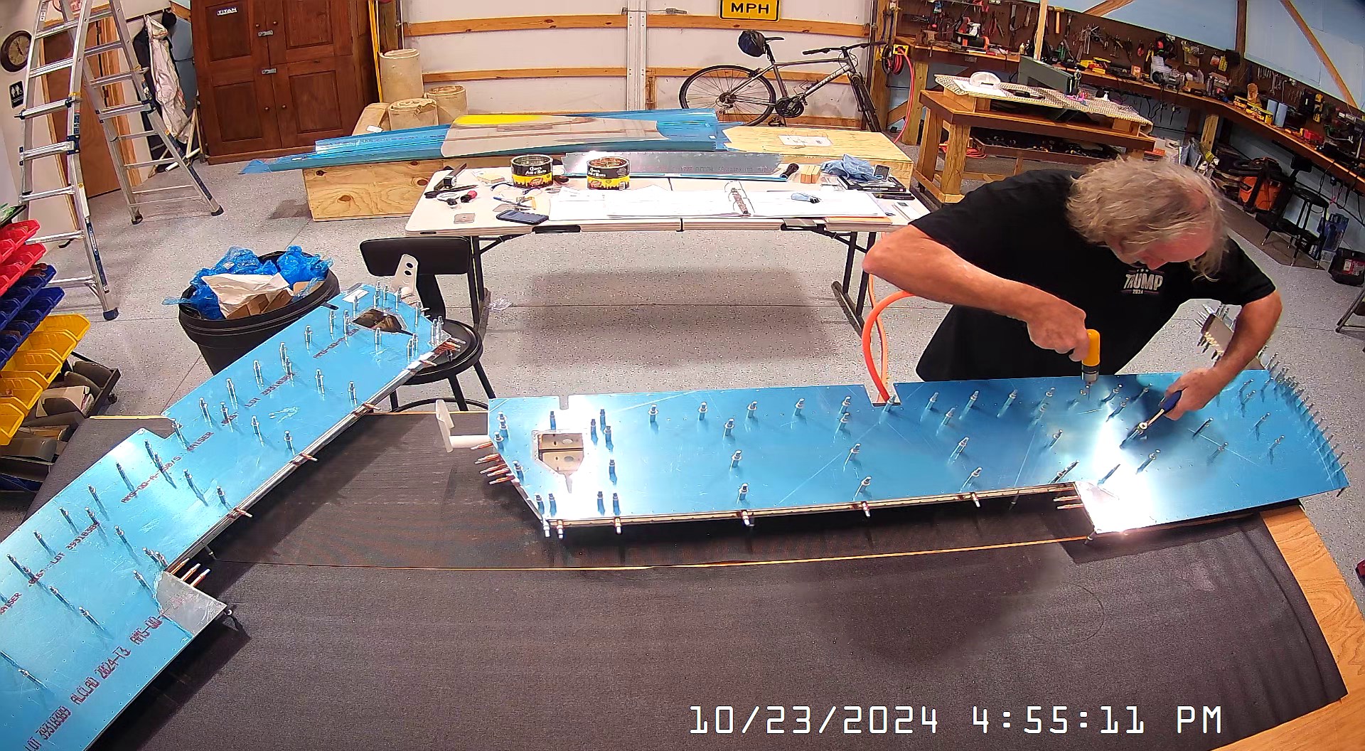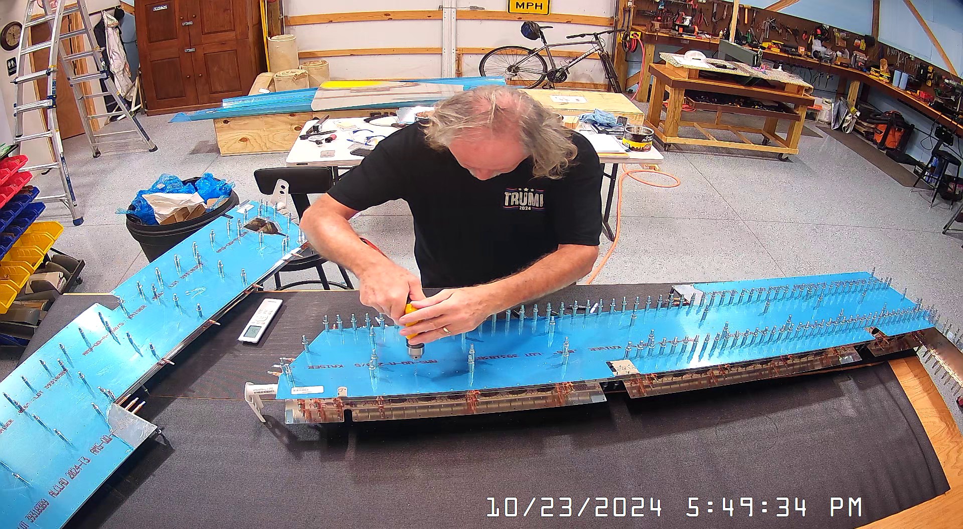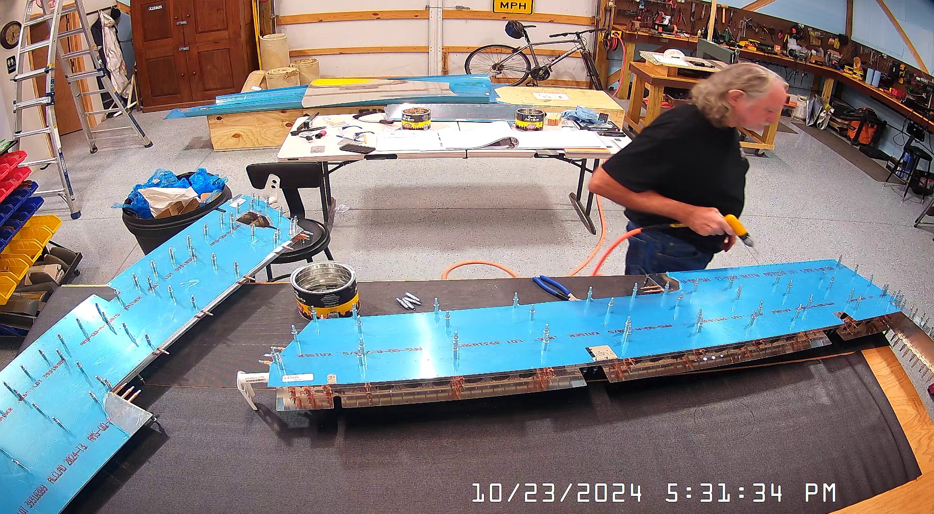 Today I completed steps 7 and 8 on page 9-6 and also steps 1 through 3 on page 9-7. Clecoing all these parts together uses way more than 350 clecos as recommended in the tools required section. As a consequence, you need to move clecos around to observe the instruction to “cleco all holes” when final drilling all the E-1007 and E-1002 spar holes through the skin. Particularly if you have clecos in the trailing edge.