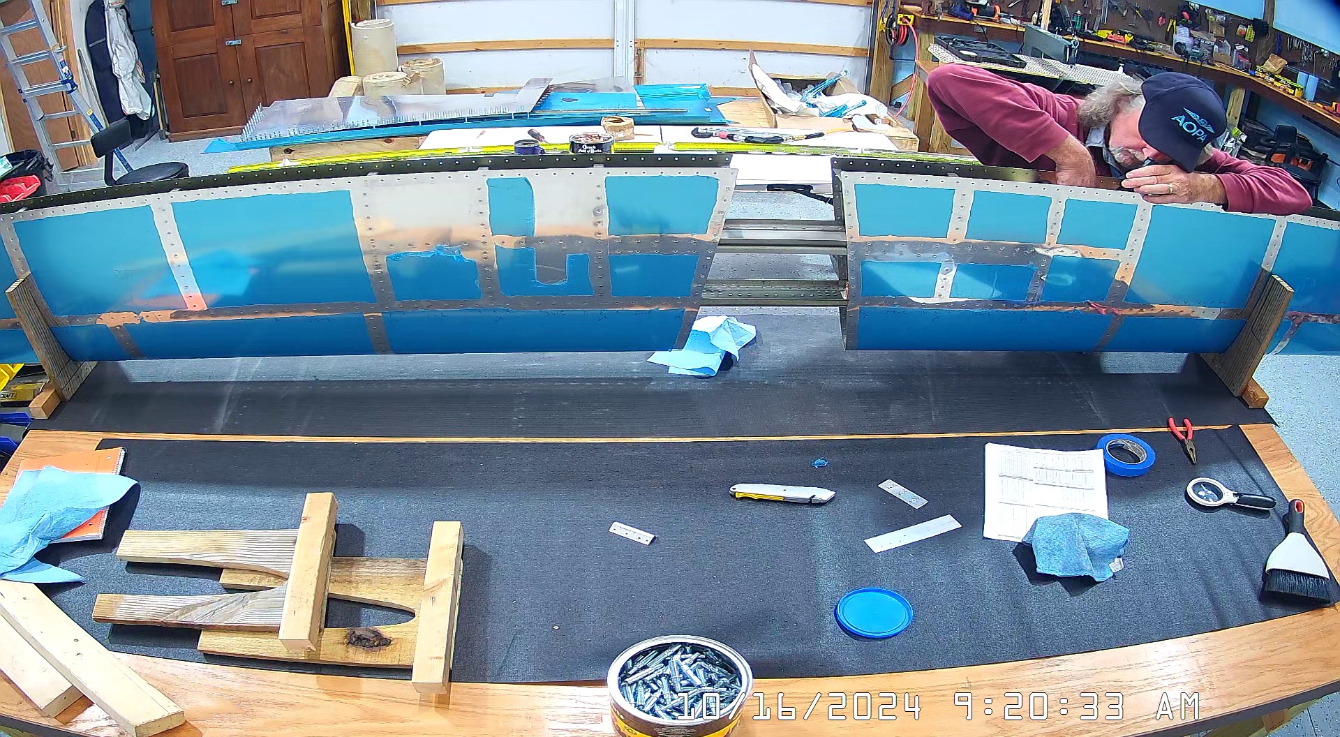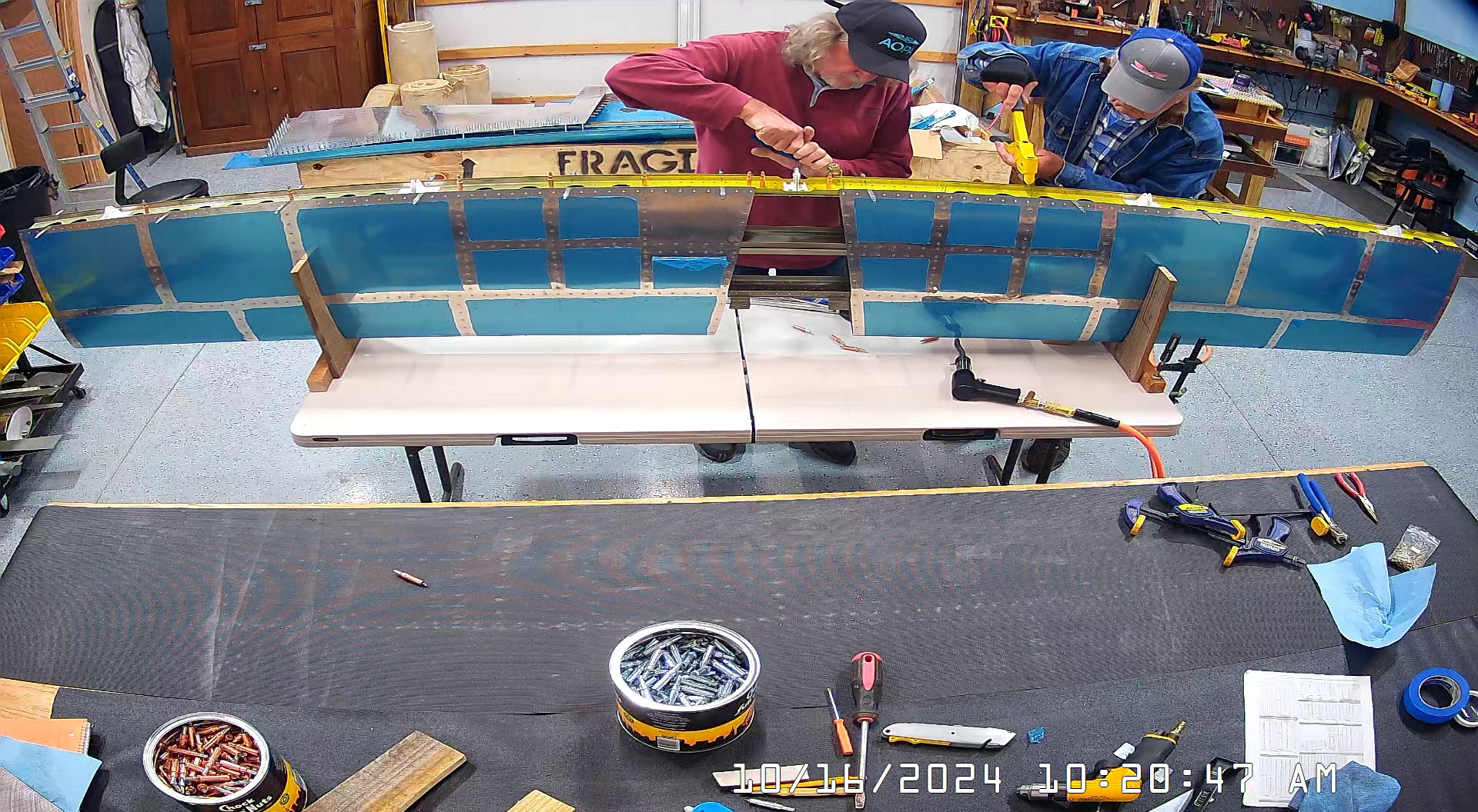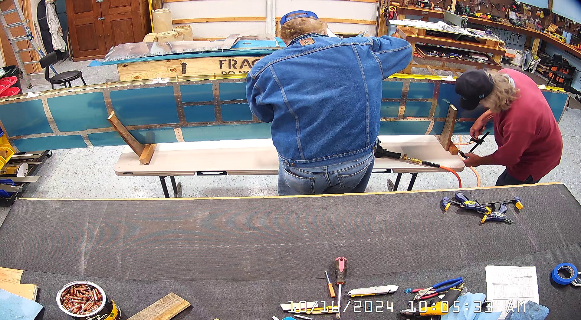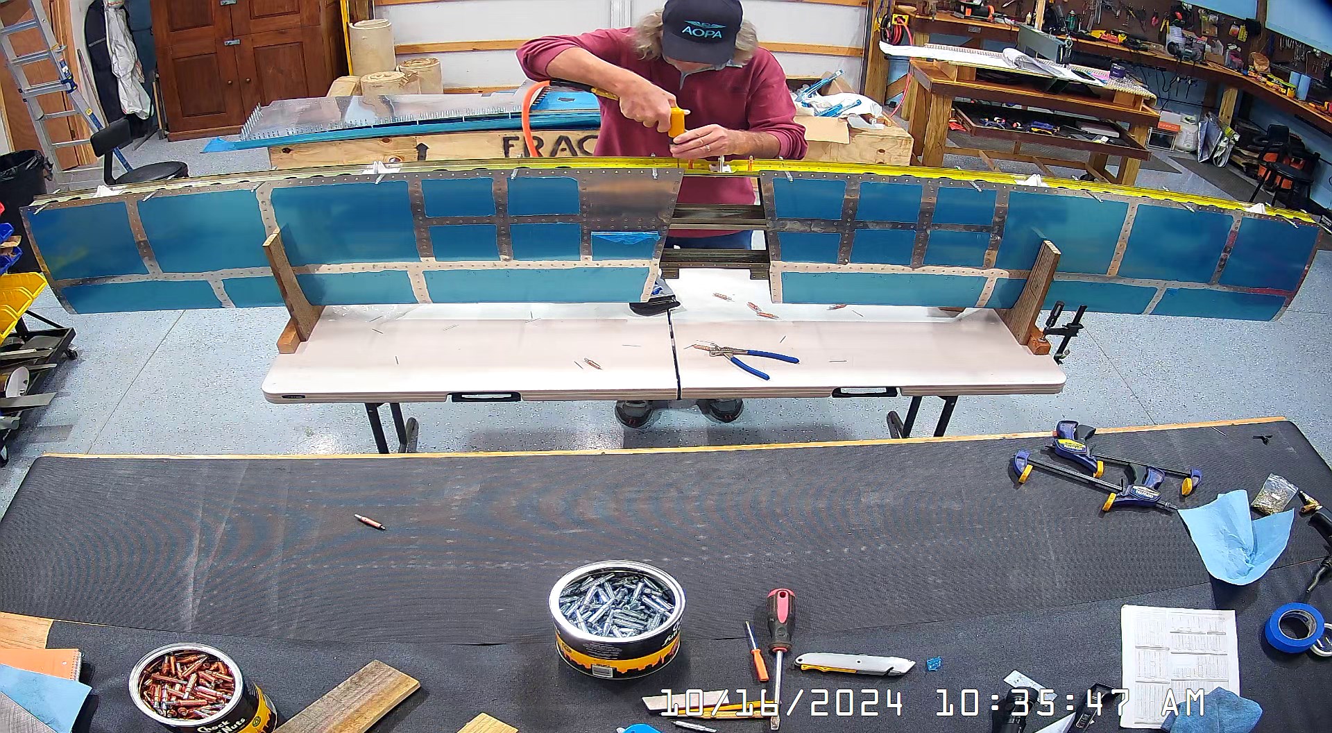 I was able to ascertain that the rivets were consistent and set so I set a few more rivets and then when EJ showed up we moved it to a lowed table for the riveting of the rear spar. The 8 x 4 bench would have probably been OK had I not put 3″ wheels on it. Generally it’s a good height for us, but I am going to remove the wheels and cut 3″ off the legs to move it down a bit.