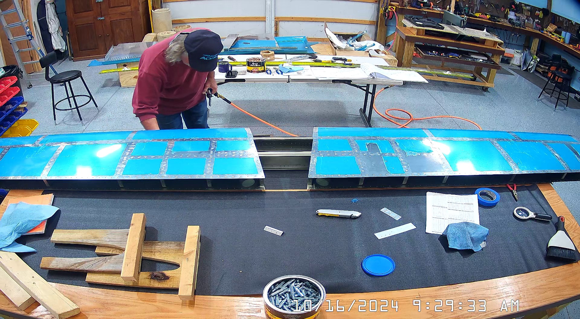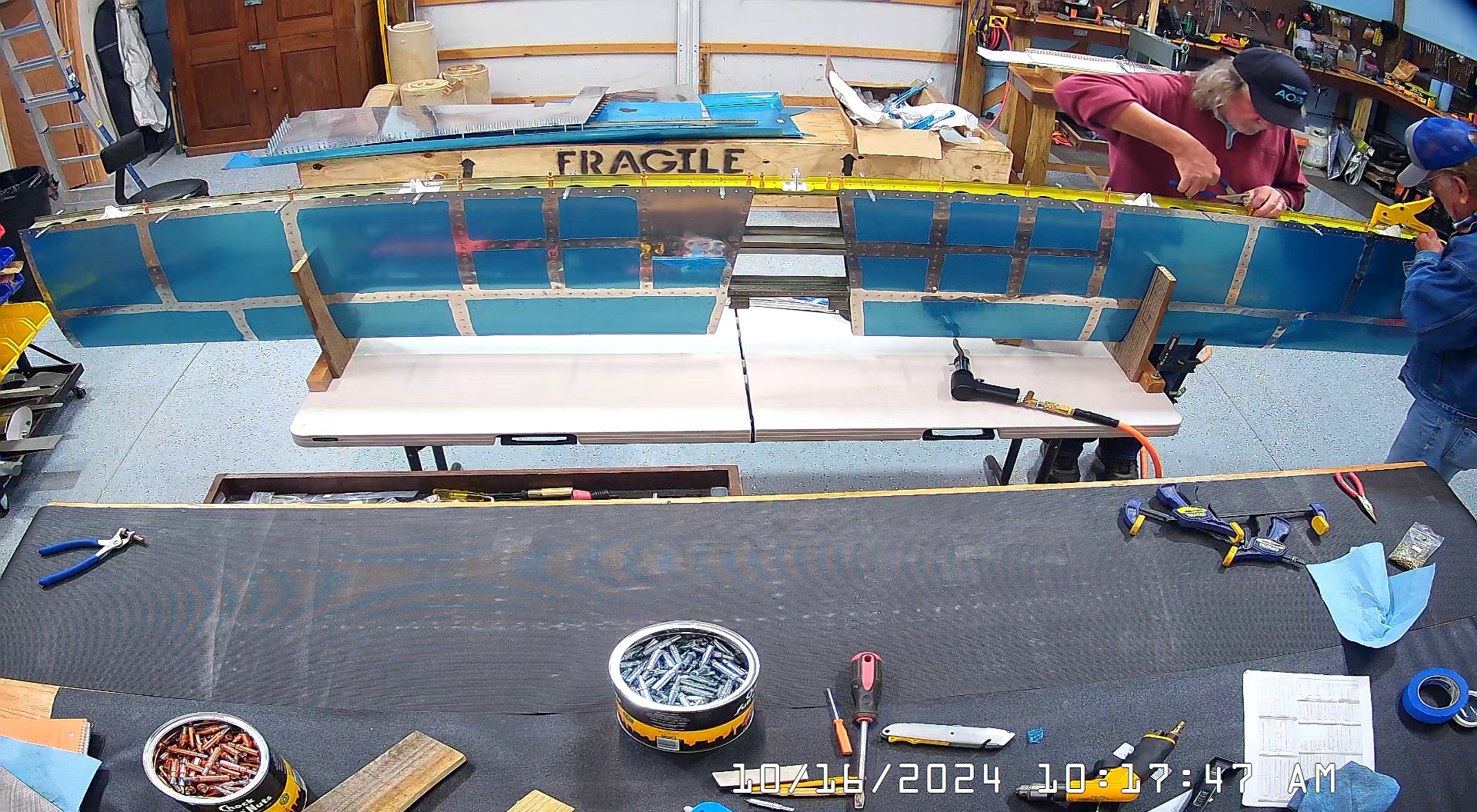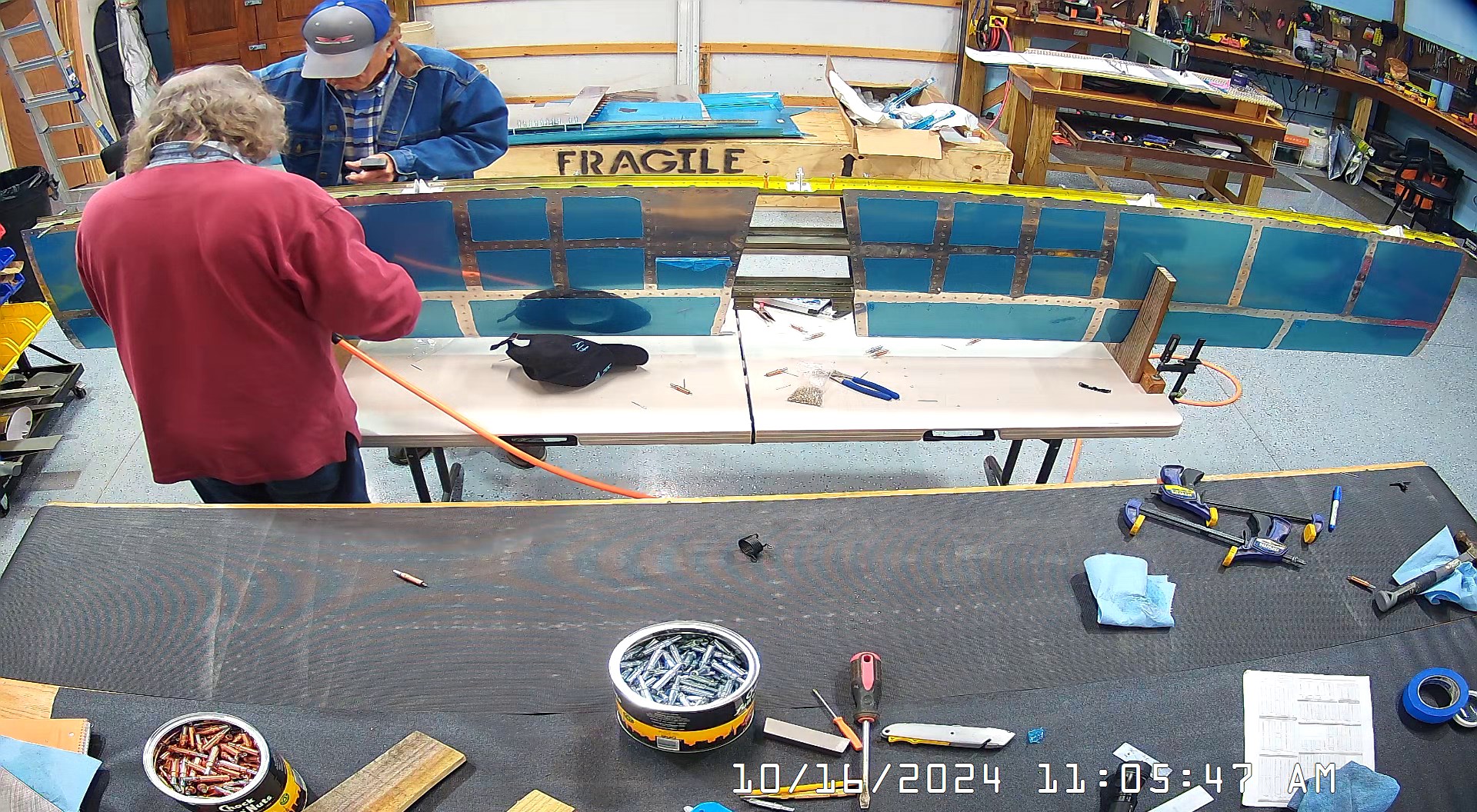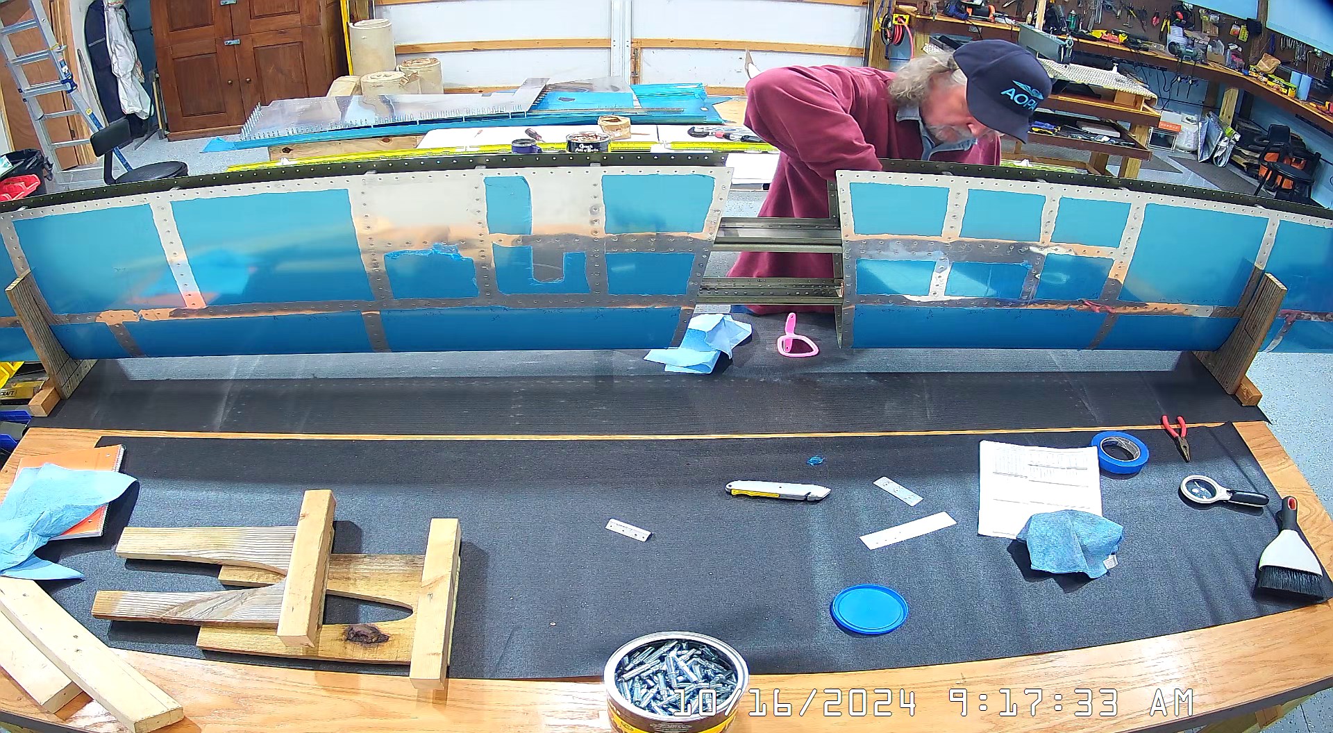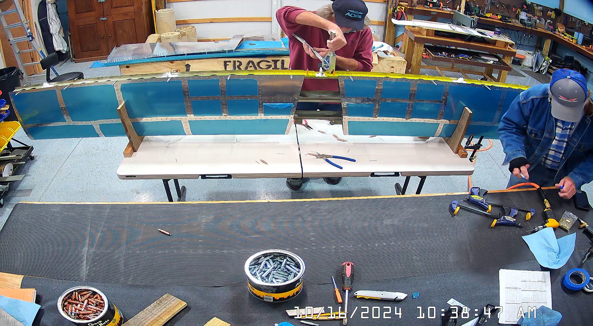 I was able to ascertain that the rivets were consistent and set so I set a few more rivets and then when EJ showed up we moved it to a lowed table for the riveting of the rear spar. The 8 x 4 bench would have probably been OK had I not put 3″ wheels on it. Generally it’s a good height for us, but I am going to remove the wheels and cut 3″ off the legs to move it down a bit.