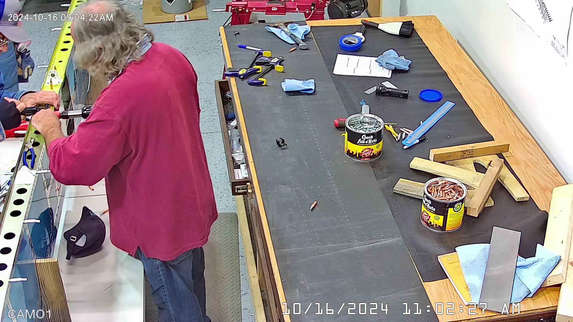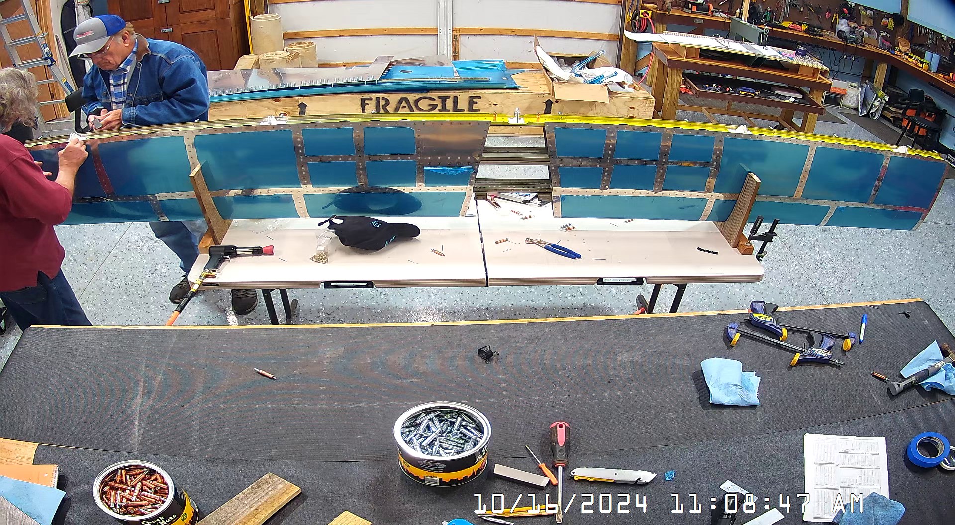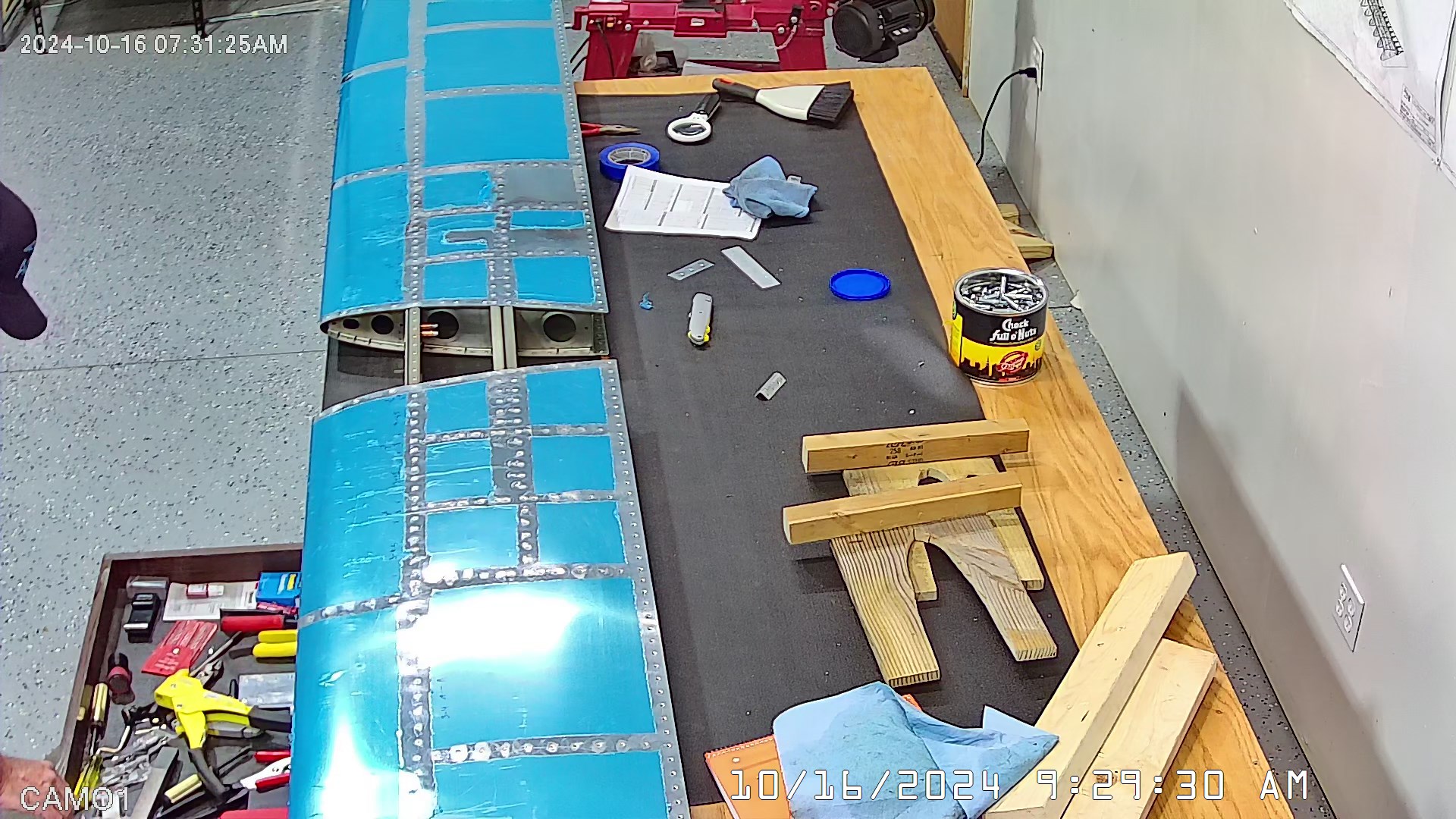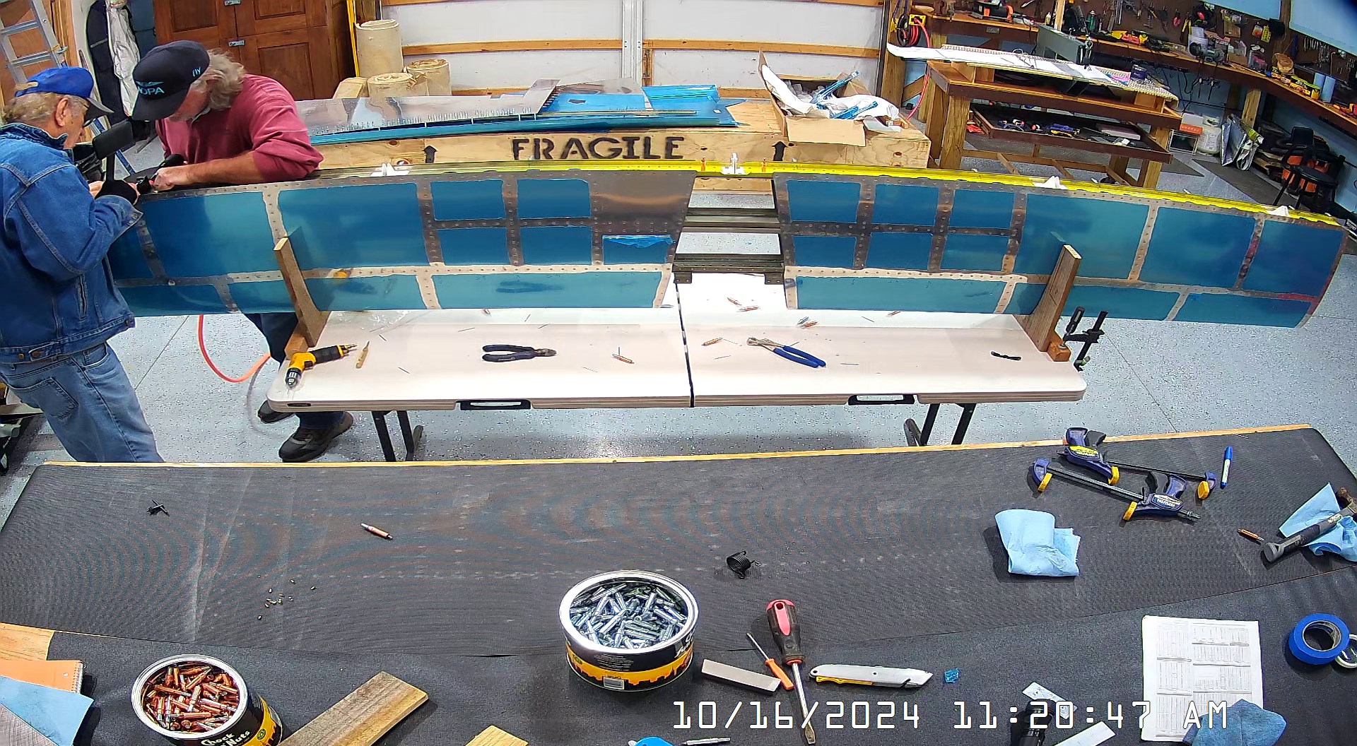 I was able to ascertain that the rivets were consistent and set so I set a few more rivets and then when EJ showed up we moved it to a lowed table for the riveting of the rear spar. The 8 x 4 bench would have probably been OK had I not put 3″ wheels on it. Generally it’s a good height for us, but I am going to remove the wheels and cut 3″ off the legs to move it down a bit.