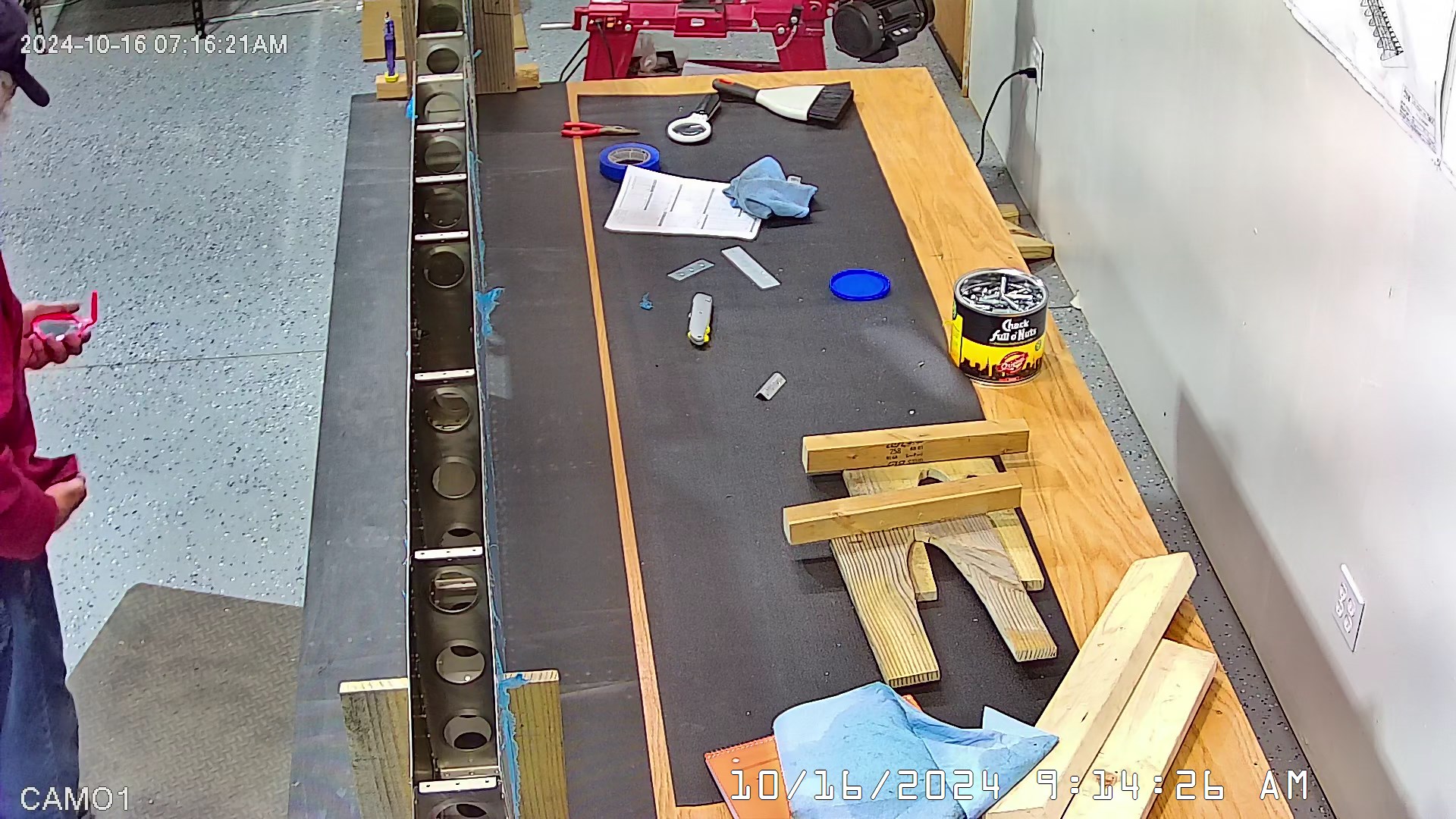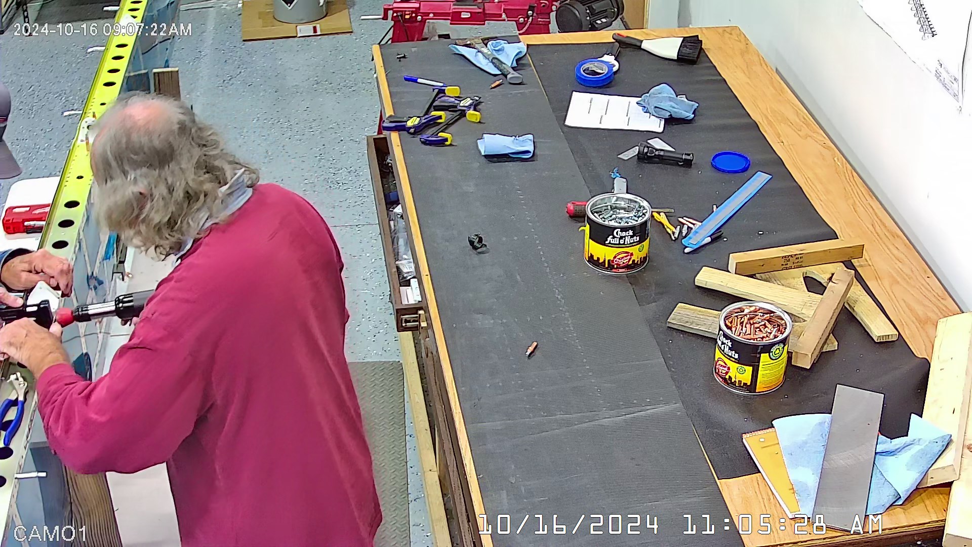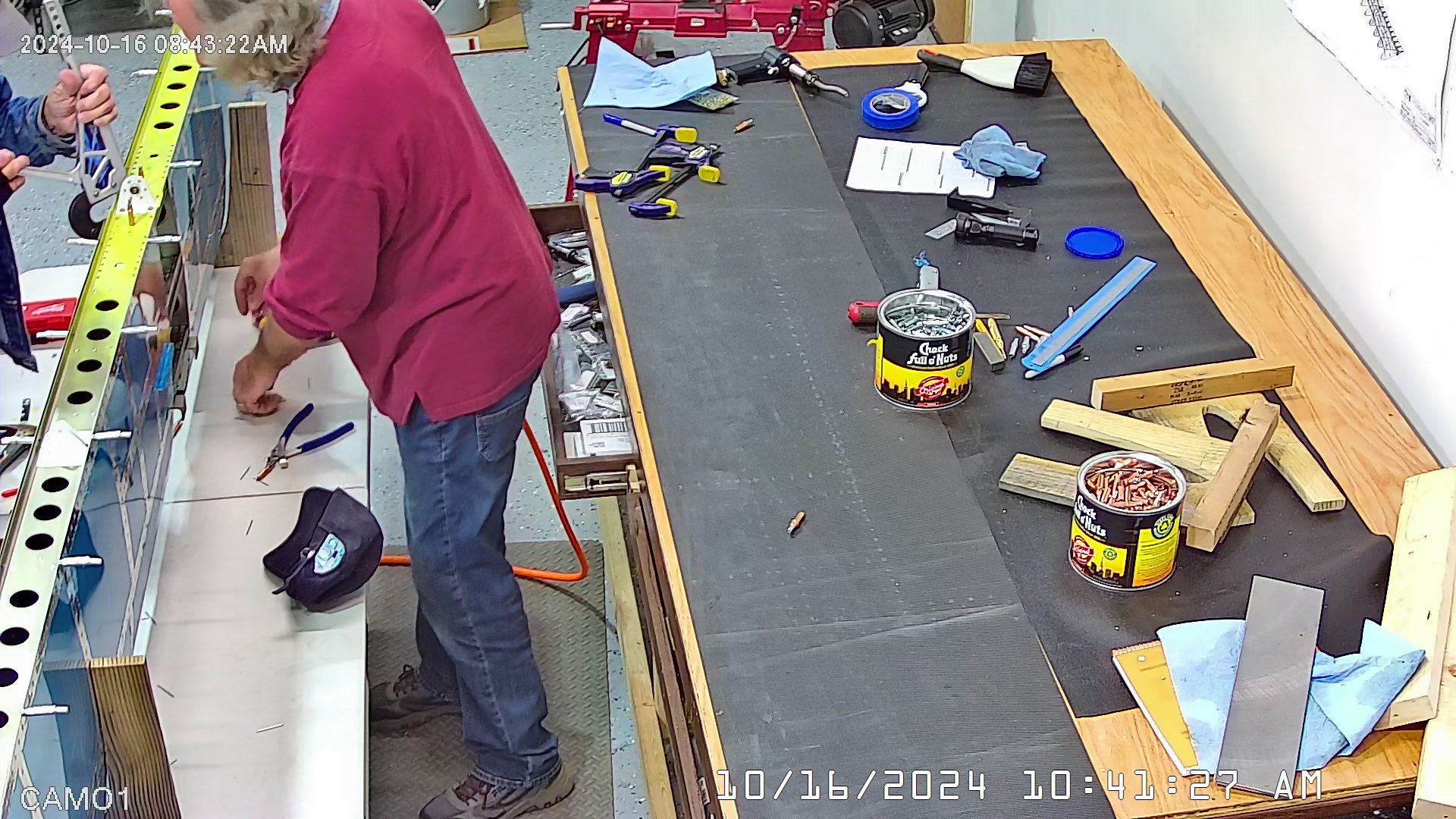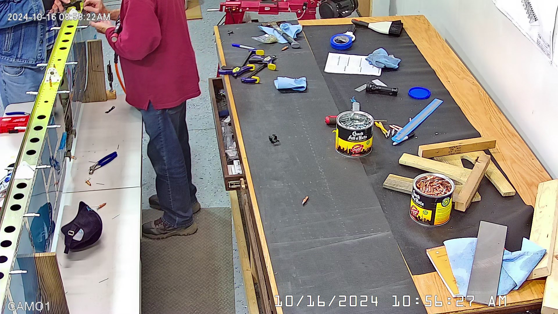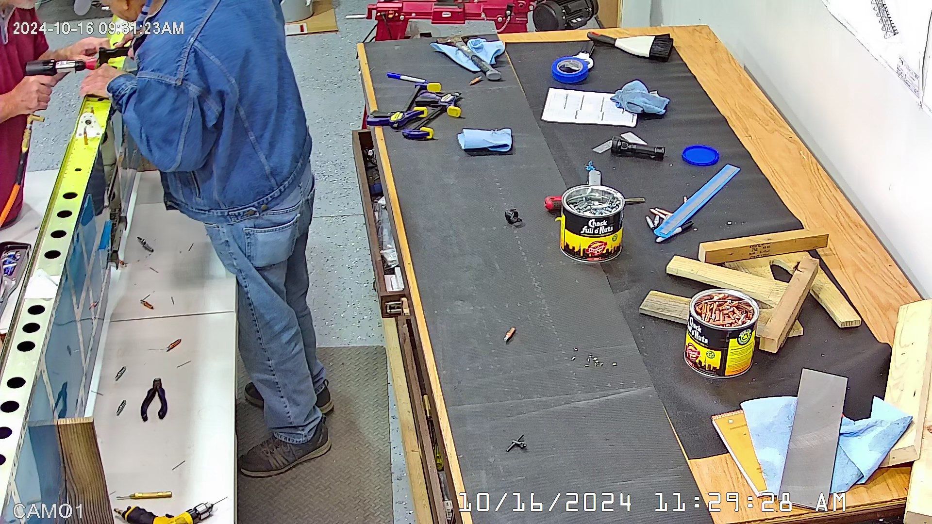 I was able to ascertain that the rivets were consistent and set so I set a few more rivets and then when EJ showed up we moved it to a lowed table for the riveting of the rear spar. The 8 x 4 bench would have probably been OK had I not put 3″ wheels on it. Generally it’s a good height for us, but I am going to remove the wheels and cut 3″ off the legs to move it down a bit.