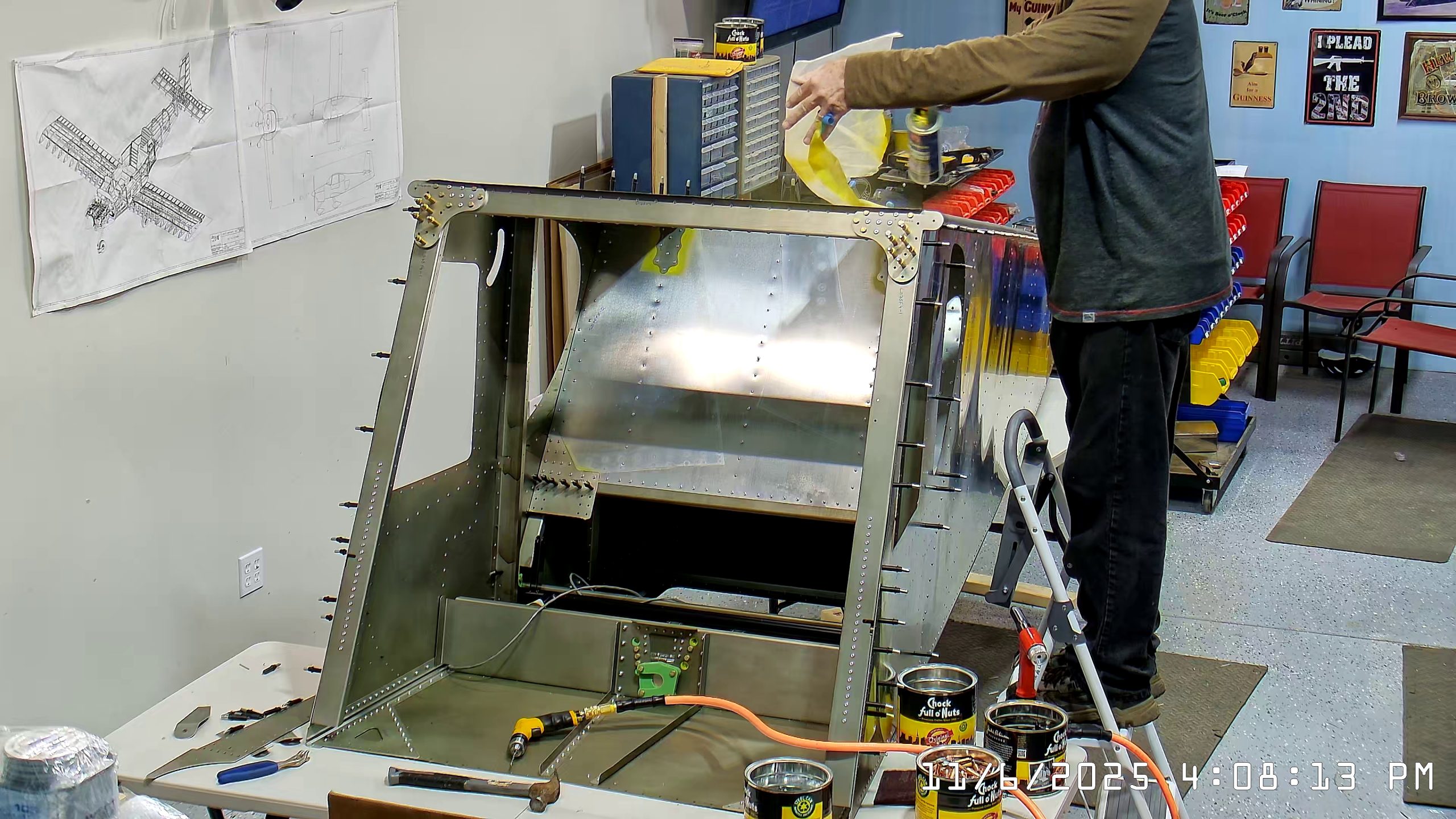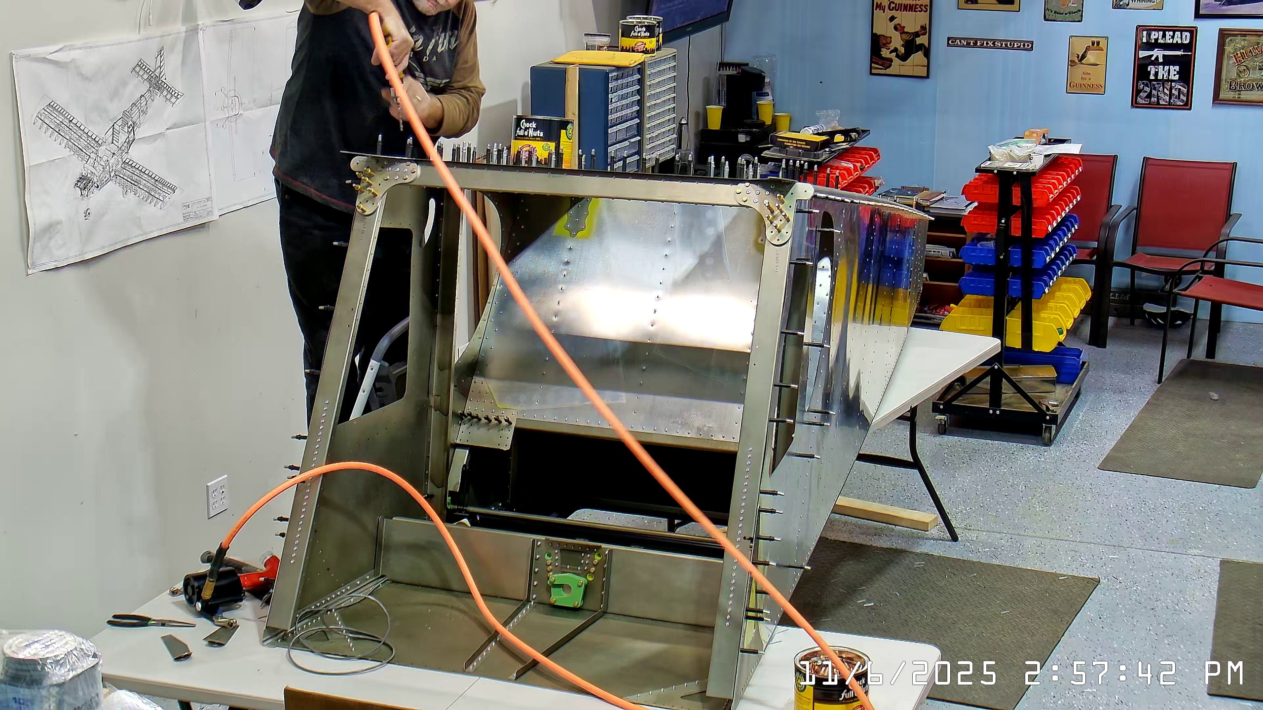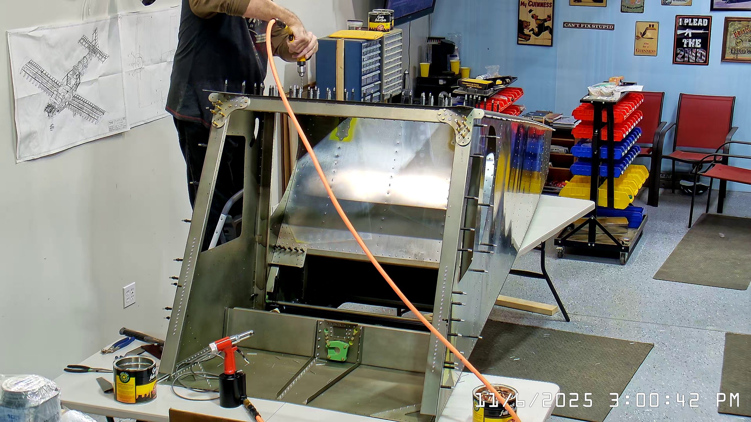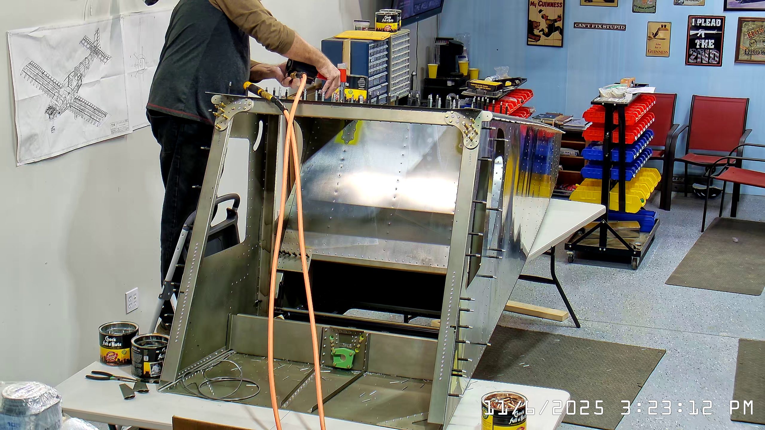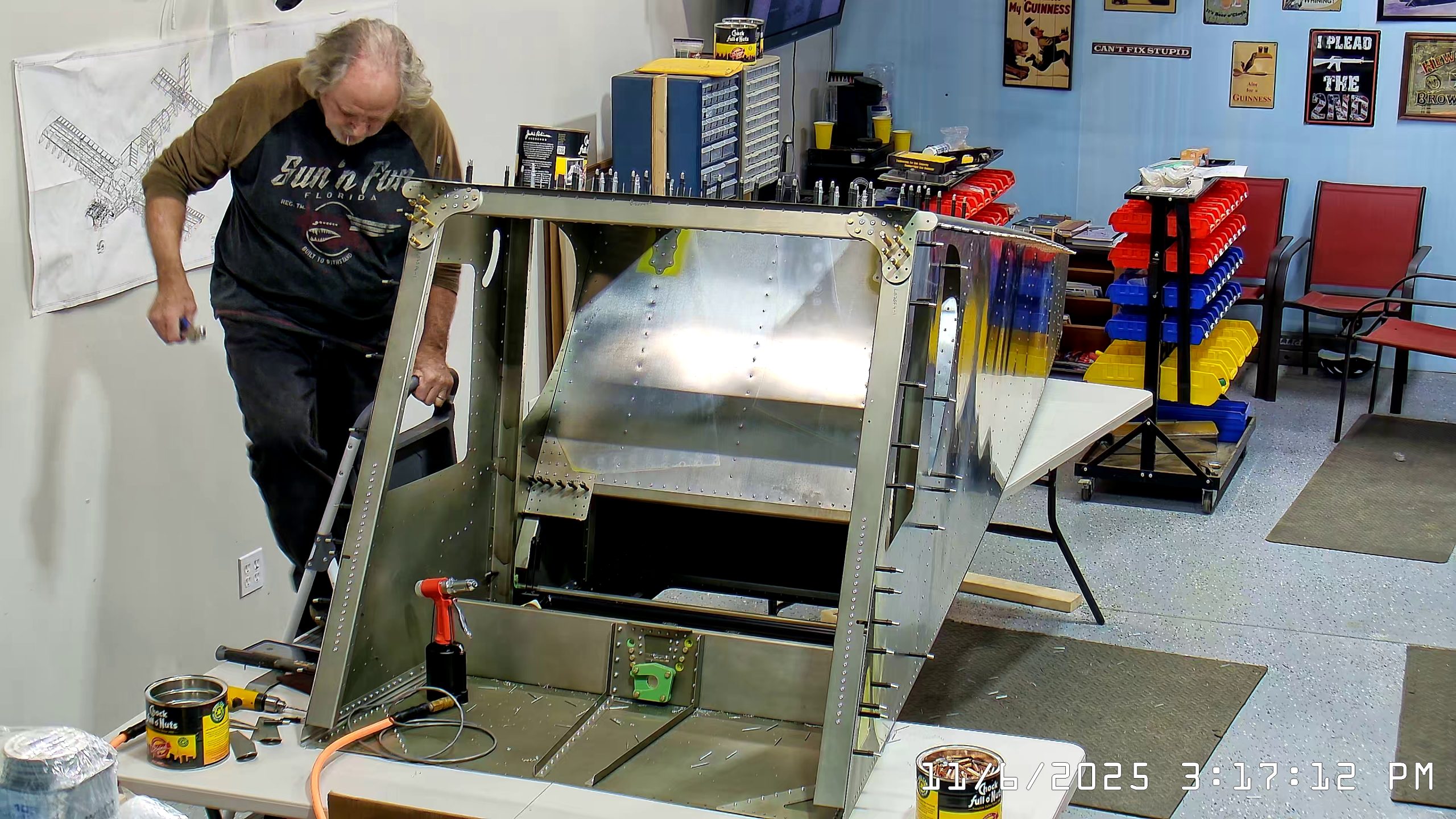 At this point the IPL file indicates that the next step is to rivet the side skins to the top longerons. The longerons go between the side skin and any internal vertical L angles or others.