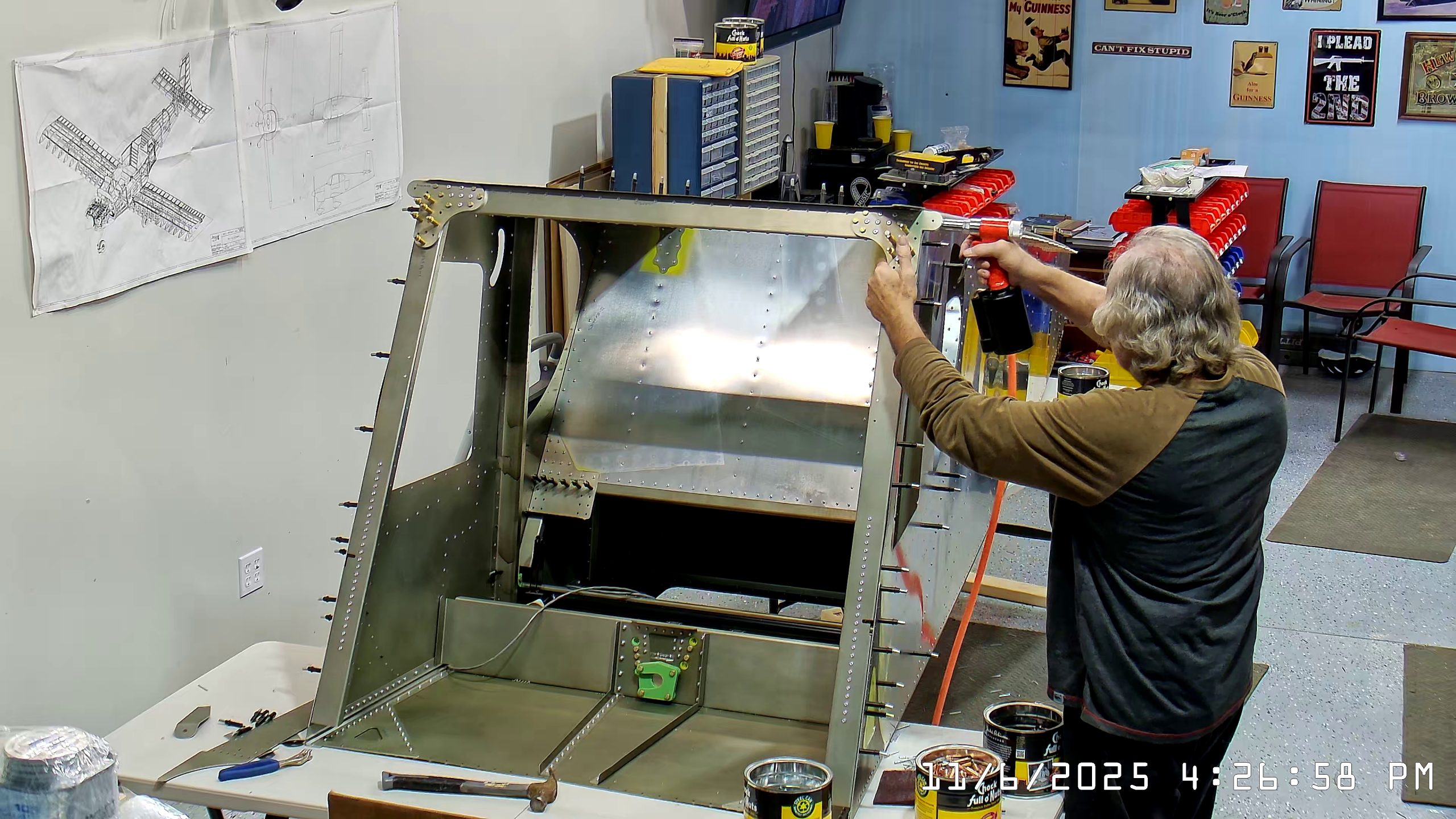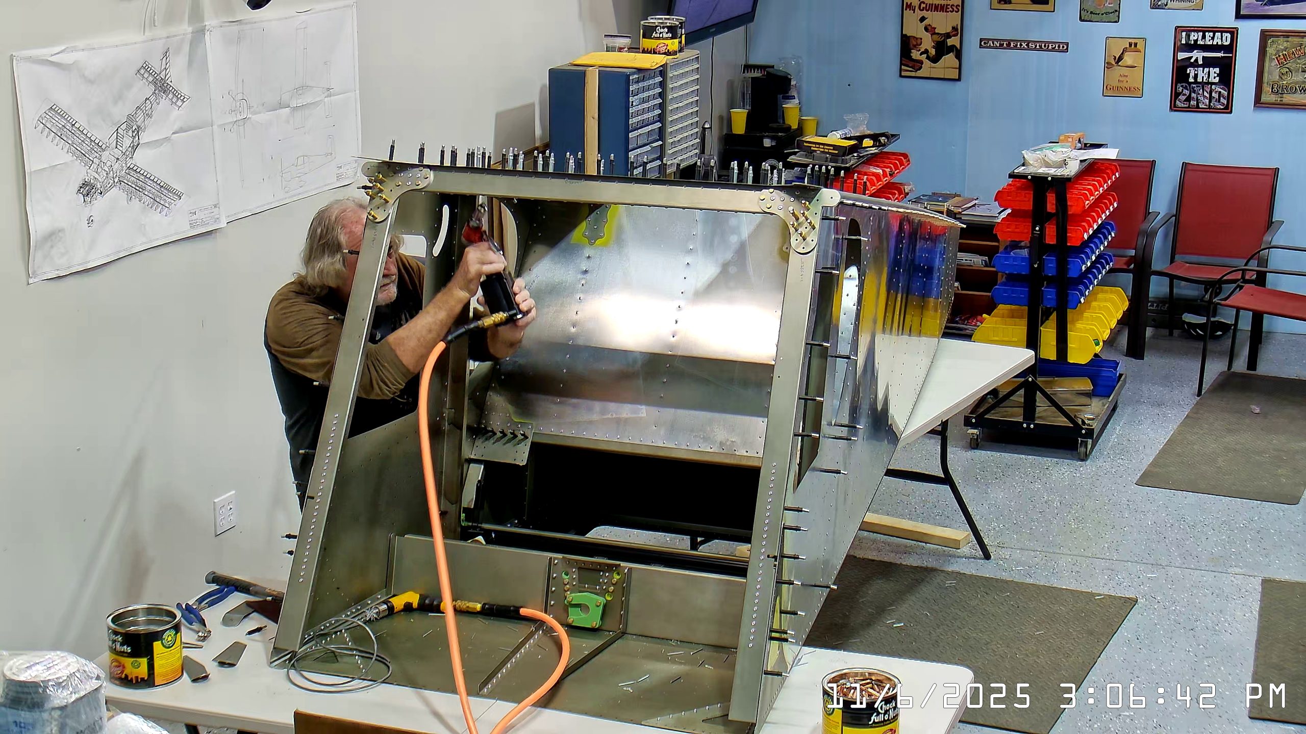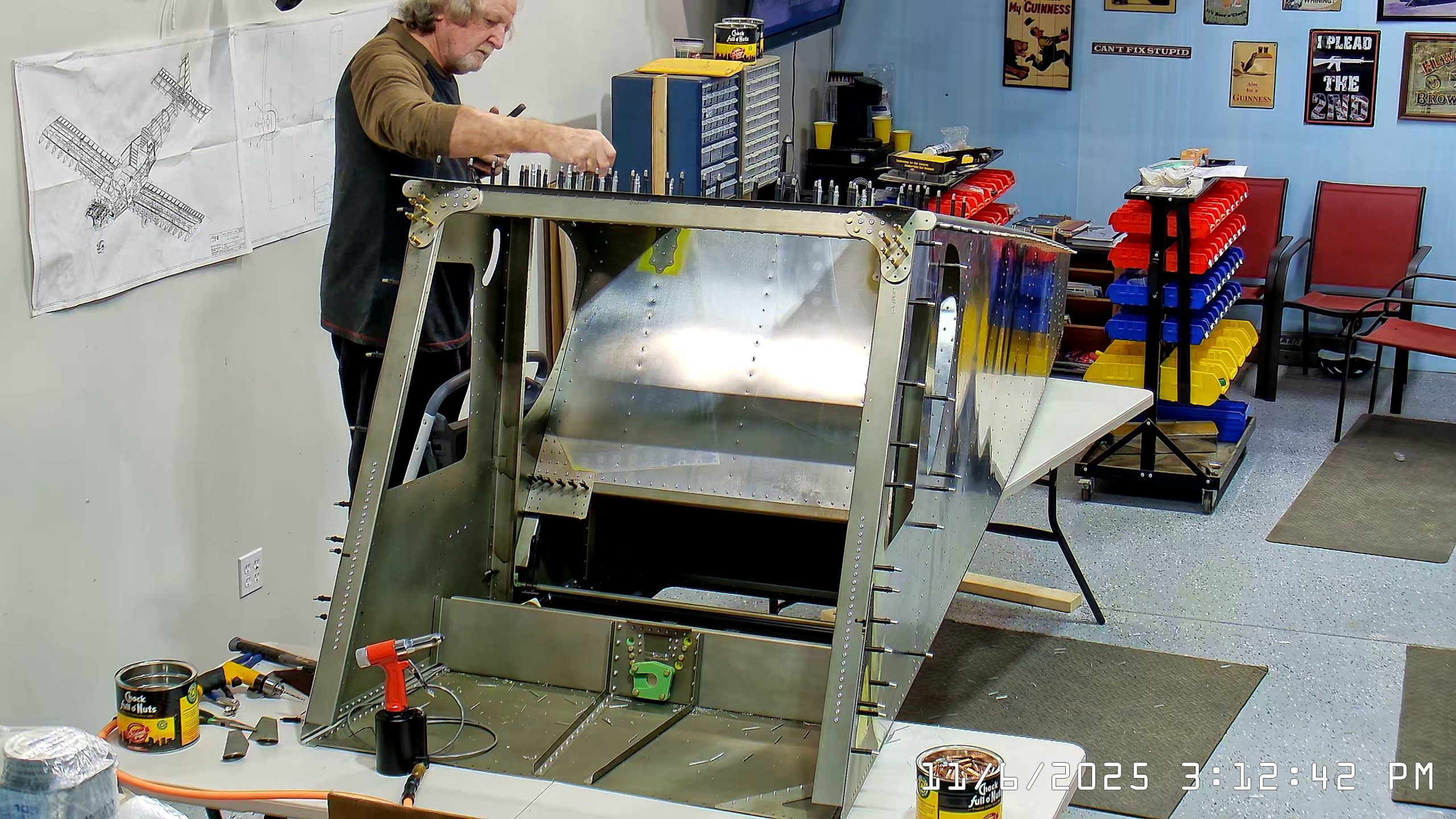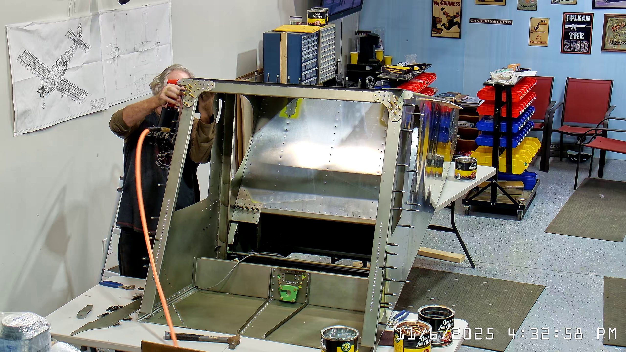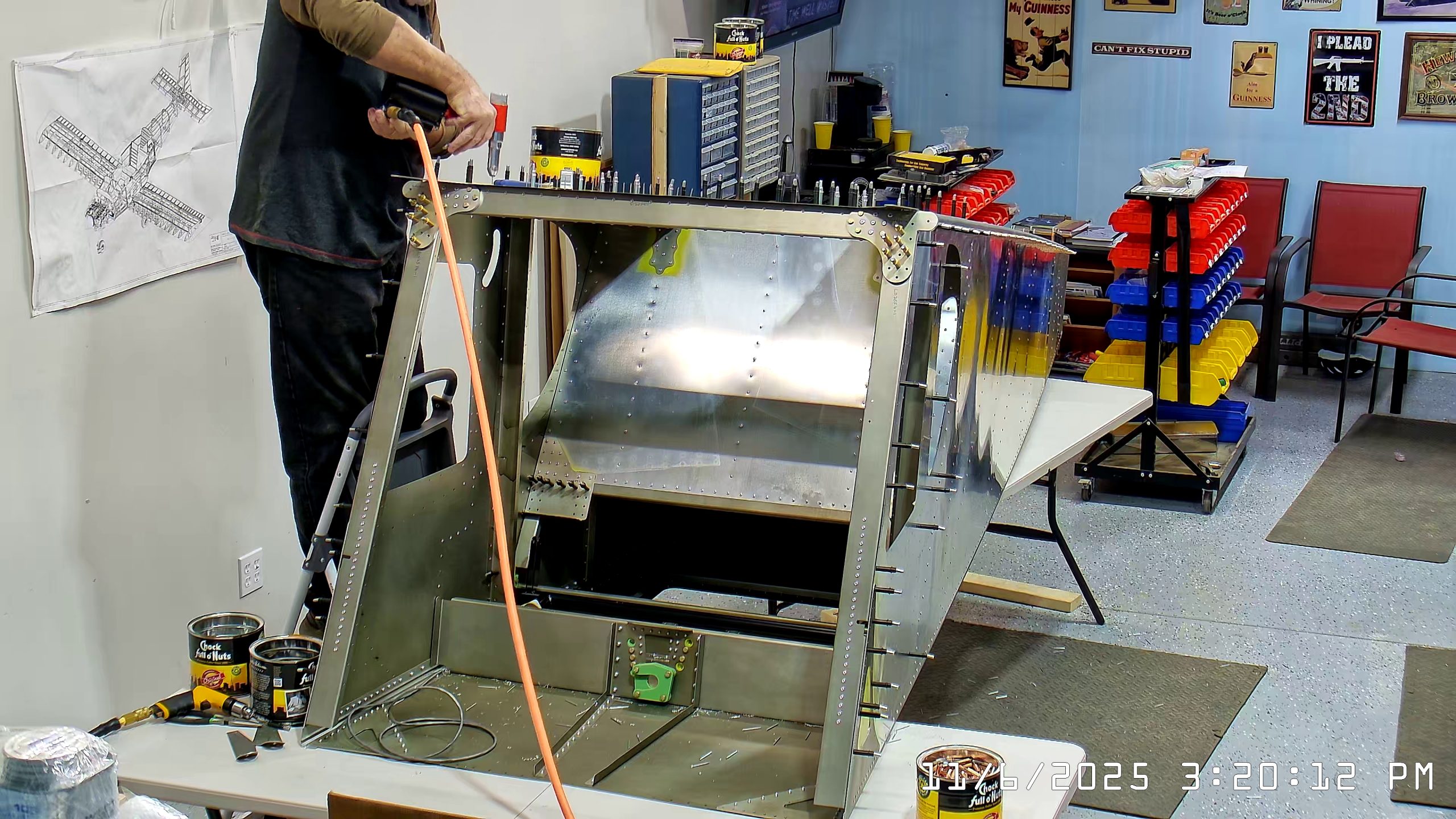 At this point the IPL file indicates that the next step is to rivet the side skins to the top longerons. The longerons go between the side skin and any internal vertical L angles or others.