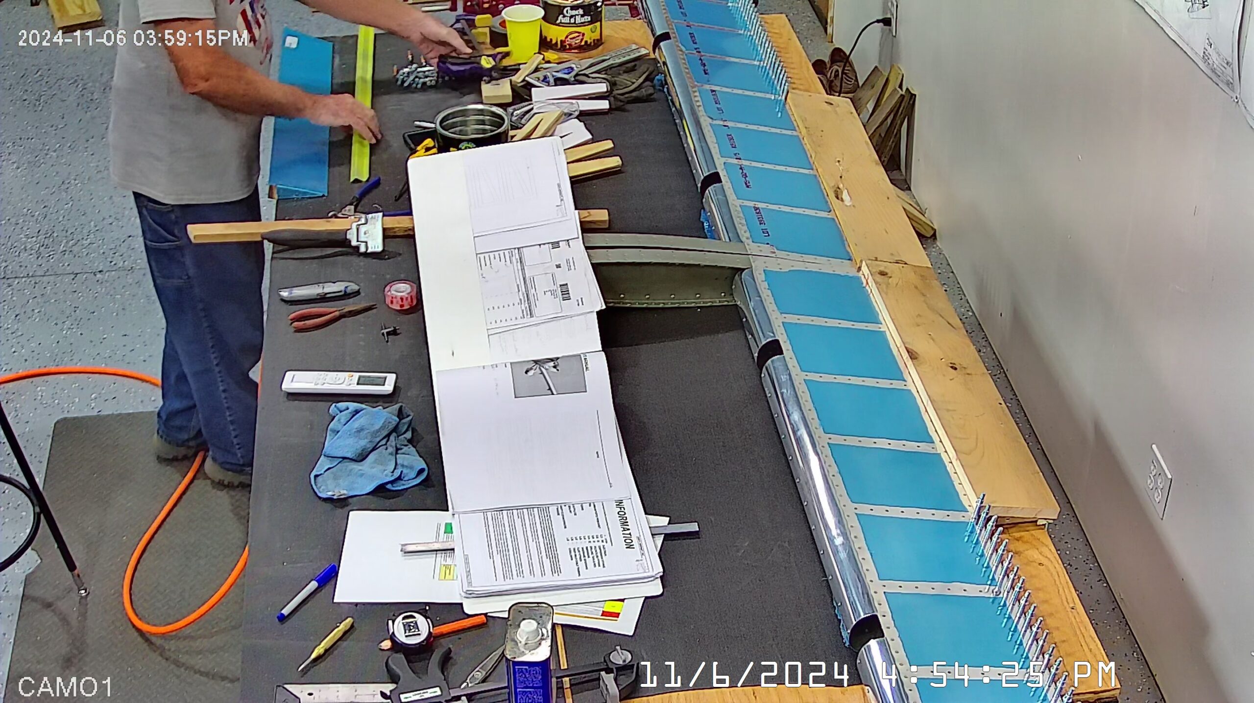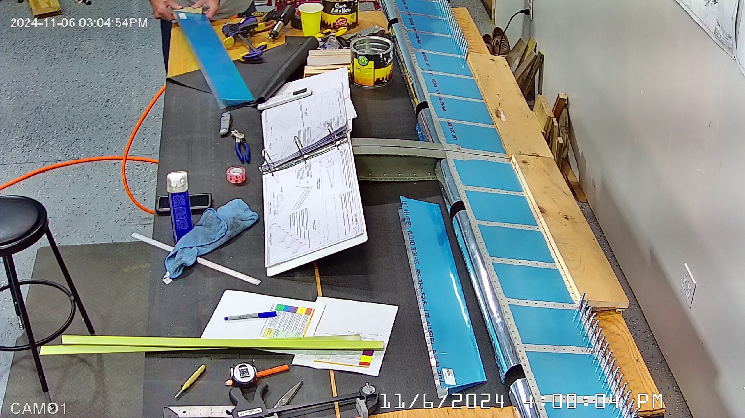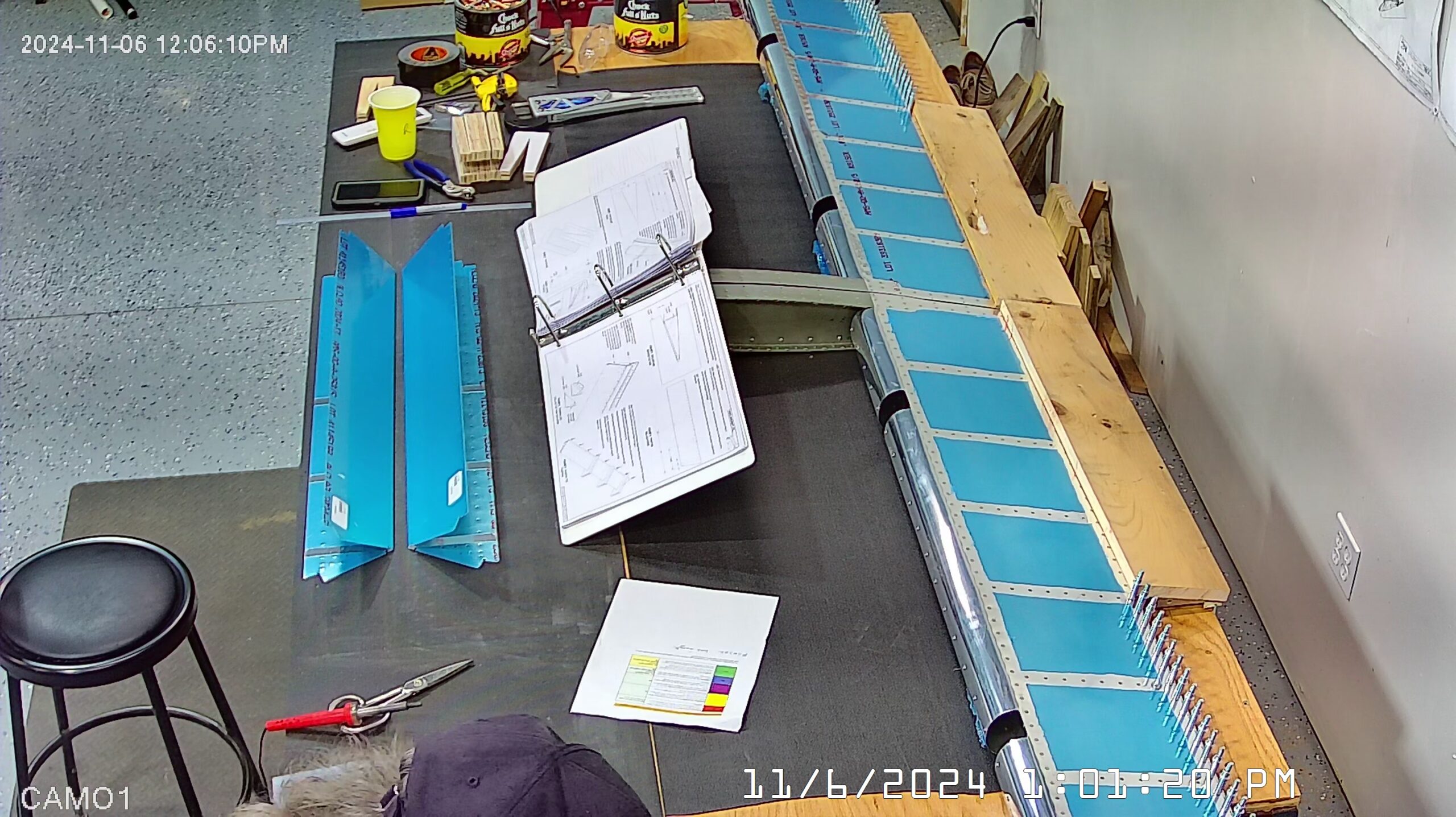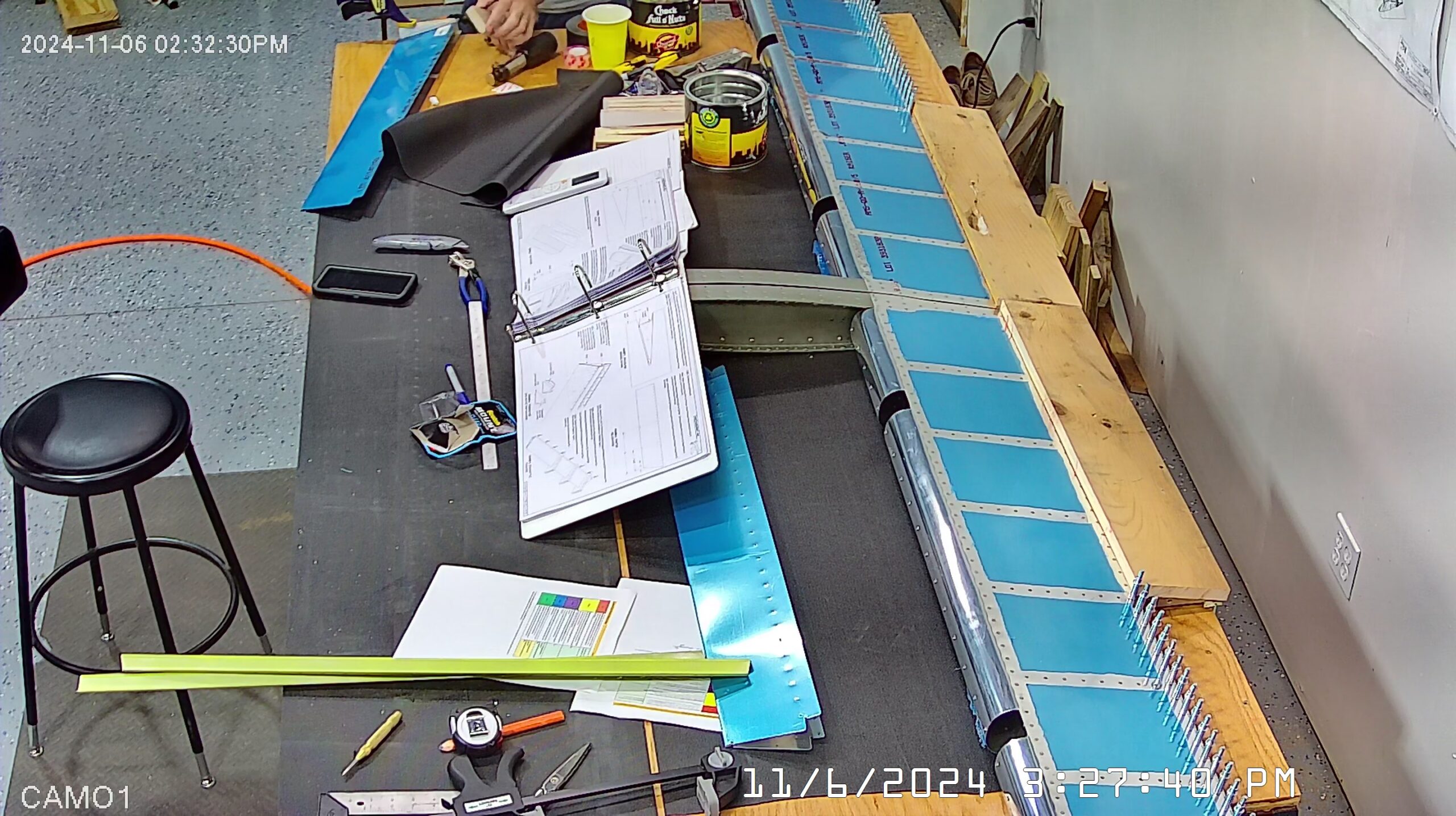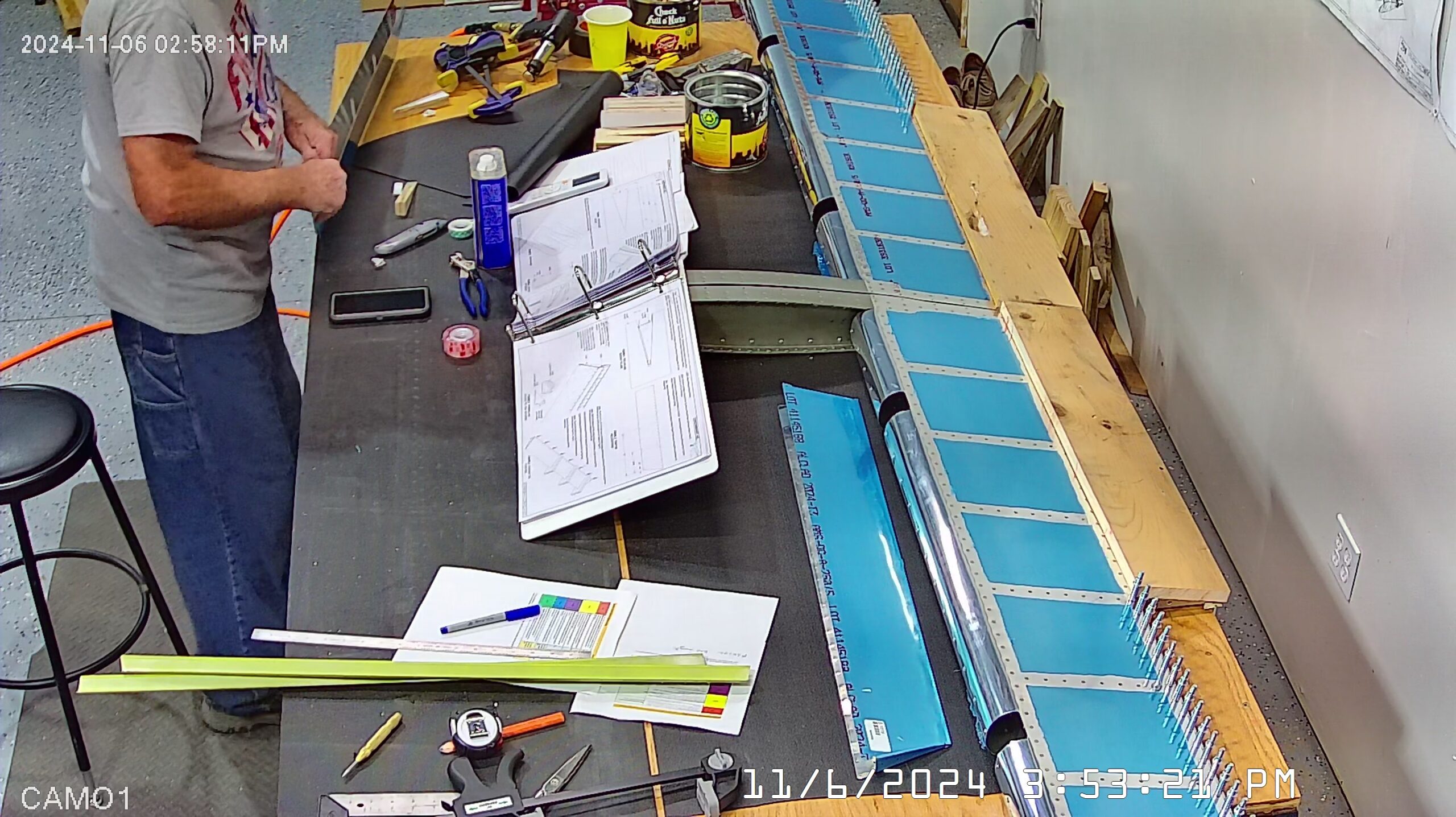 You want to be sure to do the scuffing and cleaning inside the tabs before you final bend them to the correct profile because otherwise it will be extremely difficult to do, and also make sure you final bend the skins before you bend the closing tabs on either end. Bending the closing tabs is no big deal but the double sided tape I used was a nightmare to remove so I switched to some double sided hang up tabs. Once you have the sides bent you need to clamp them in place so that you can match drill the rivet holes on the inner tab (lower skin bent up should be inside the upper skin bent down tab).