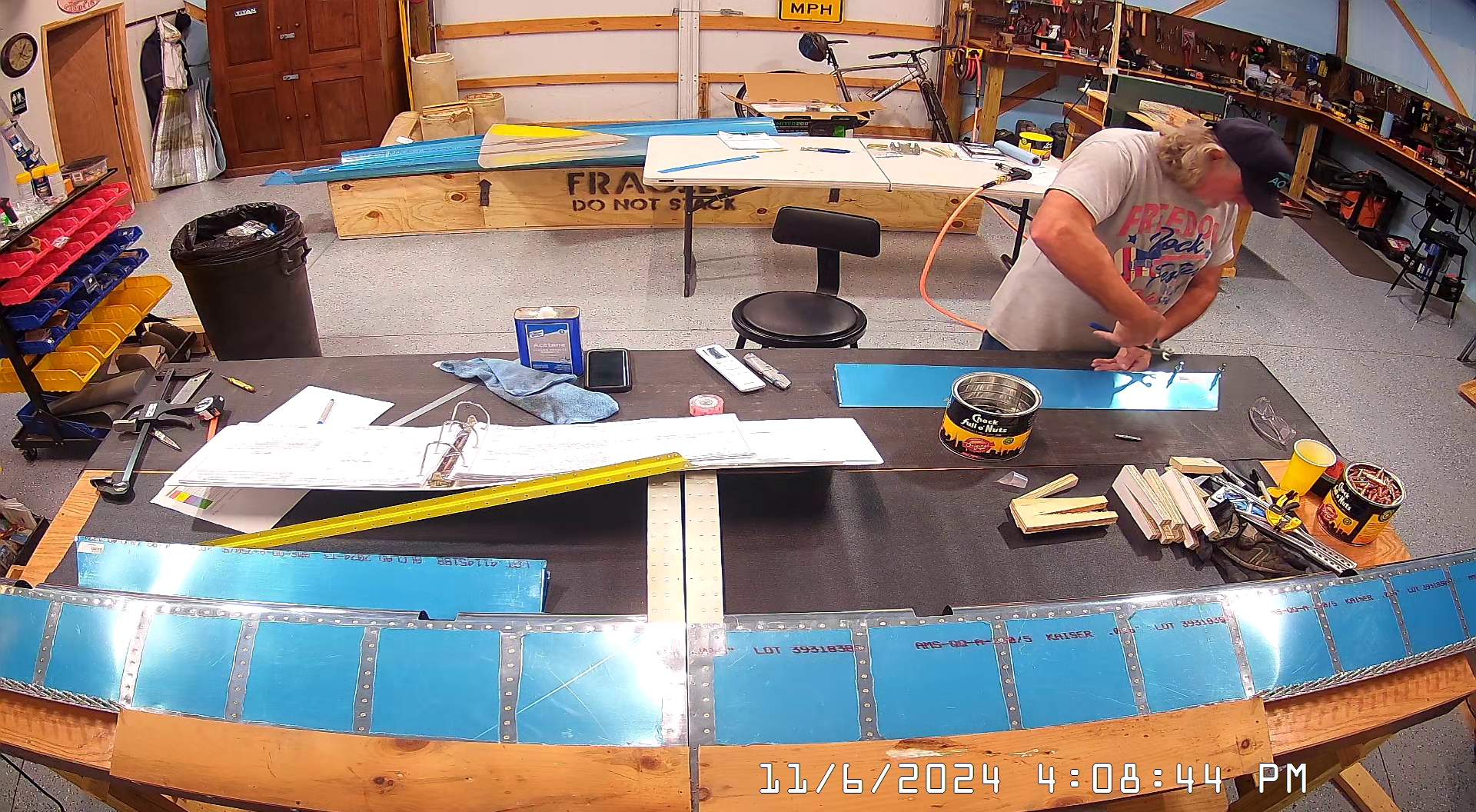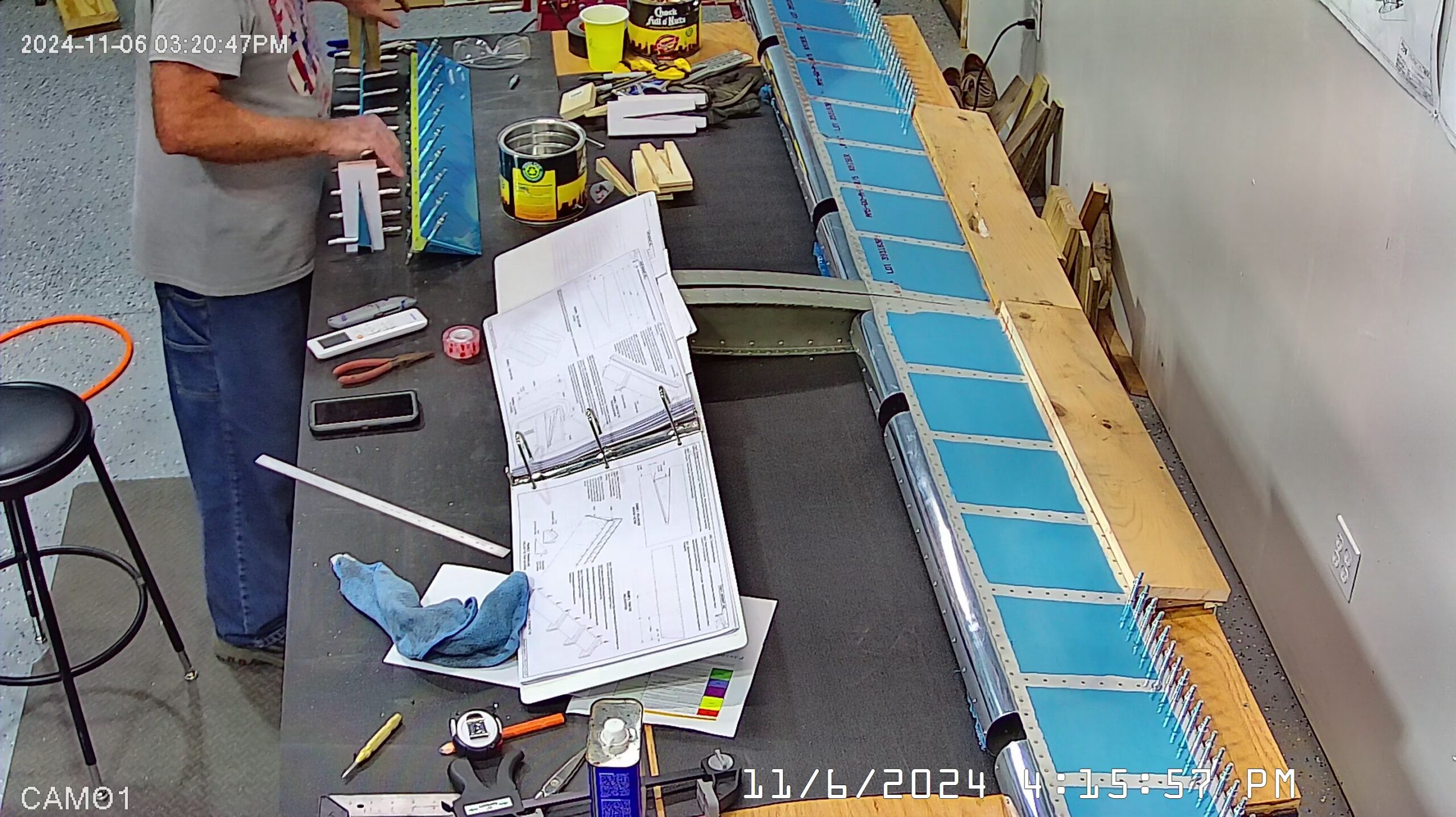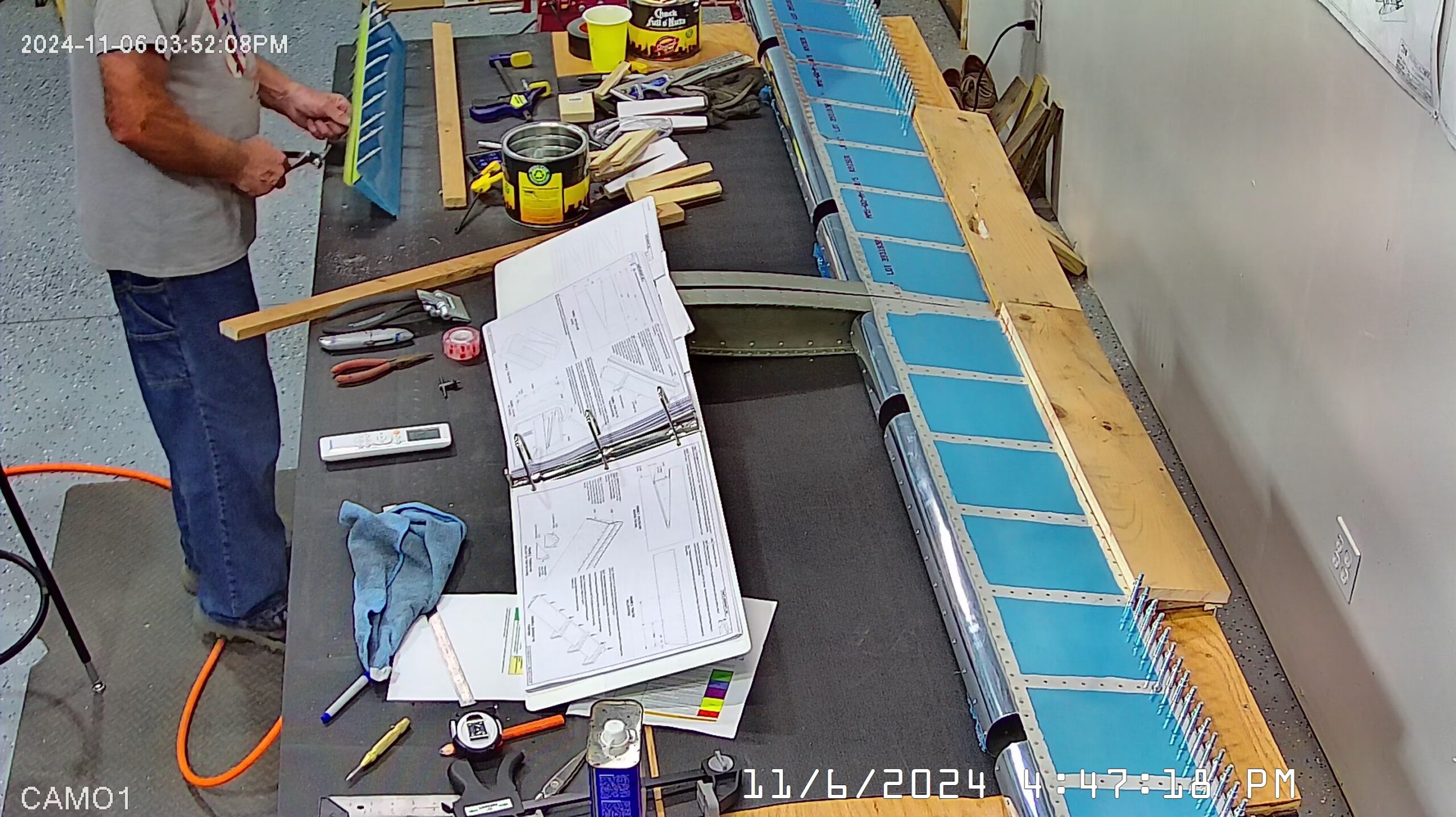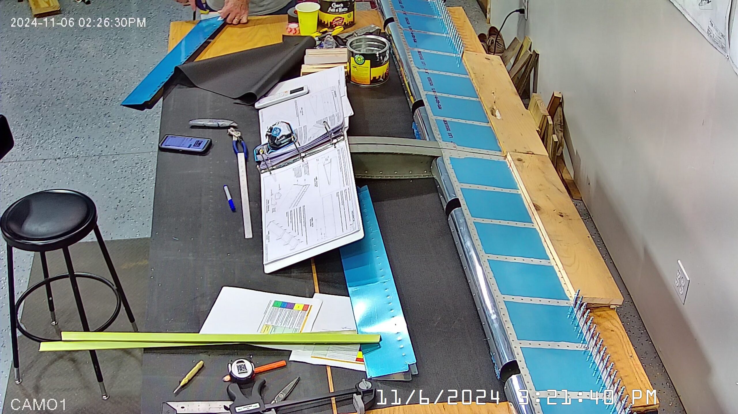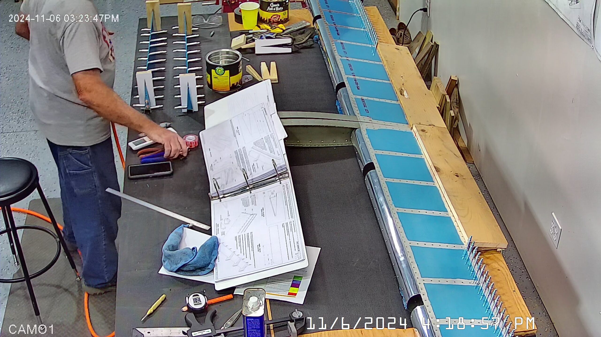 You want to be sure to do the scuffing and cleaning inside the tabs before you final bend them to the correct profile because otherwise it will be extremely difficult to do, and also make sure you final bend the skins before you bend the closing tabs on either end. Bending the closing tabs is no big deal but the double sided tape I used was a nightmare to remove so I switched to some double sided hang up tabs. Once you have the sides bent you need to clamp them in place so that you can match drill the rivet holes on the inner tab (lower skin bent up should be inside the upper skin bent down tab).