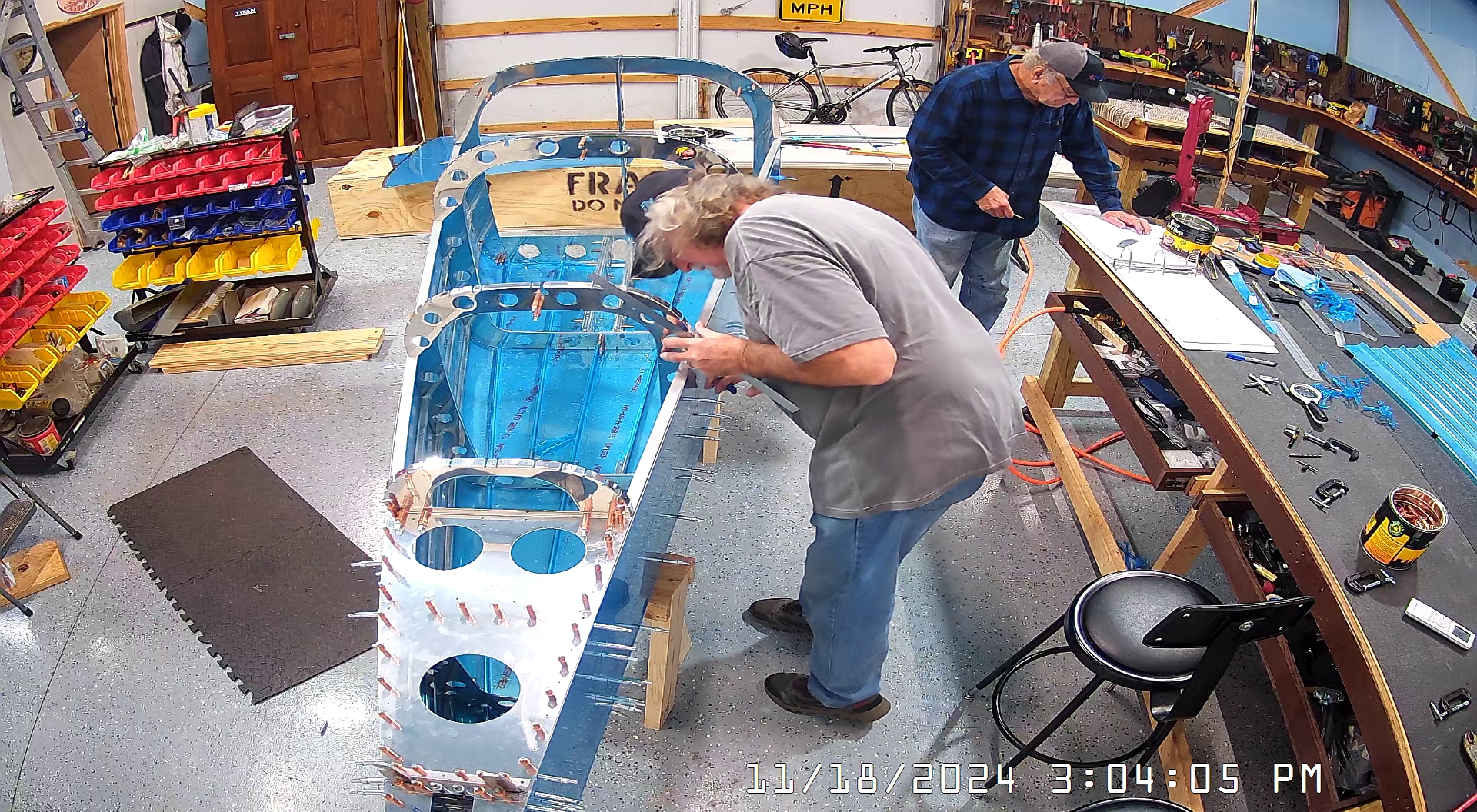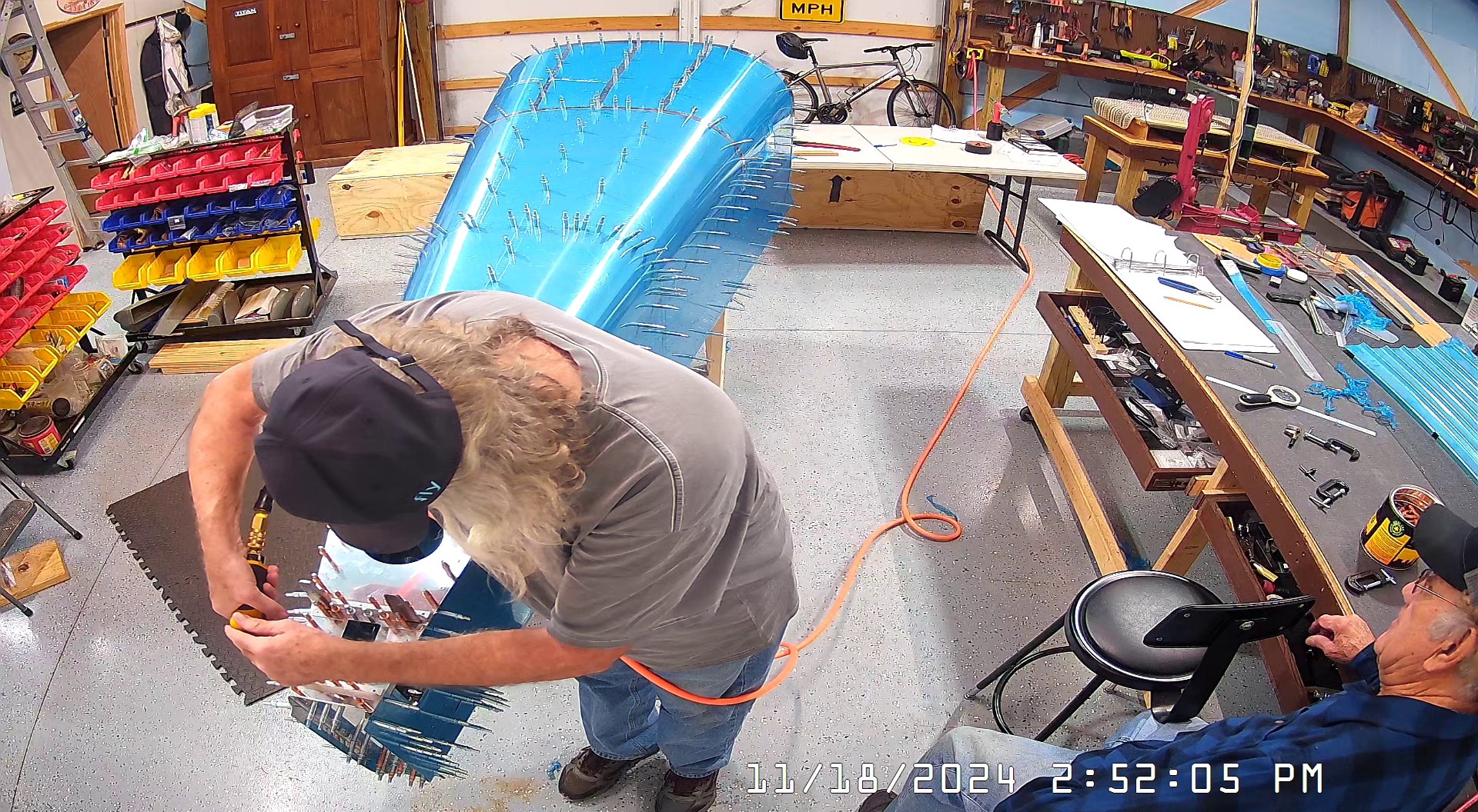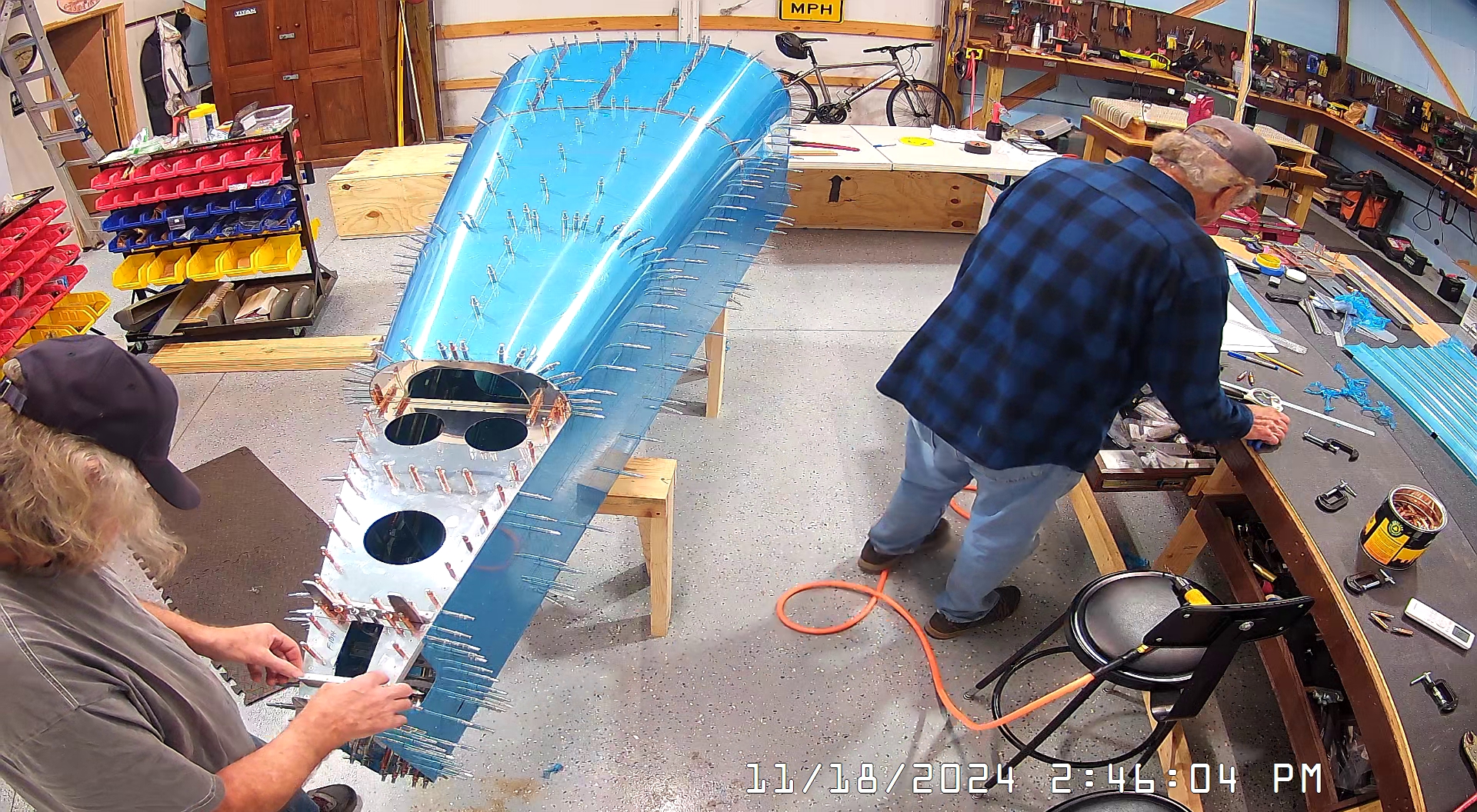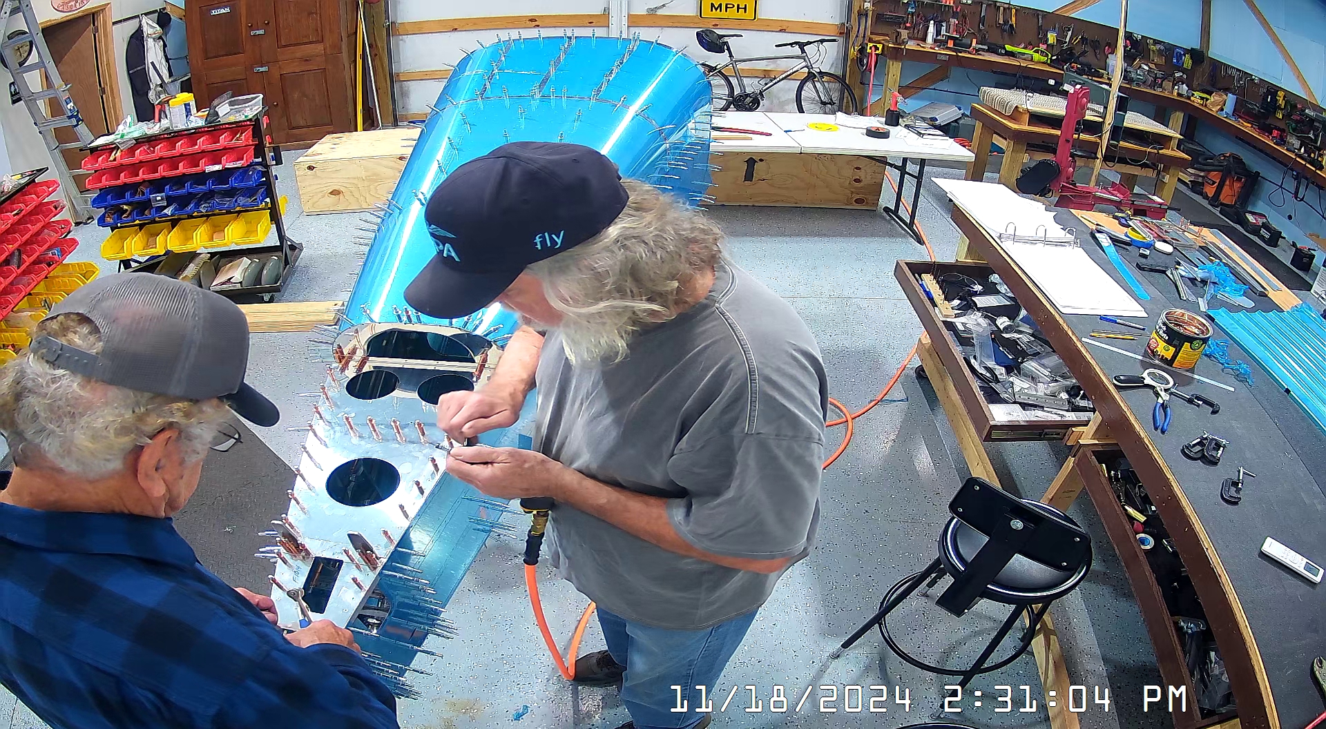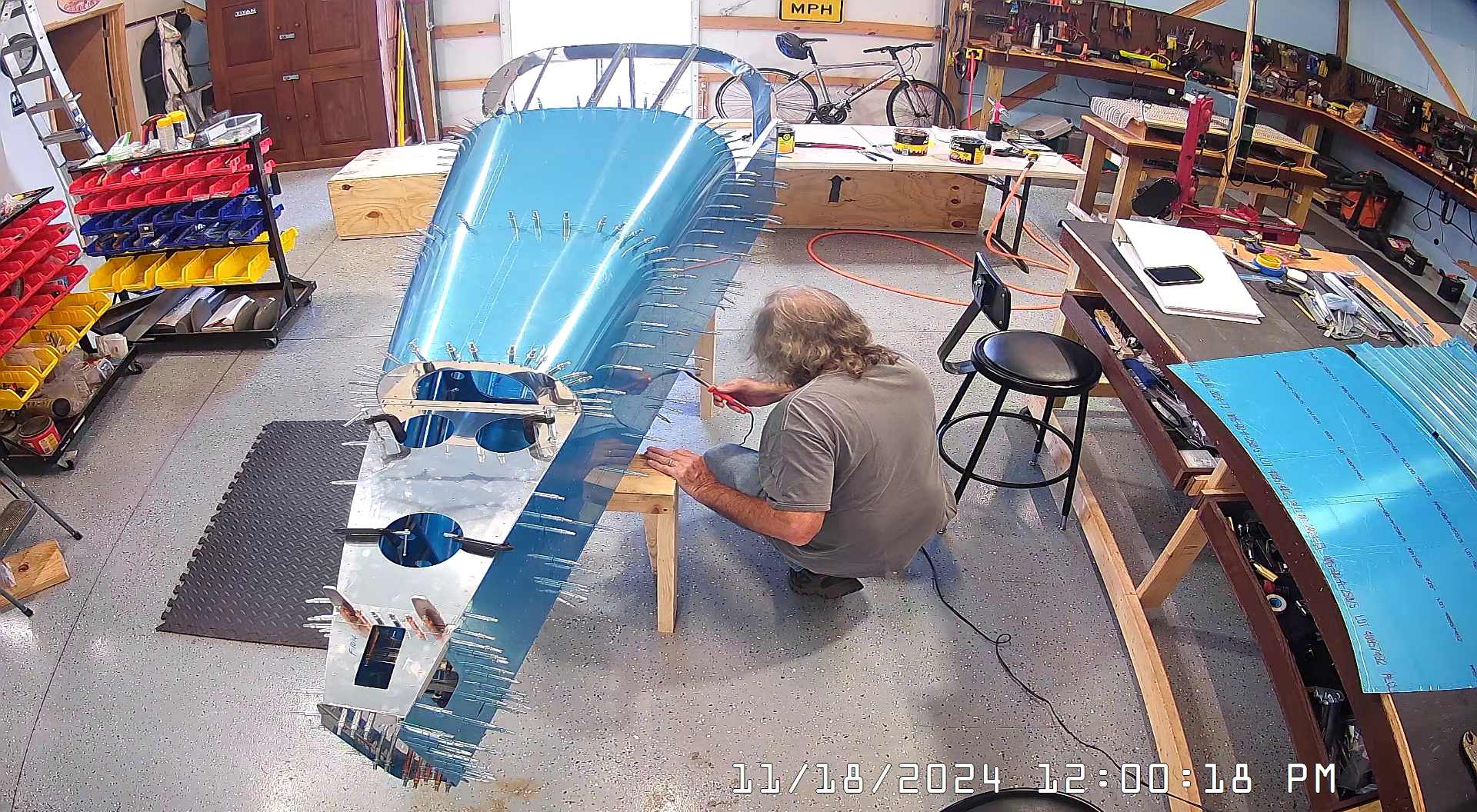 EJ, my trusty assistant showed up as I was nearing finishing but we had to go back a step to match drill the stiffeners in F-1047 A and B. I could not do that on my own as I couldn’t hold the stiffeners in the correct place while at the same time drilling the end cross through the skin holes. This is outlined in the assembly manual as Page 10-12, steps 6 through 9. You have to be careful here to not miss the tab holes in the bulkheads.