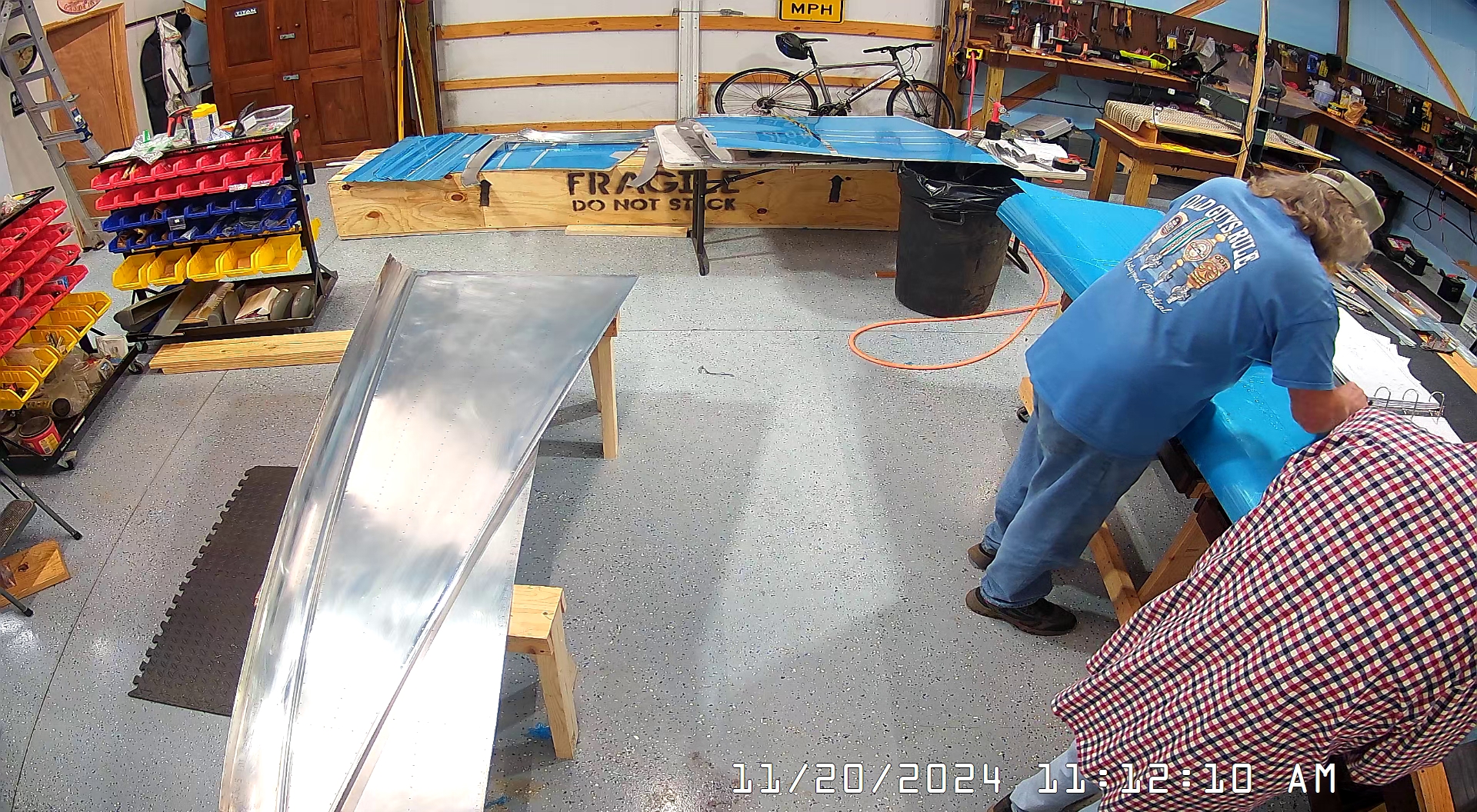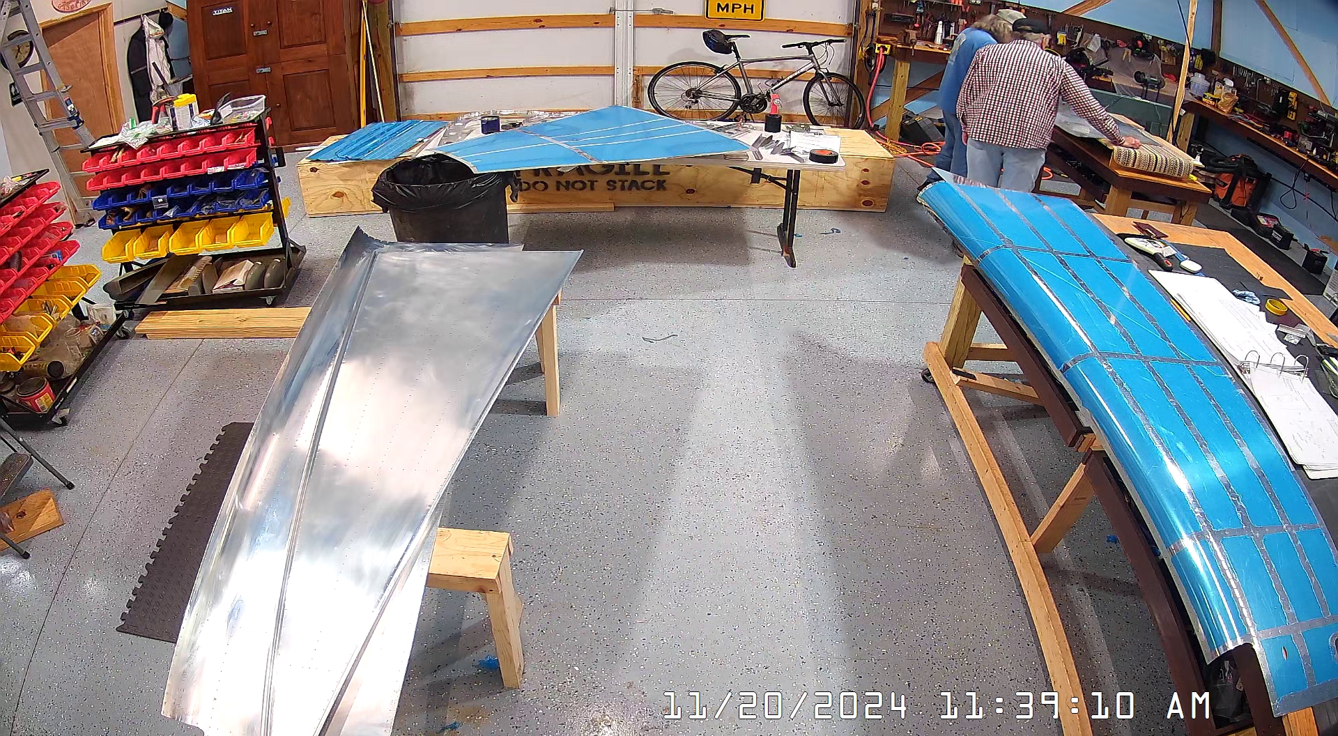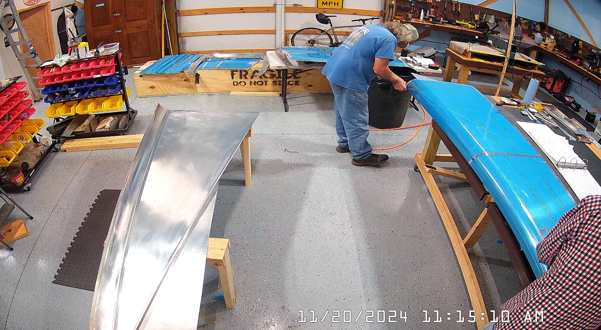 Here are a few overhead shots of working on the C-frame dimpler with the skins, stiffeners, bulkheads and frames. You can see there are two of us working the dimpling process. One person can probably manage most of it but it will take much longer and the risk of screwing up, or distorting the skin or flange is much higher.