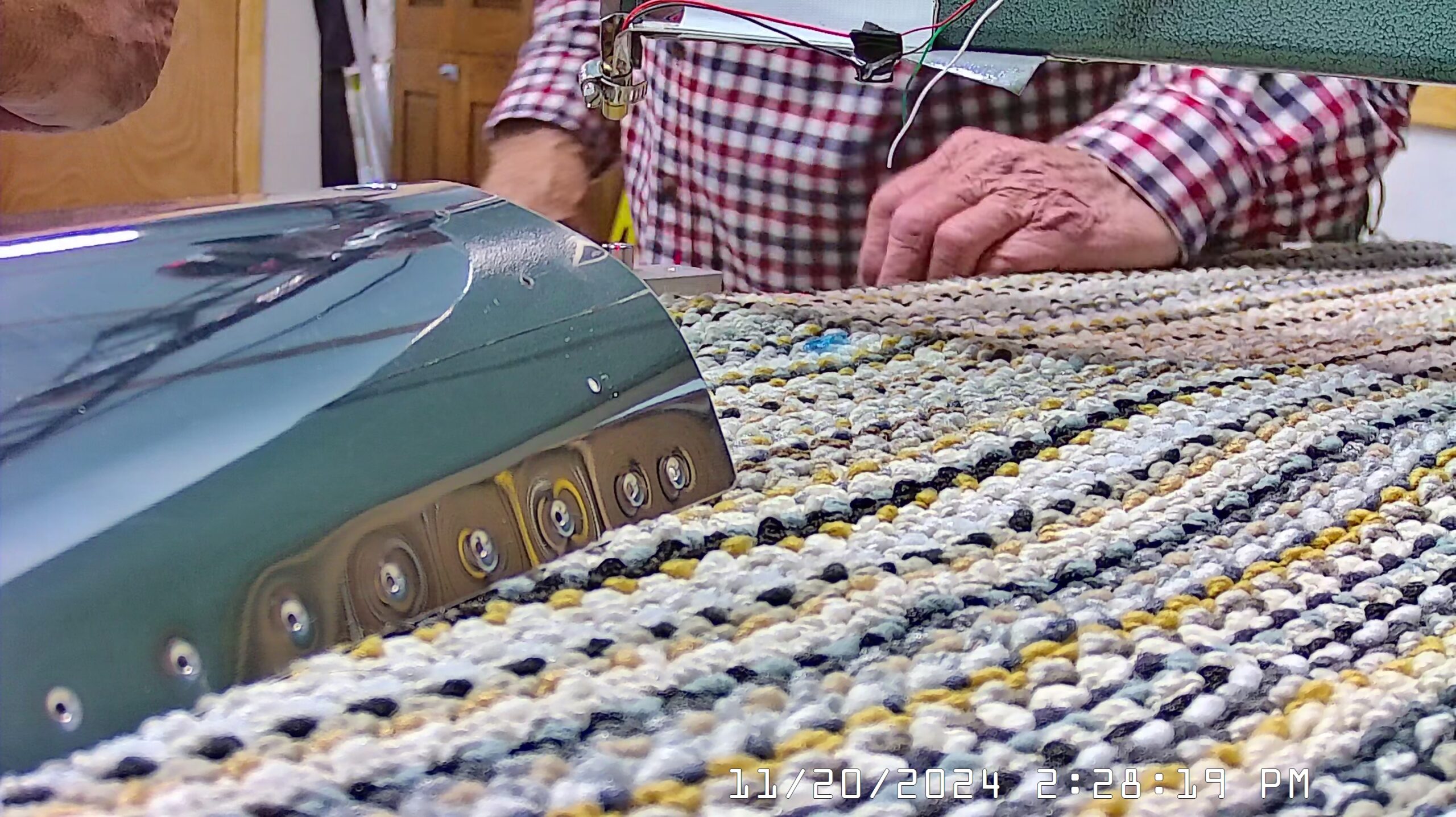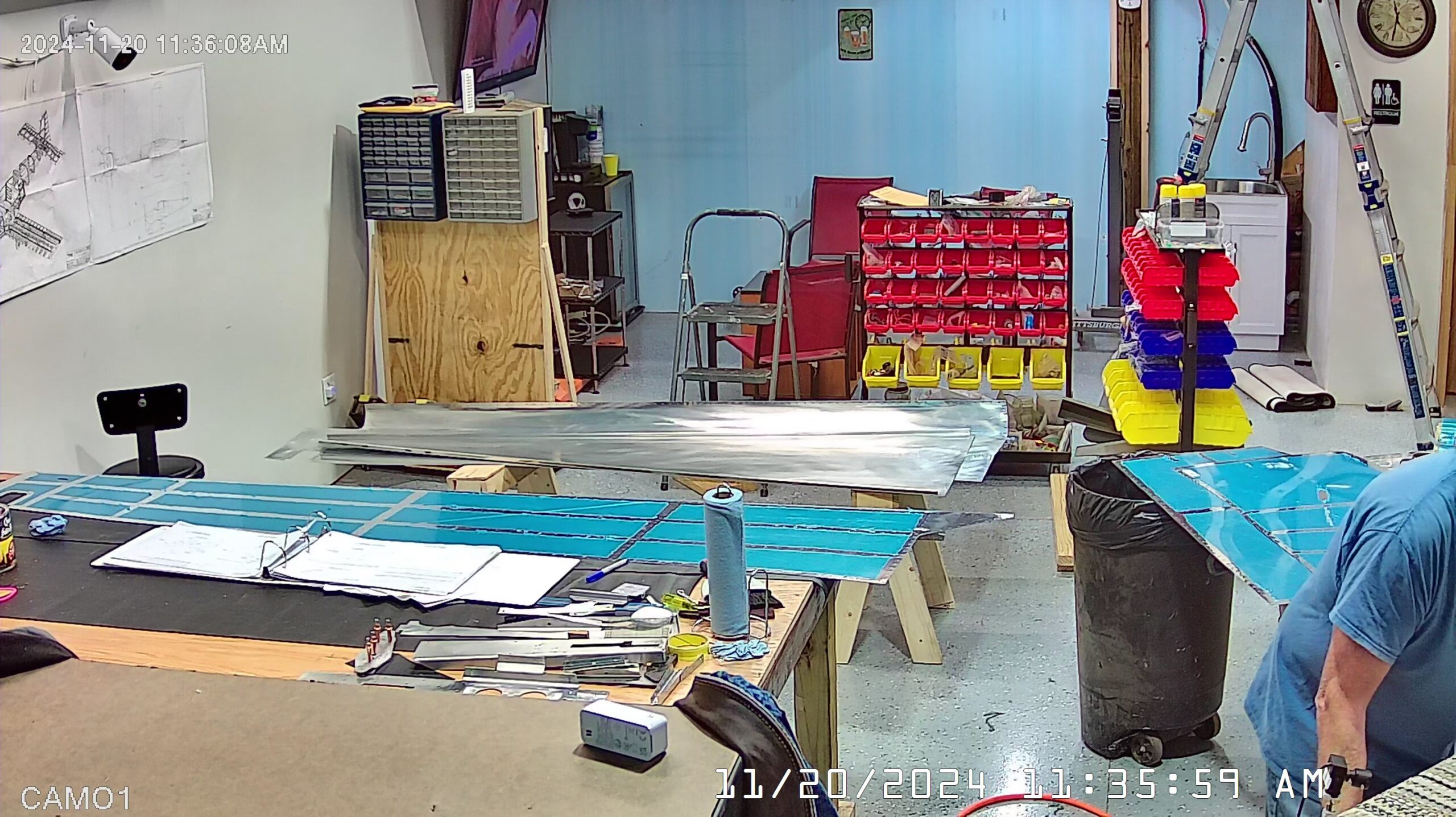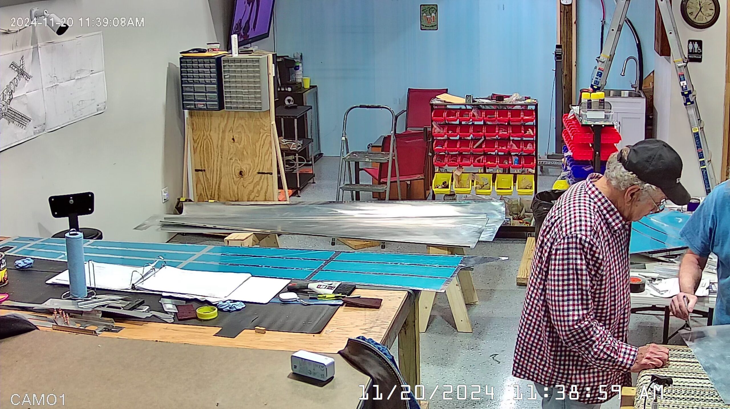 Here are a few overhead shots of working on the C-frame dimpler with the skins, stiffeners, bulkheads and frames. You can see there are two of us working the dimpling process. One person can probably manage most of it but it will take much longer and the risk of screwing up, or distorting the skin or flange is much higher.
