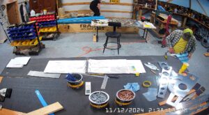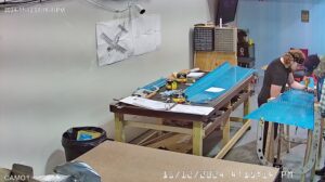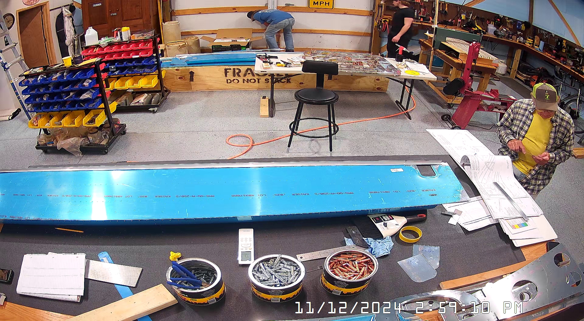 The instructions say to setup a sawhorse on which to place the F-1078 skin so you can assemble the bulkheads and stiffeners. I did not have any sawhorses so I suggested using the bar stools but that turned out to be too rickety so we used some 2 x 4 x 8′ and the long thin crate in which some of the parts had been shipped to make a couple of saw horses. Worked out just fine.