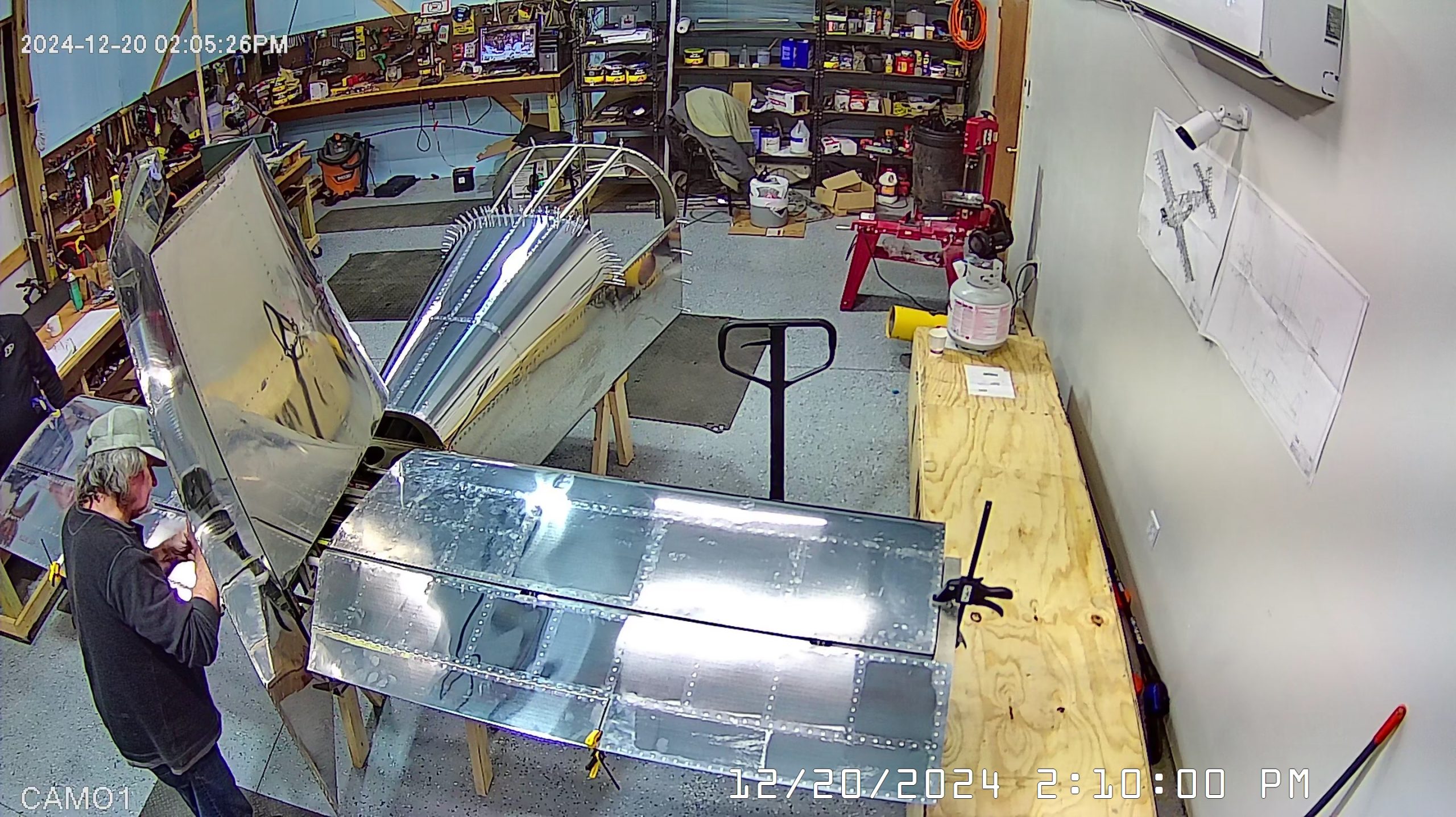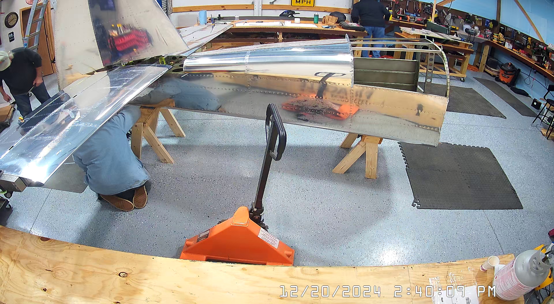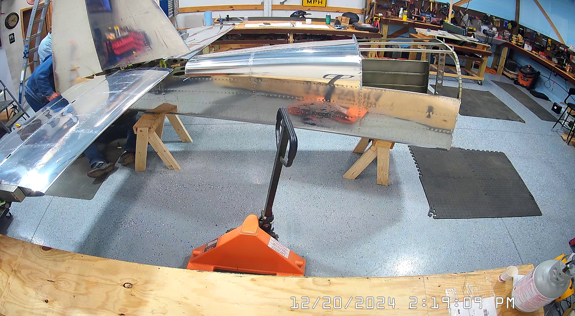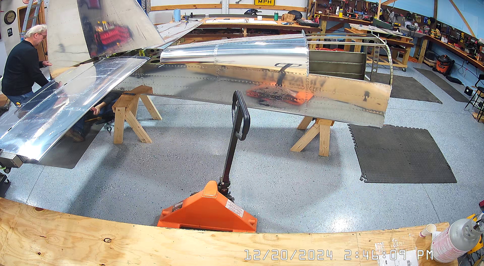 Today we actually began in the workshop pretty early, 7:30 a.m., because I had purchased a hoist / winch so that I could suspend the empennage from the roof of the workshop, once it is completed, so that it is not in the way of building the Zenith 750 SD. I had also rented a scissor lift to facilitate this so most of the morning was actually spent installing the hoist and then returning the scissor lift to United Rentals in Spring Hill.