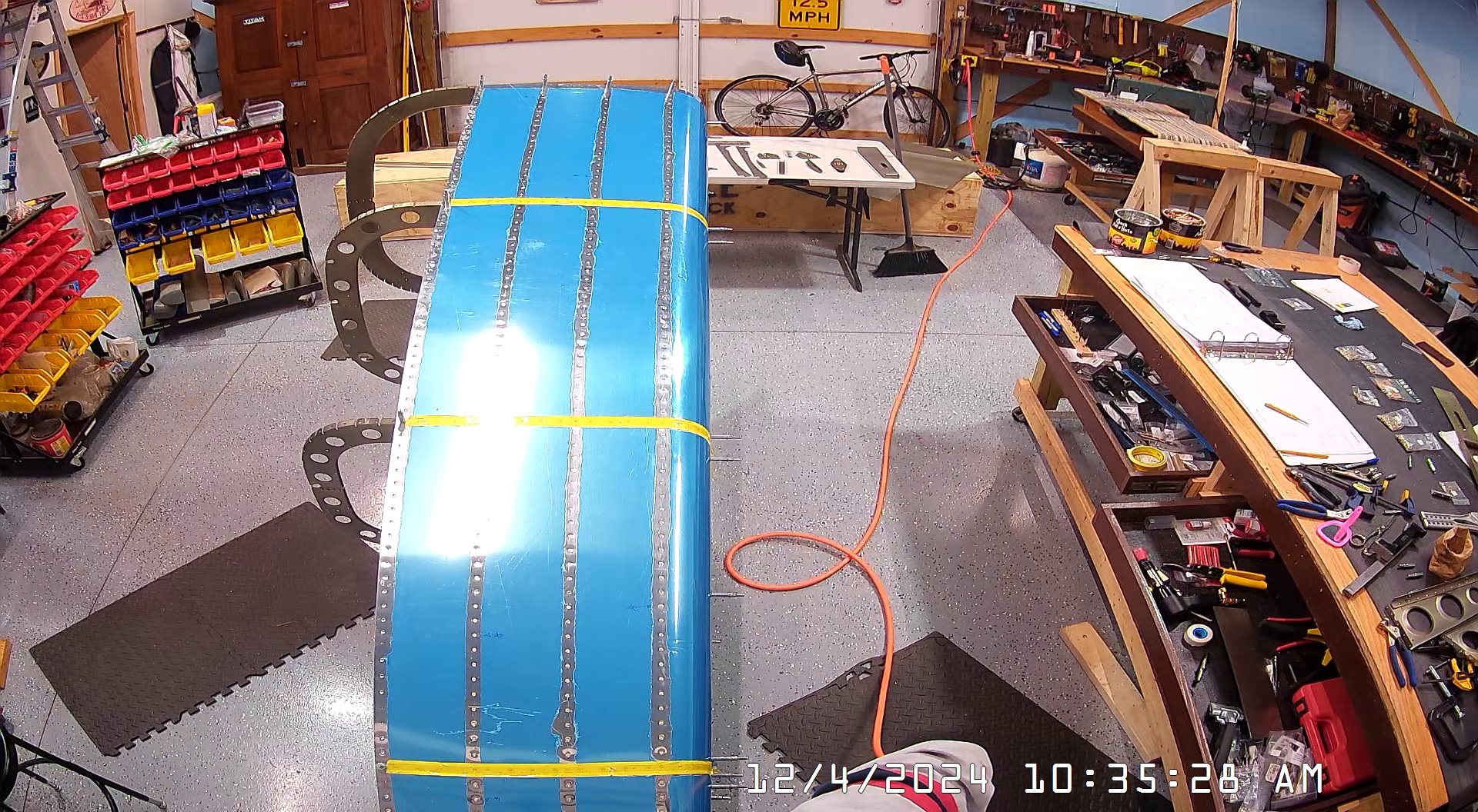 I noticed that the vinyl on the right side of the tailcone was getting scratched so I had to check my “saw horses” and found one of the screws was proud of the wood and I could not get it to bite down further so I used some of my rubber drawer liner and used spray on glue to attach it to the top of the saw horse.