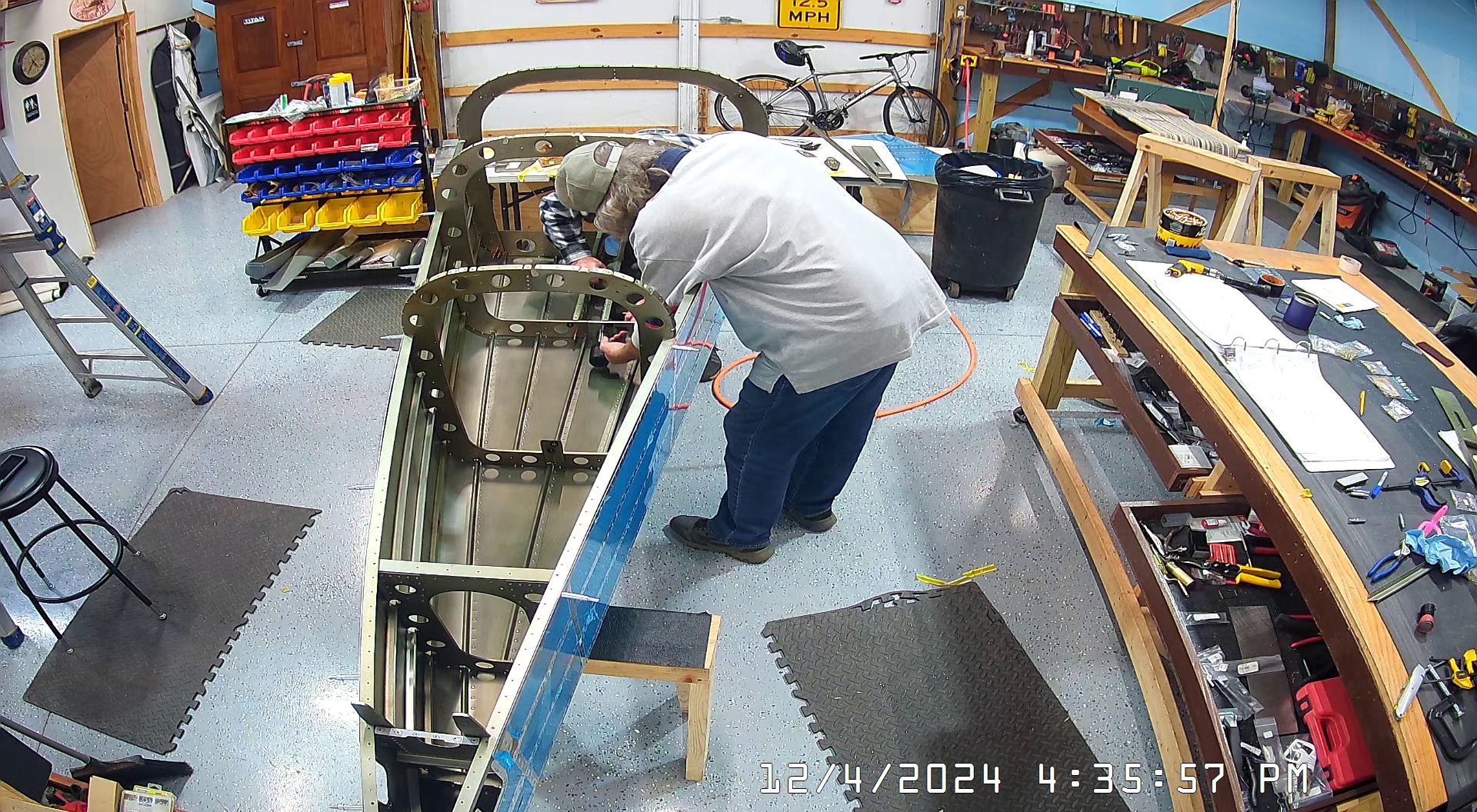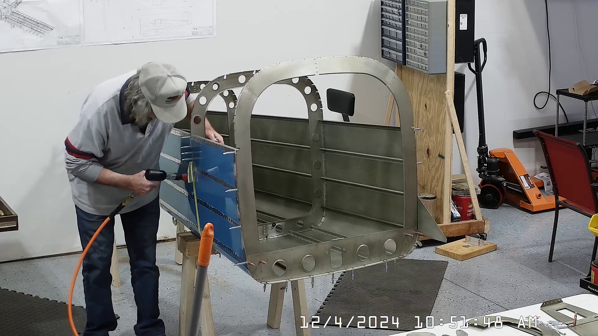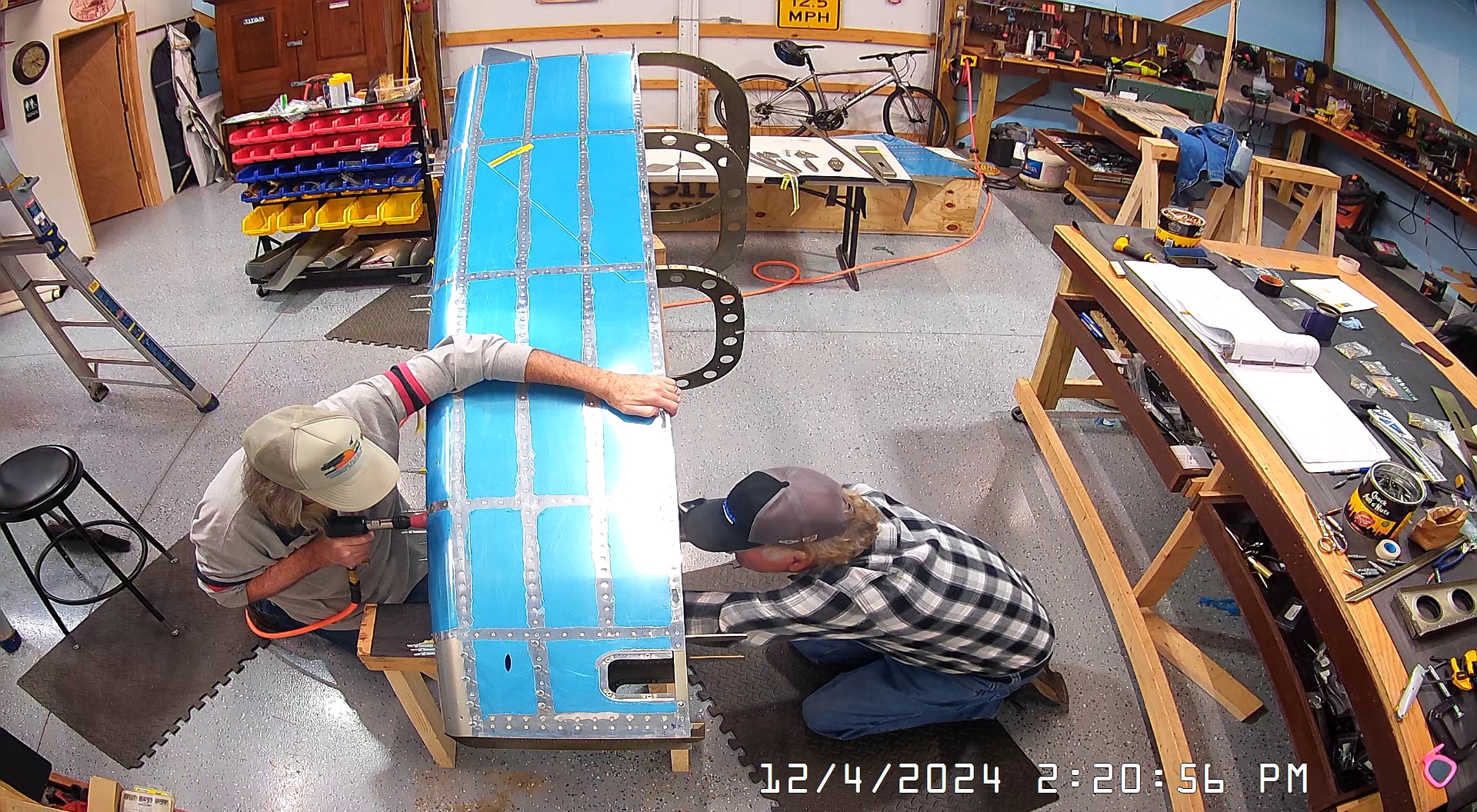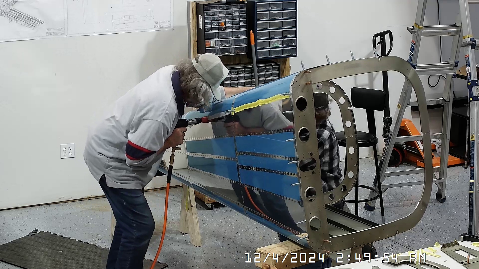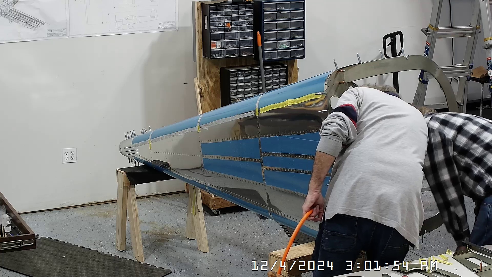 You will notice in some of the snapshots that we used the long bucking bar from Cleveland that is actually shaped for bucking inside spars at an angle. Using the end of the bar instead of the angled face pressed up against the rivet across the tailcone laid on its side made it a lot easier to buck.