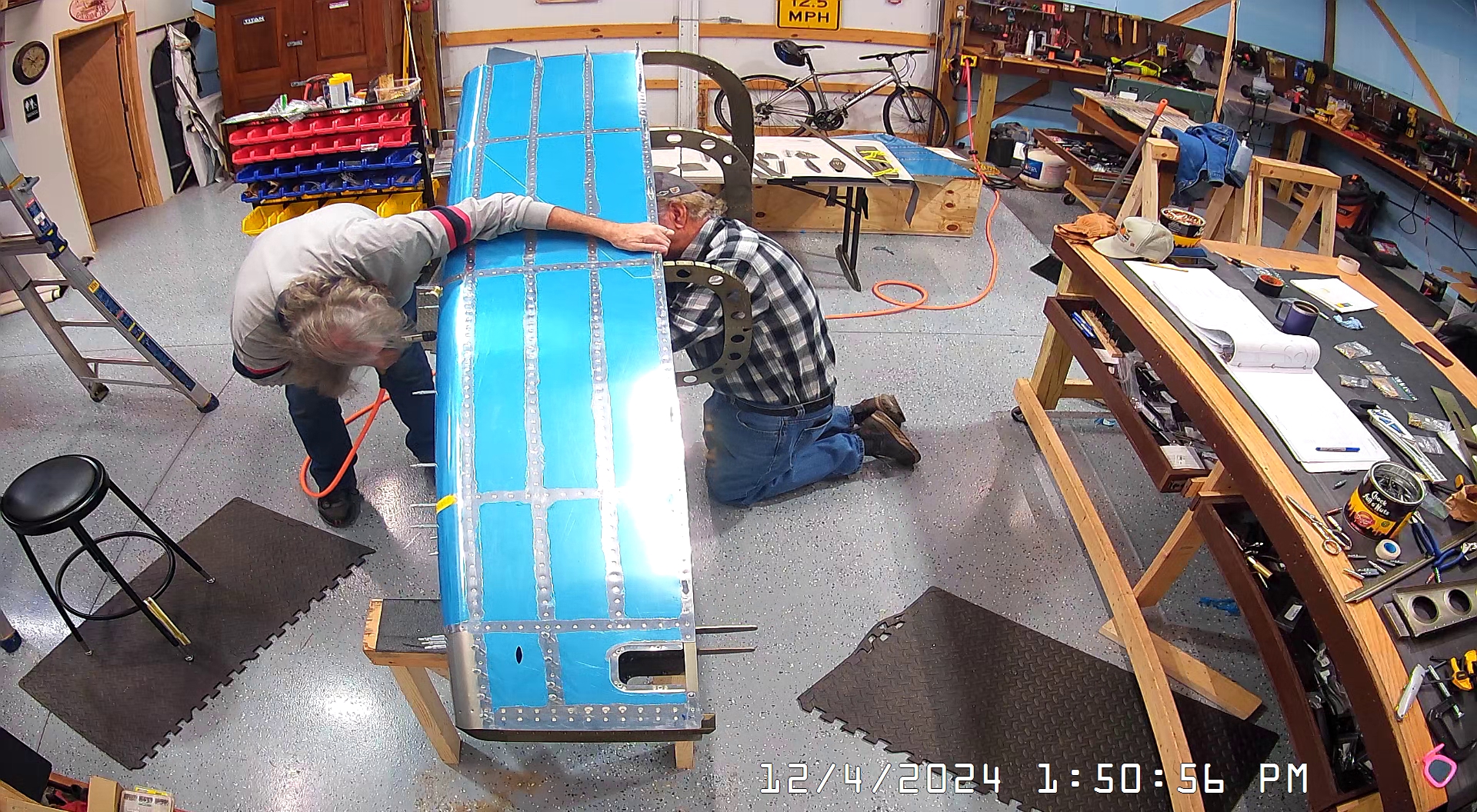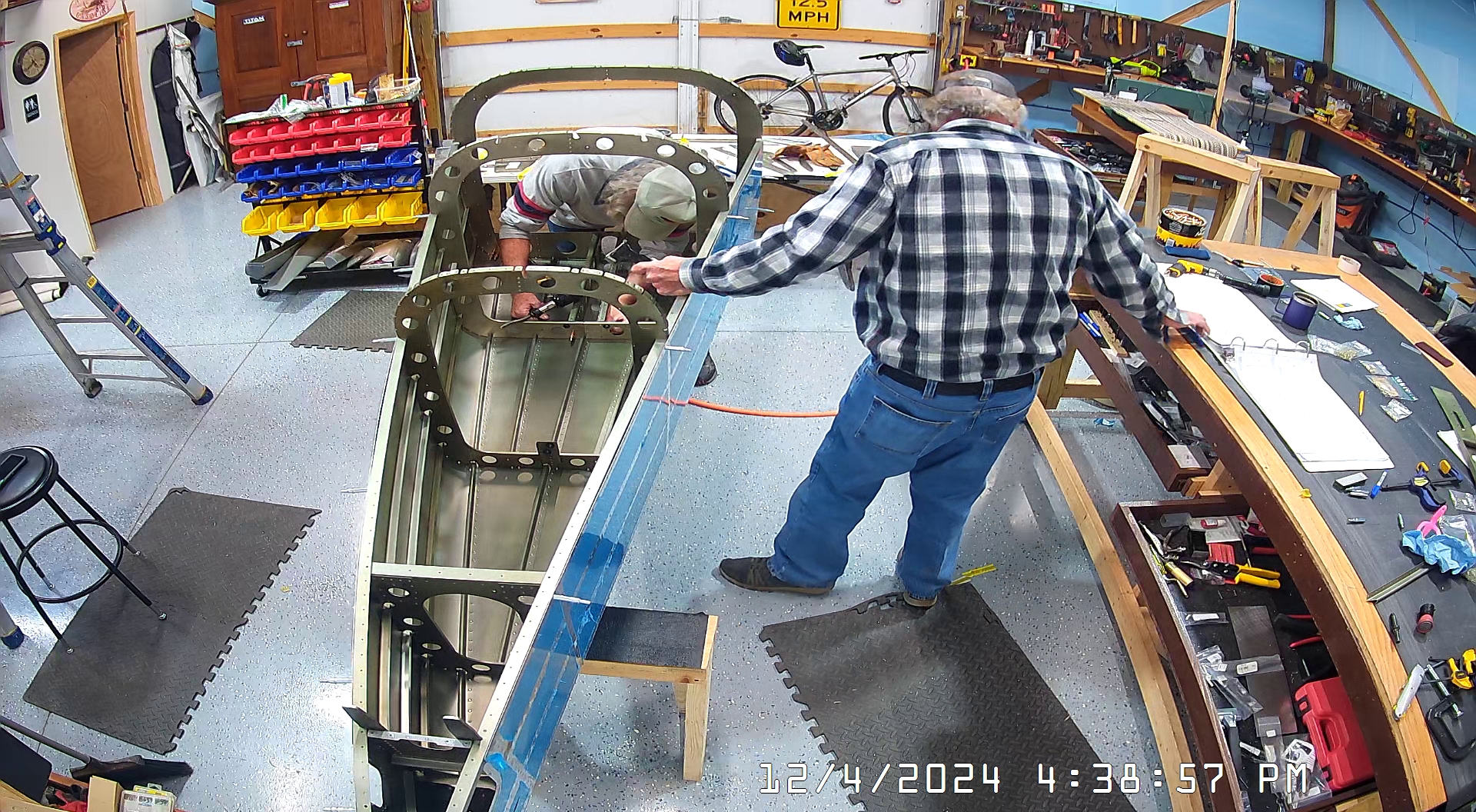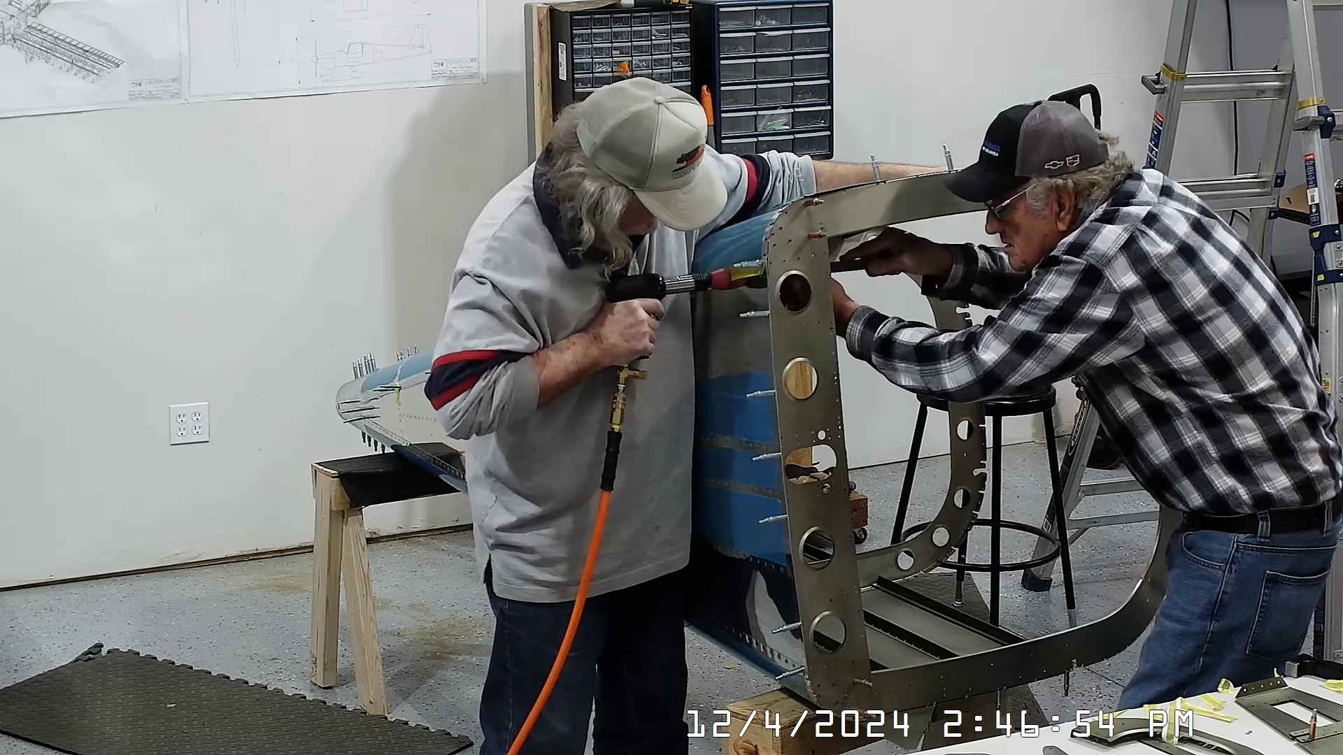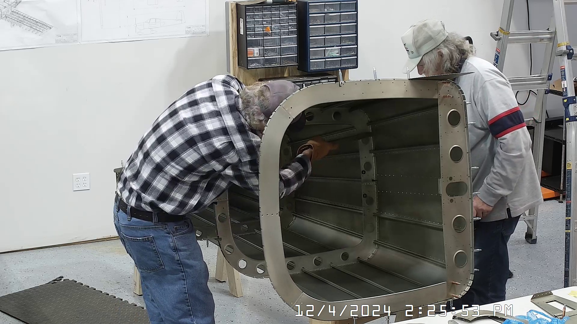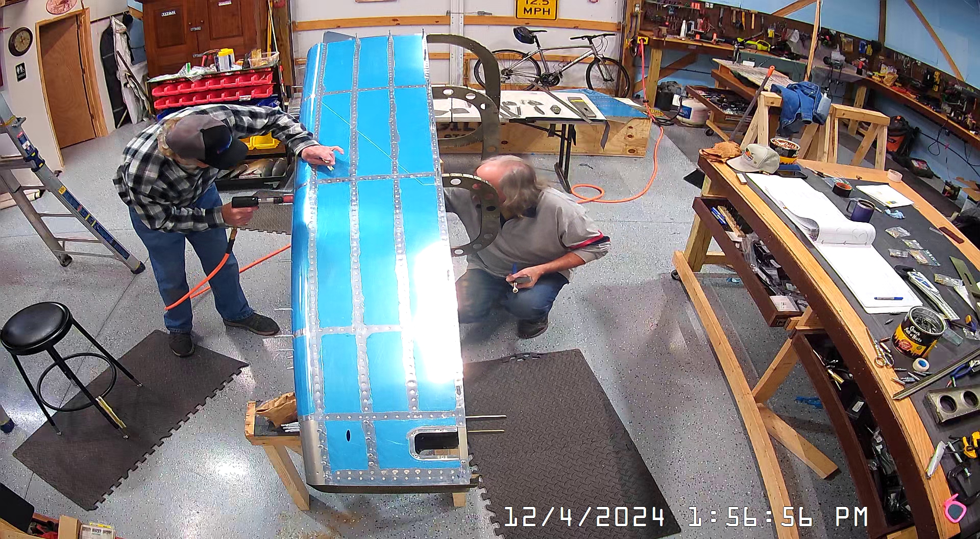 You will notice in some of the snapshots that we used the long bucking bar from Cleveland that is actually shaped for bucking inside spars at an angle. Using the end of the bar instead of the angled face pressed up against the rivet across the tailcone laid on its side made it a lot easier to buck.