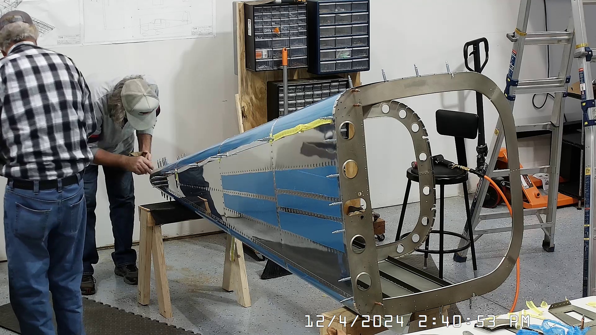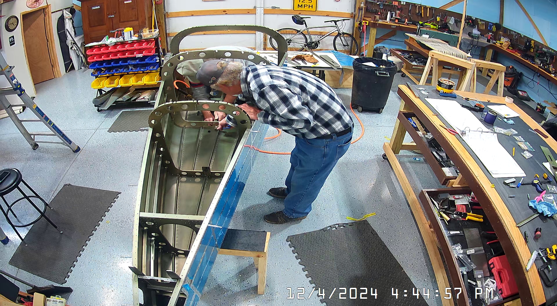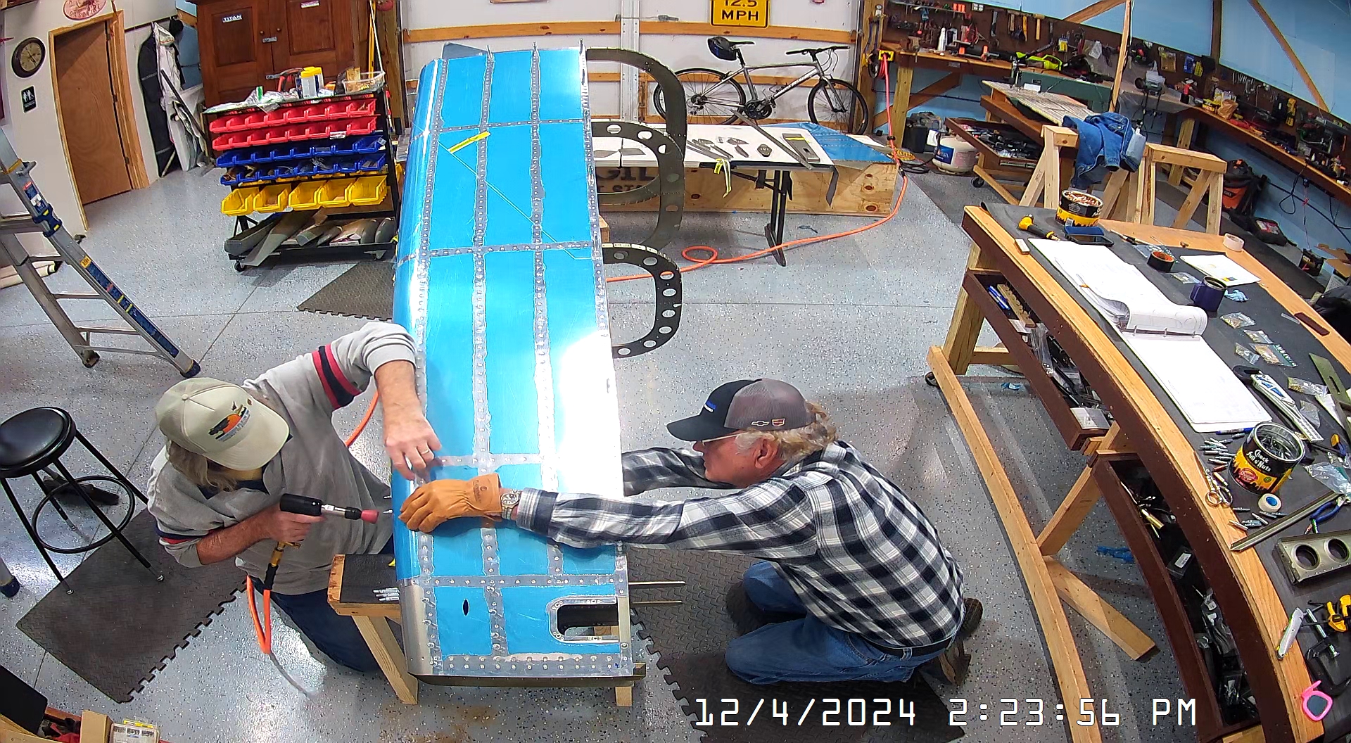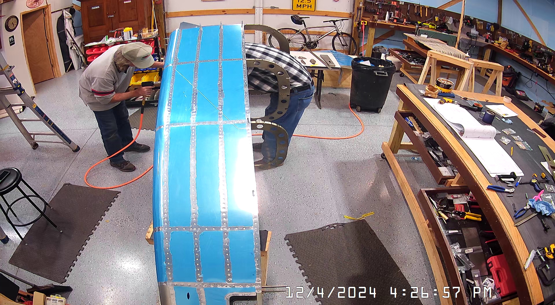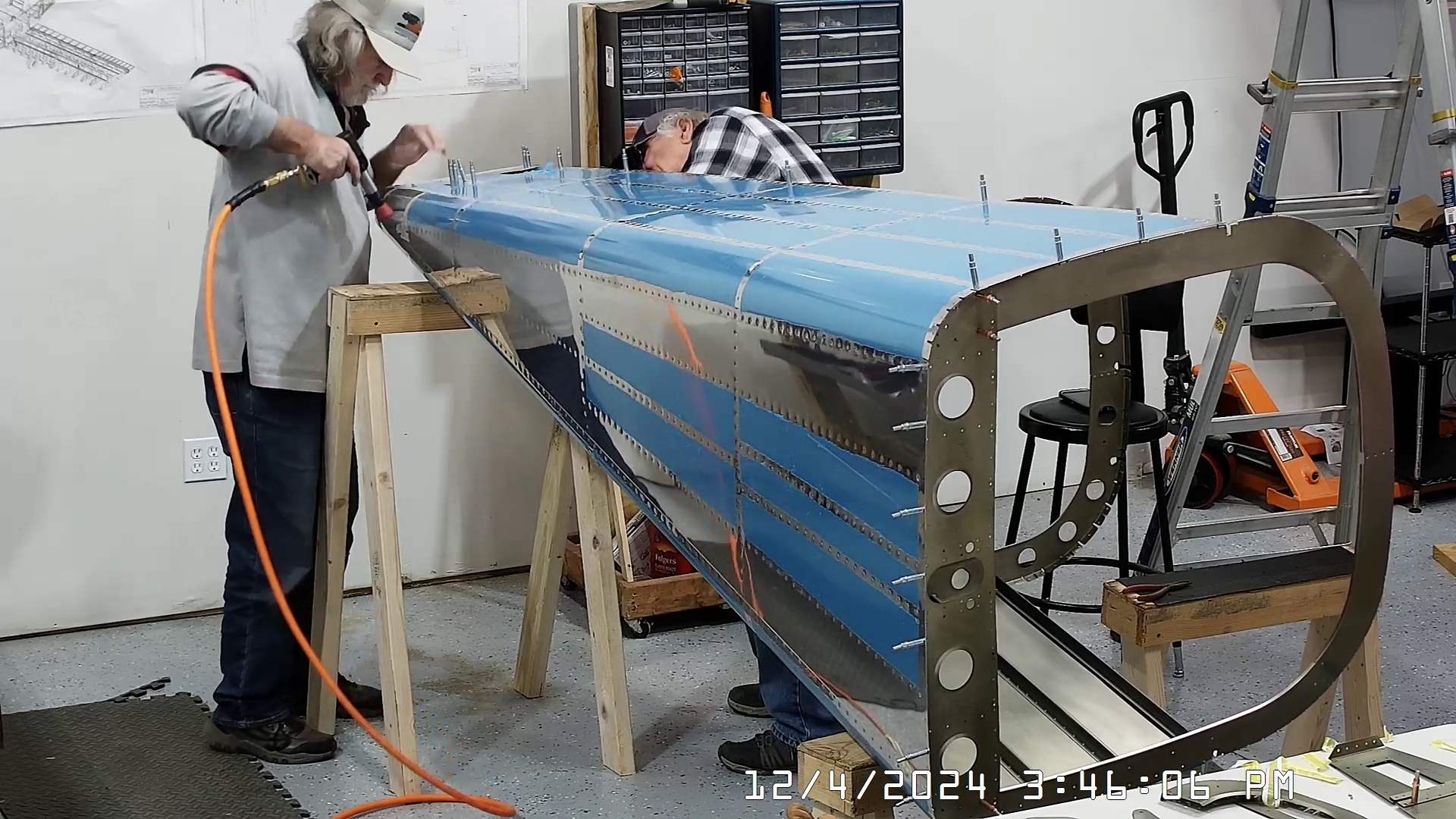 You will notice in some of the snapshots that we used the long bucking bar from Cleveland that is actually shaped for bucking inside spars at an angle. Using the end of the bar instead of the angled face pressed up against the rivet across the tailcone laid on its side made it a lot easier to buck.