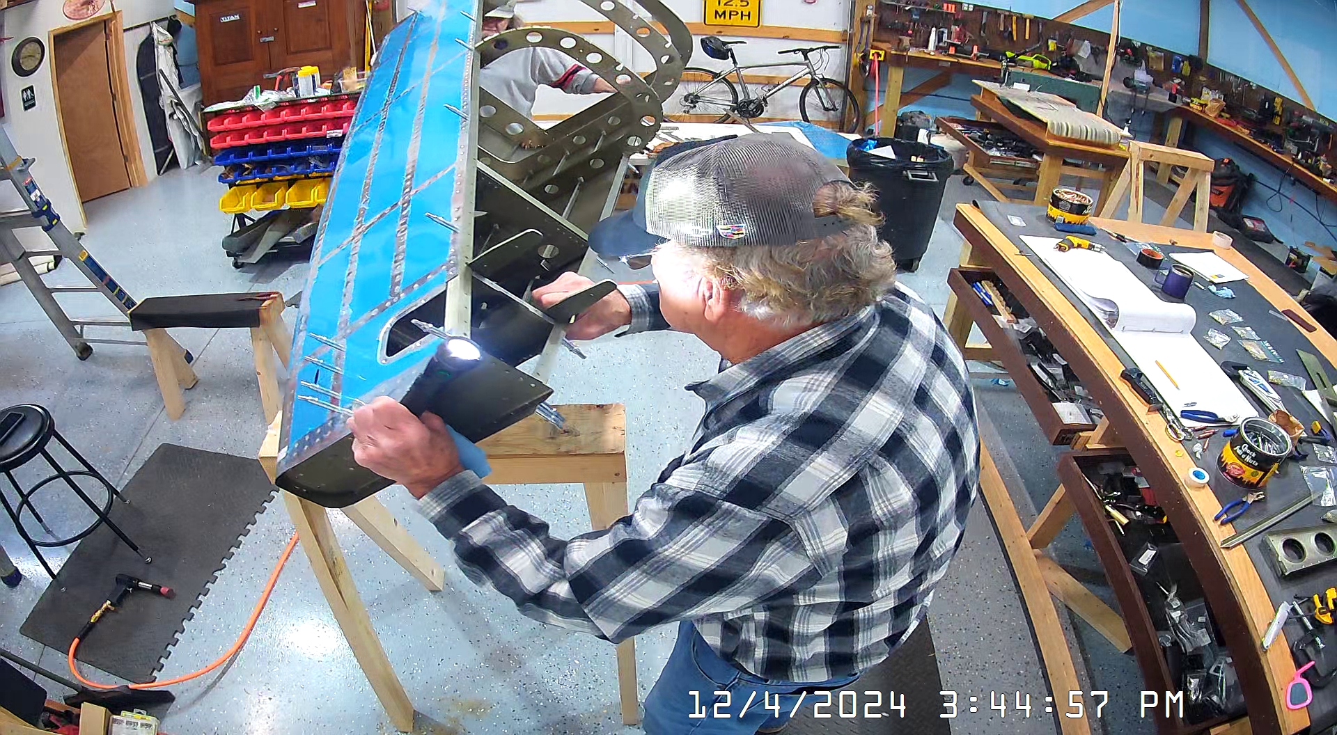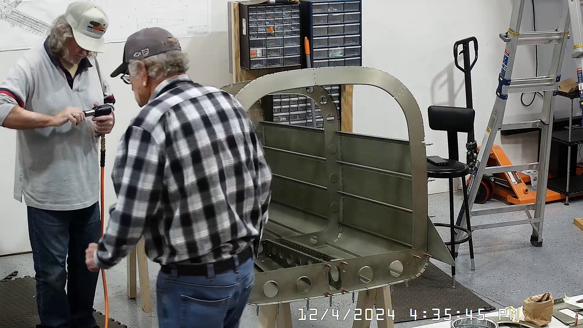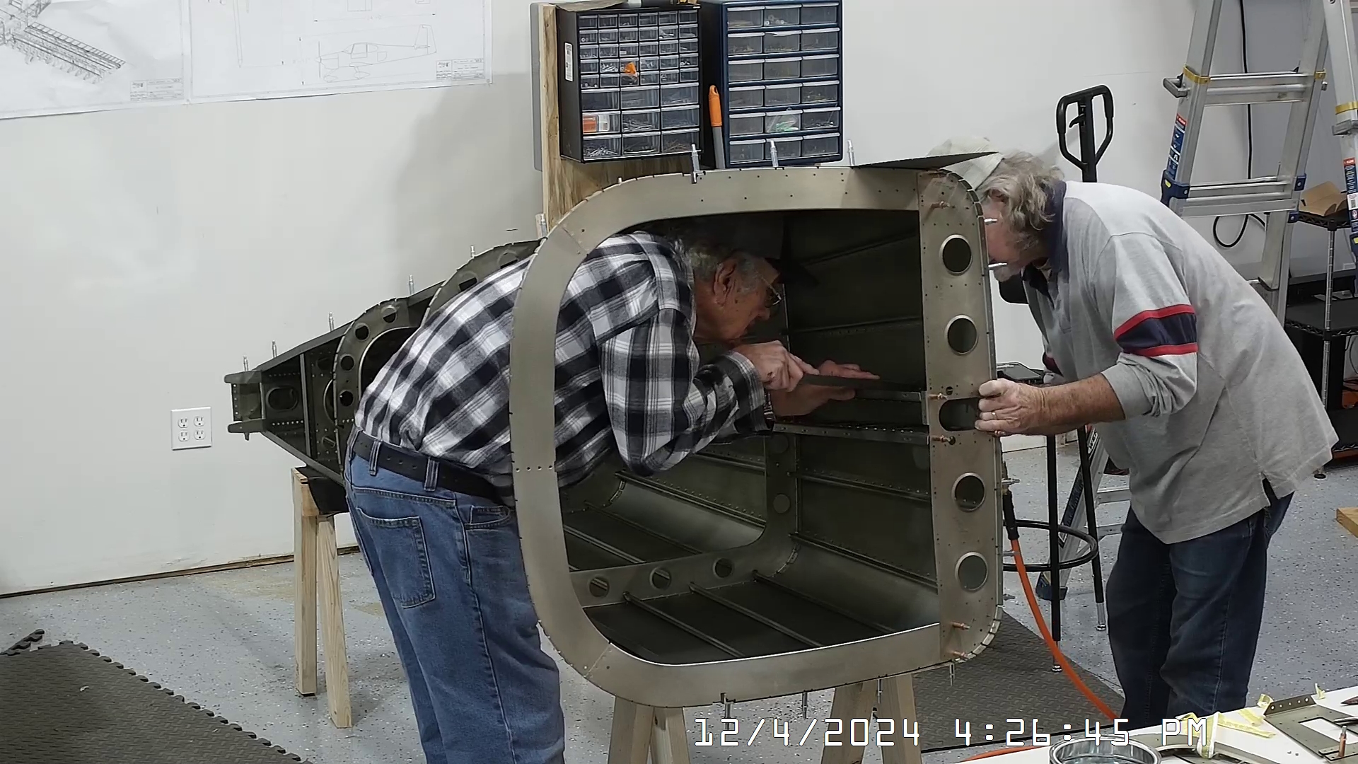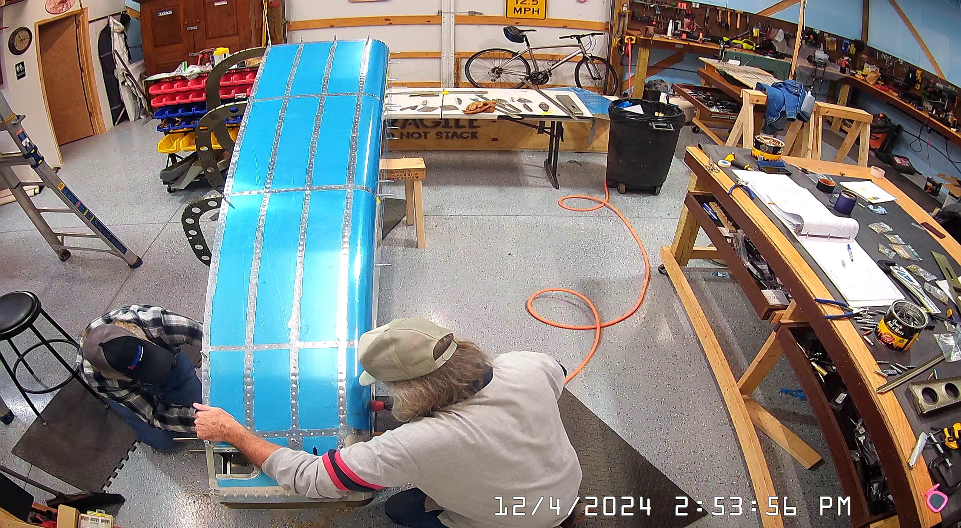 You will notice in some of the snapshots that we used the long bucking bar from Cleveland that is actually shaped for bucking inside spars at an angle. Using the end of the bar instead of the angled face pressed up against the rivet across the tailcone laid on its side made it a lot easier to buck.