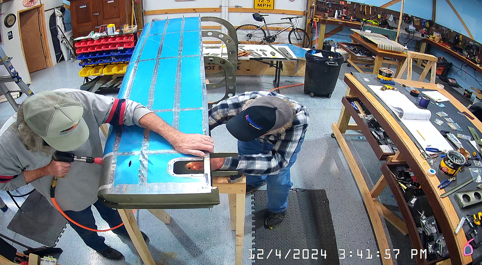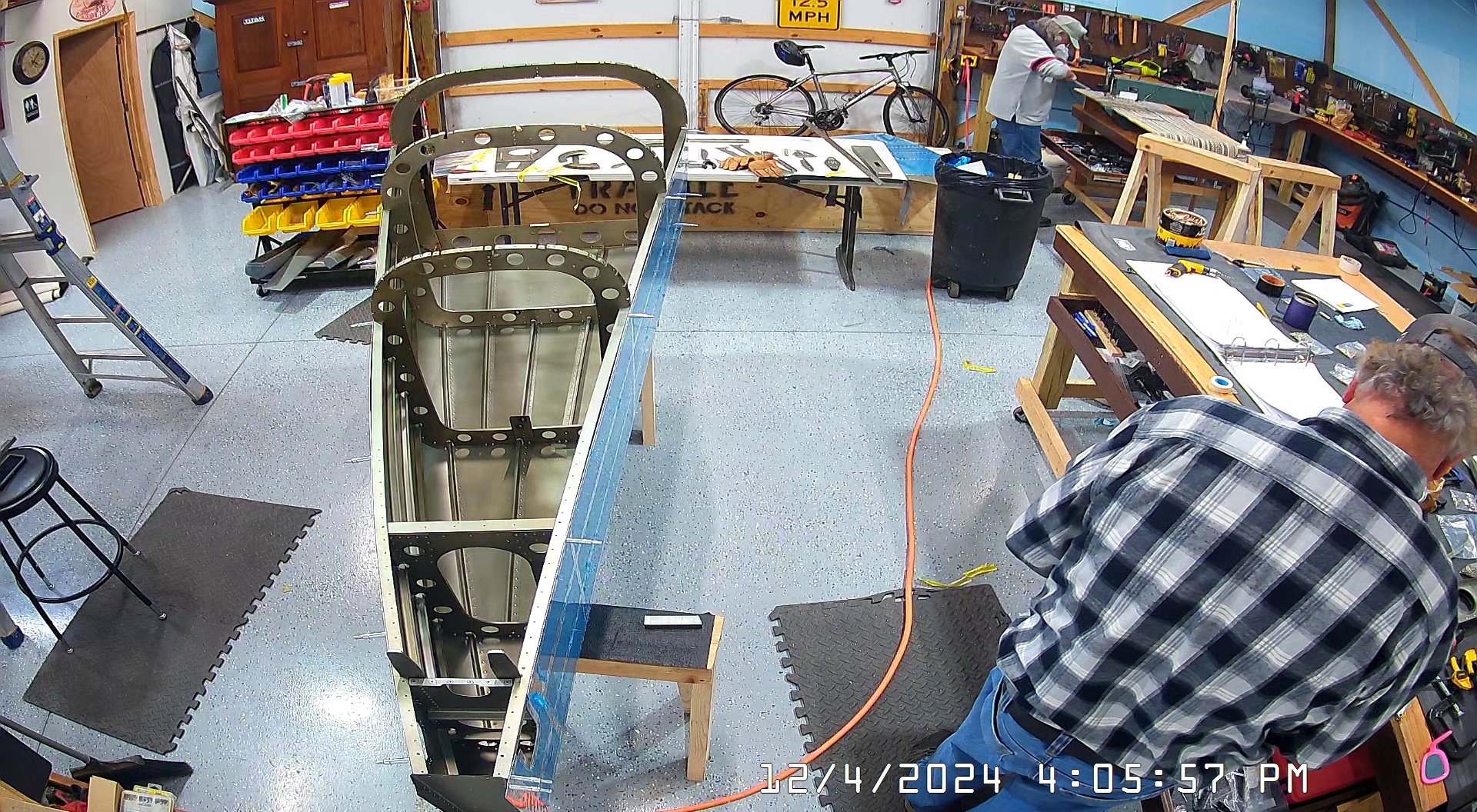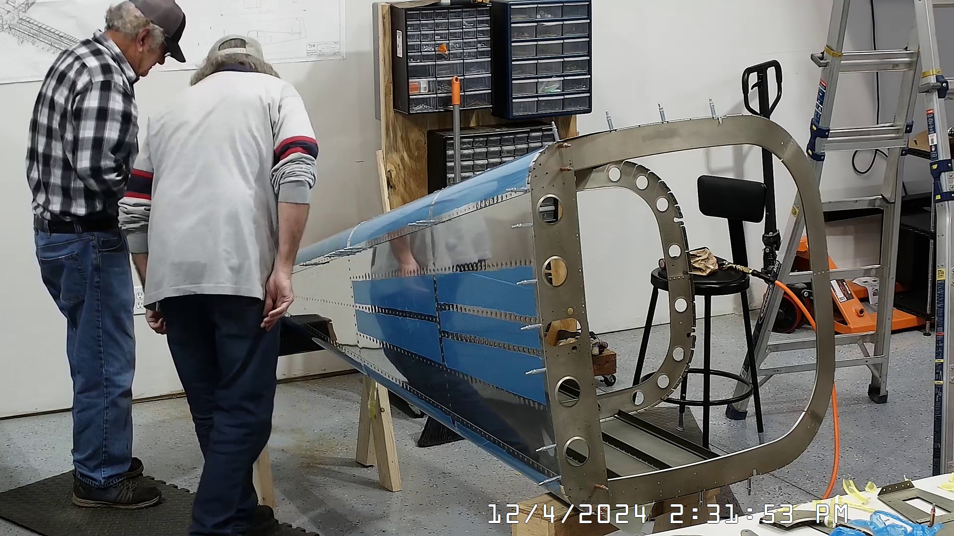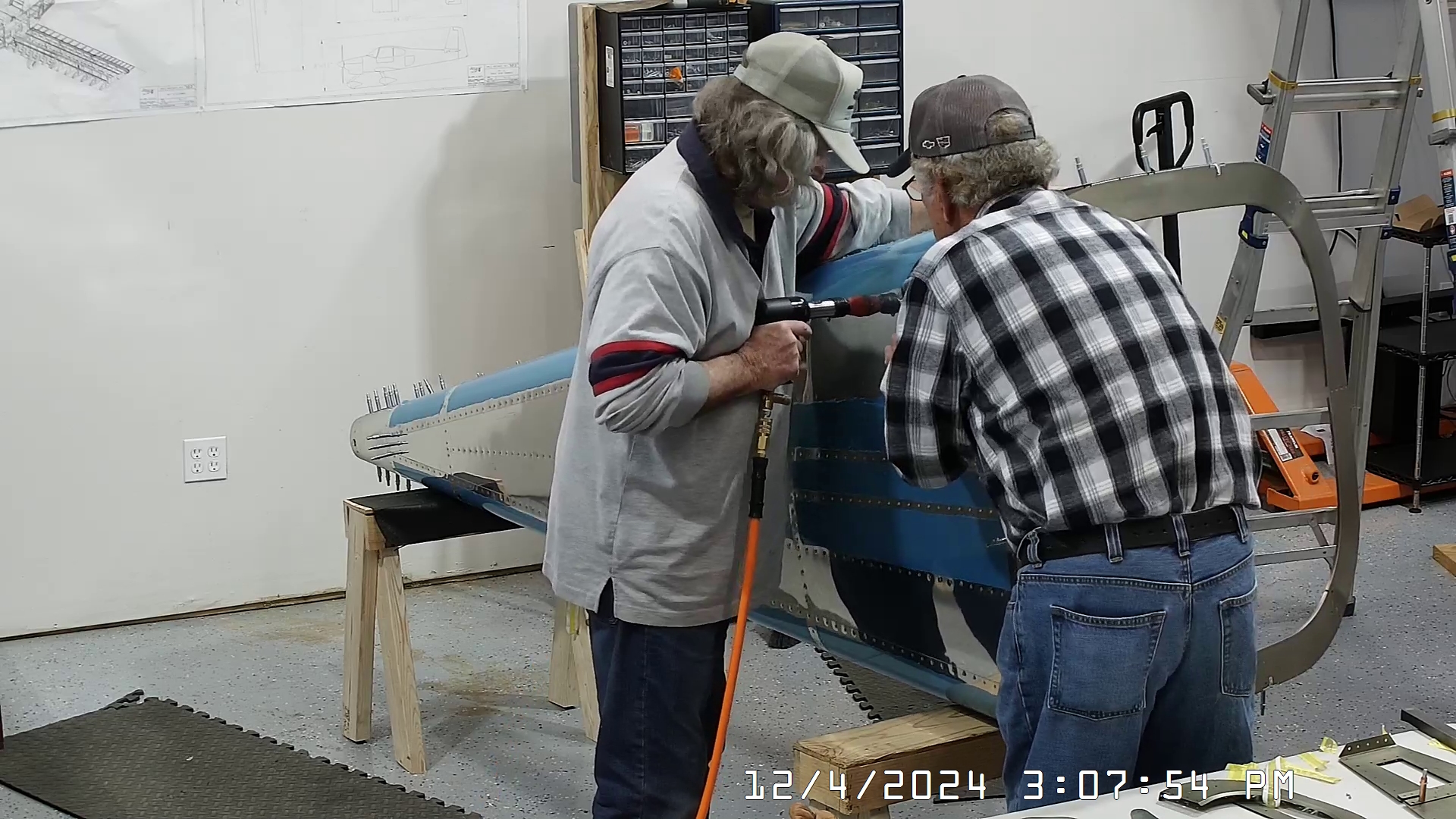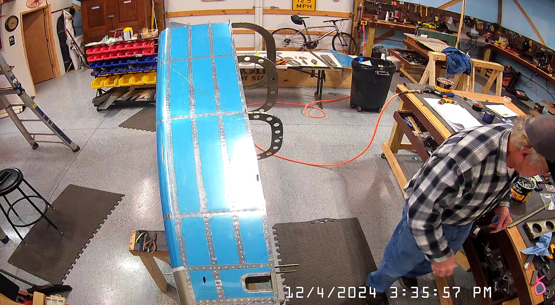 You will notice in some of the snapshots that we used the long bucking bar from Cleveland that is actually shaped for bucking inside spars at an angle. Using the end of the bar instead of the angled face pressed up against the rivet across the tailcone laid on its side made it a lot easier to buck.