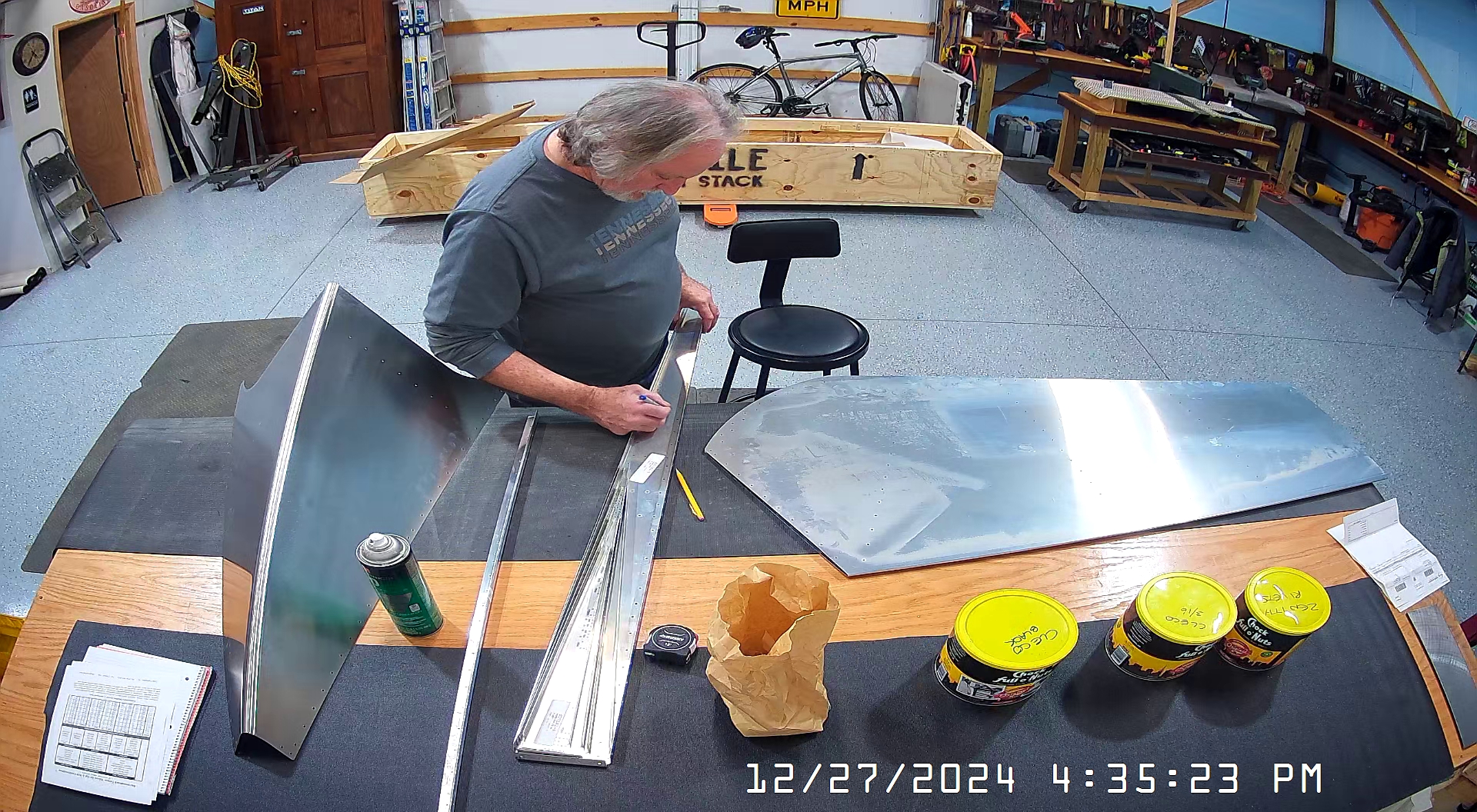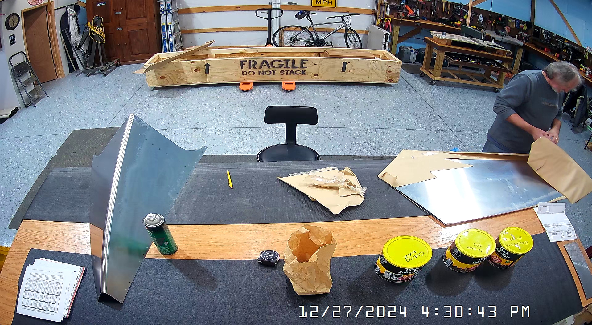 I just thought I would post a couple of snapshots of the re-organized workshop and cracking open the Zenith tail kit crate to extract the rudder assembly.